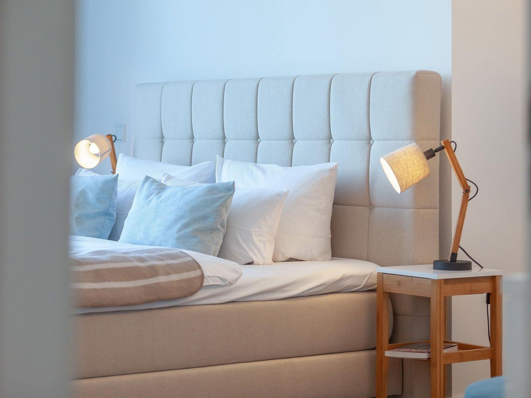 Das Schlafzimmer ist mit einem großzügigen Boxspringbett, zwei Nachtschränken mit Lampen und einem Kleiderschrank ausgestattet. Auch vom Bett aus haben Sie hier direkten Meerblick. Über eine Terrassentür im Schlafzimmer erreichen Sie den möblierten Balkon.