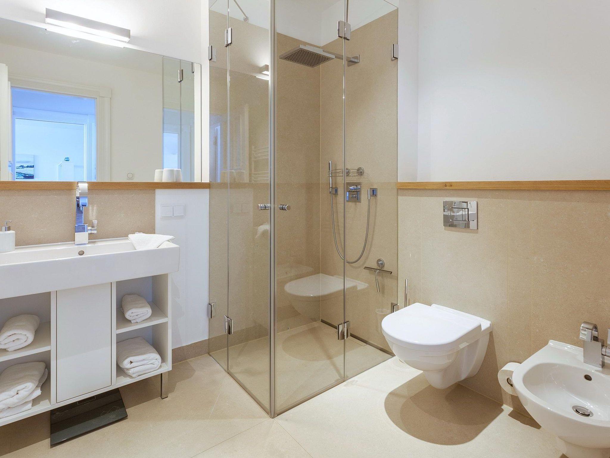Das Badezimmer besticht durch die hochwertigen Armaturen. Es steht Ihnen eine großzügige Dusche, ein Waschtisch mit Unterschrank, ein Bidet und ein WC zur Verfügung. Im Flur sowie in einem extra geräumigen Einbauschrank bieten sich weitere Abstellmöglichkeiten und eine Garderobe.