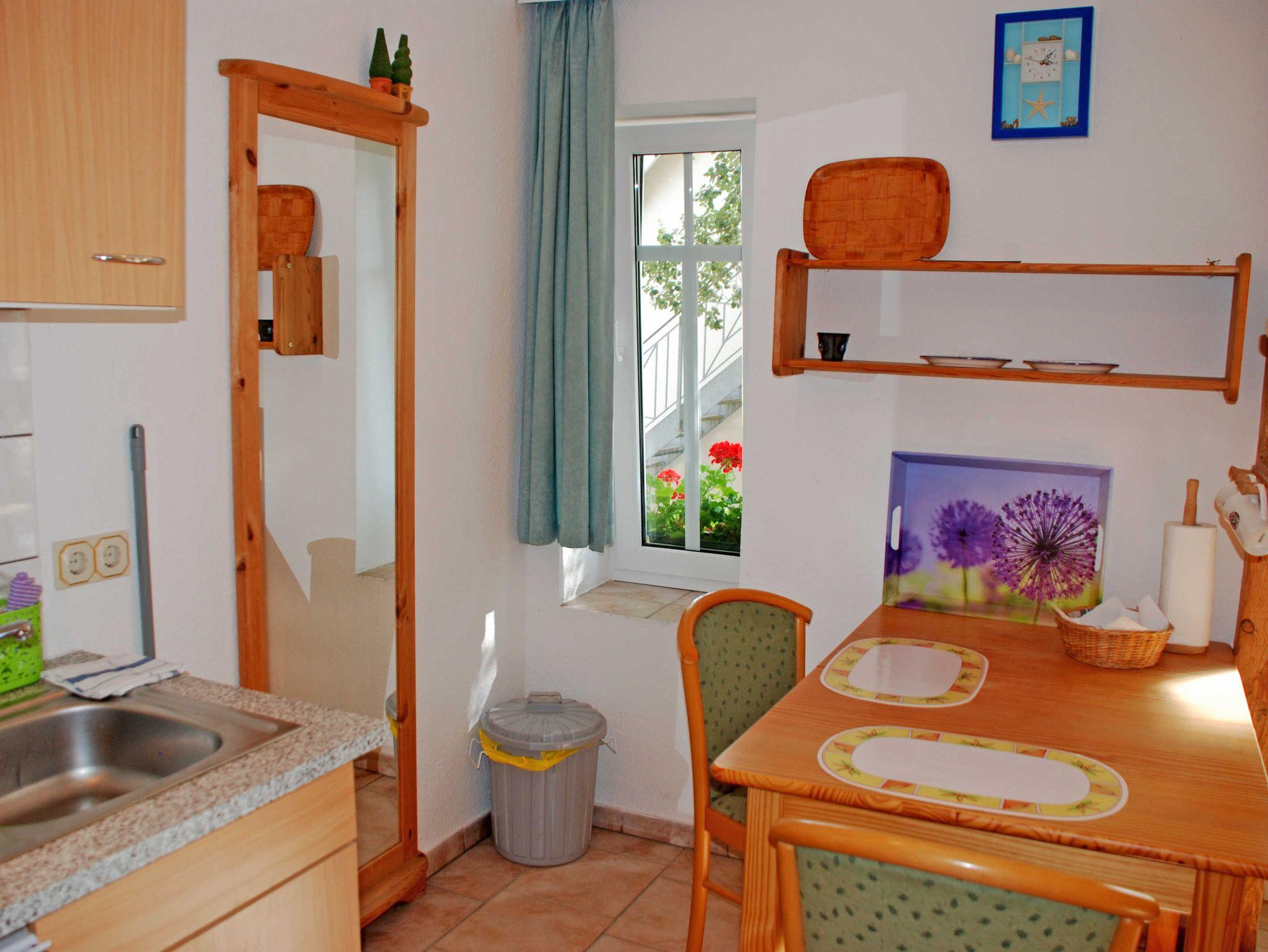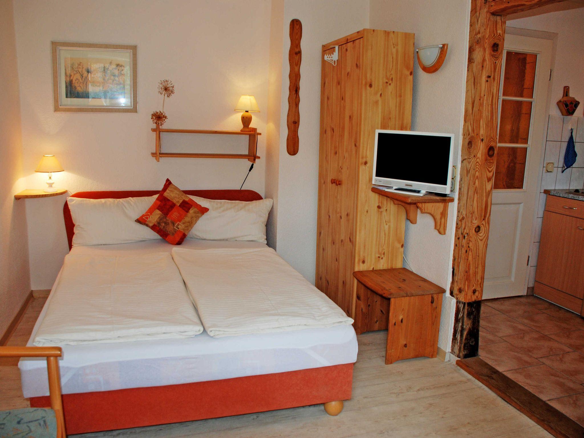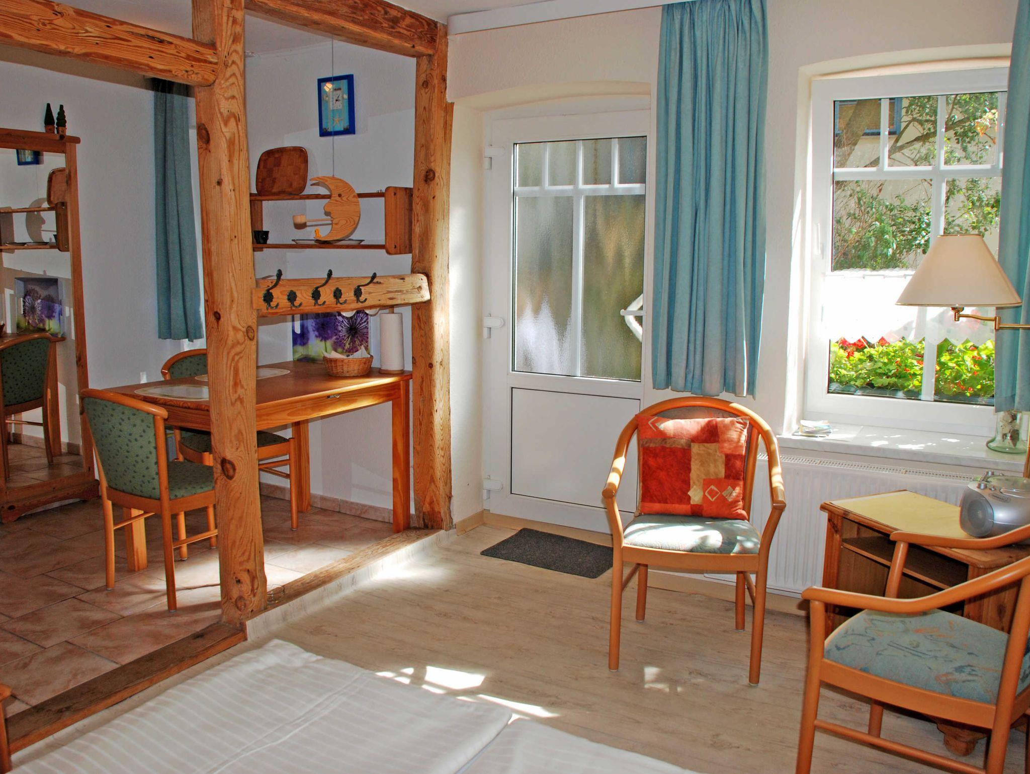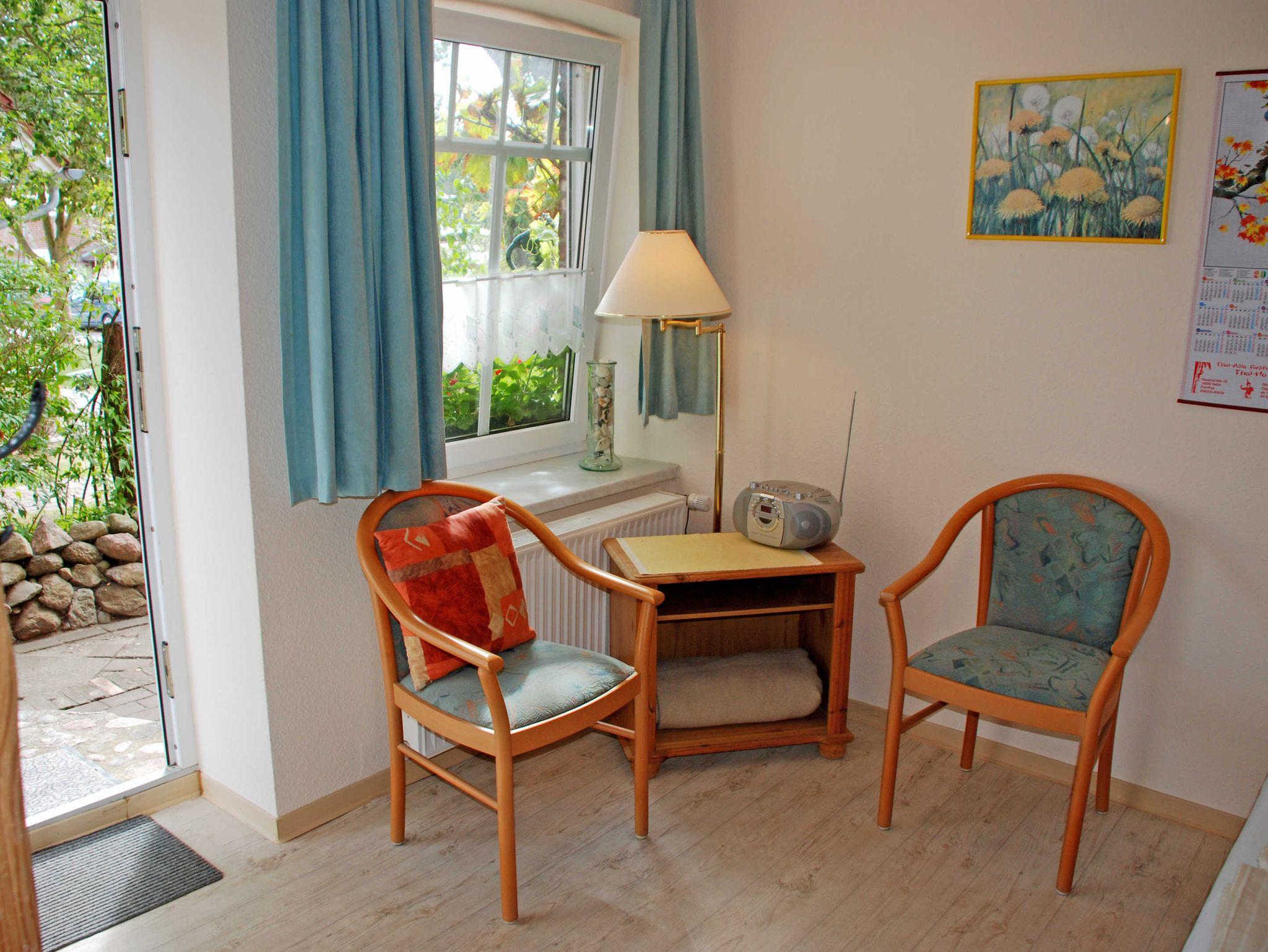 Das Appartement verfügt über einen separaten Eingang und eine eigene Terrasse mit Sitzmöbeln. Es ist modern ausgestattet und bietet einen kombinierten Wohn- und Schlafraum mit Doppelbett, Nachttischen und Leselampen, Sessel sowie TV und CD-Player. In der kleinen mit Fachwerk gestalteten Küche stehen ein Herd, Kühlschrank, Spüle, Kaffeemaschine, Wasserkocher und ein Esstisch mit Stühlen zur Verfügung. Das moderne Bad verfügt über Dusche, Waschbecken und WC.