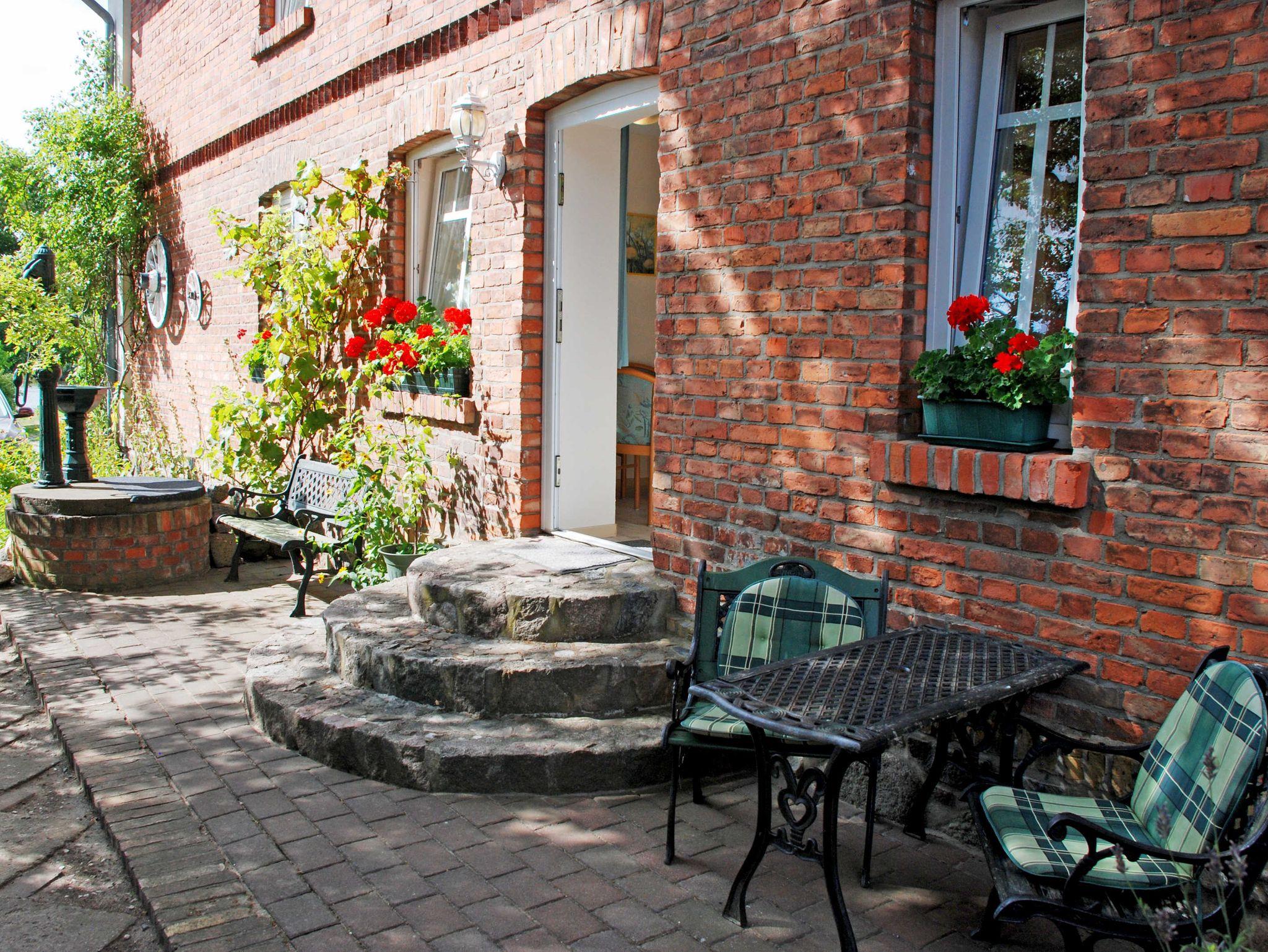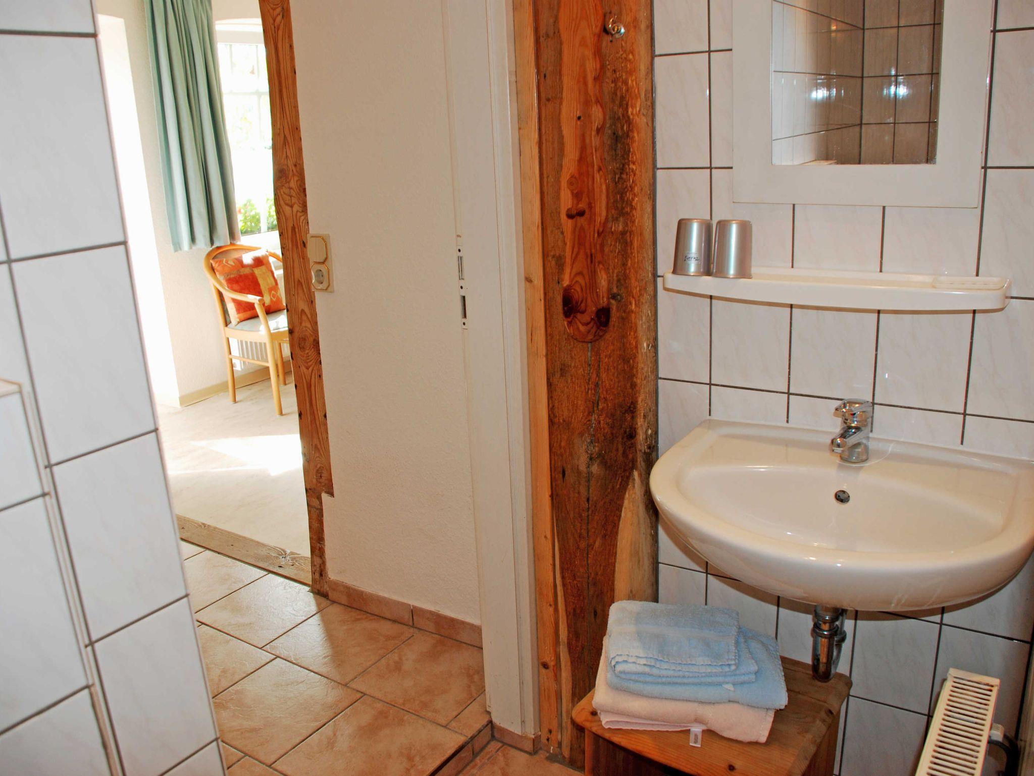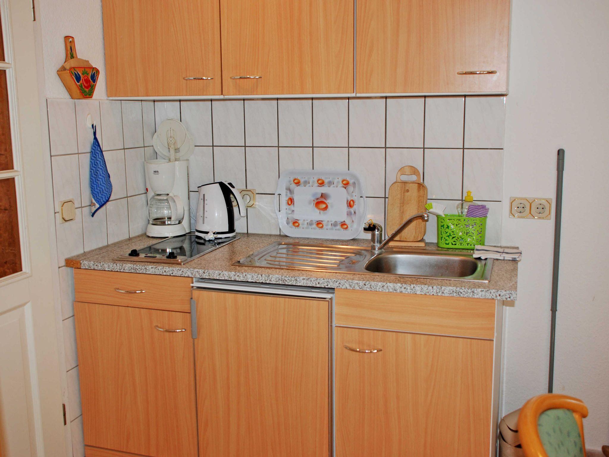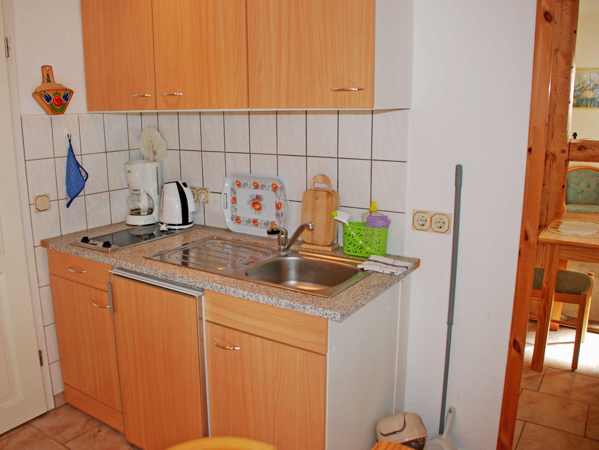 Das Appartement verfügt über einen separaten Eingang und eine eigene Terrasse mit Sitzmöbeln. Es ist modern ausgestattet und bietet einen kombinierten Wohn- und Schlafraum mit Doppelbett, Nachttischen und Leselampen, Sessel sowie TV und CD-Player. In der kleinen mit Fachwerk gestalteten Küche stehen ein Herd, Kühlschrank, Spüle, Kaffeemaschine, Wasserkocher und ein Esstisch mit Stühlen zur Verfügung. Das moderne Bad verfügt über Dusche, Waschbecken und WC.