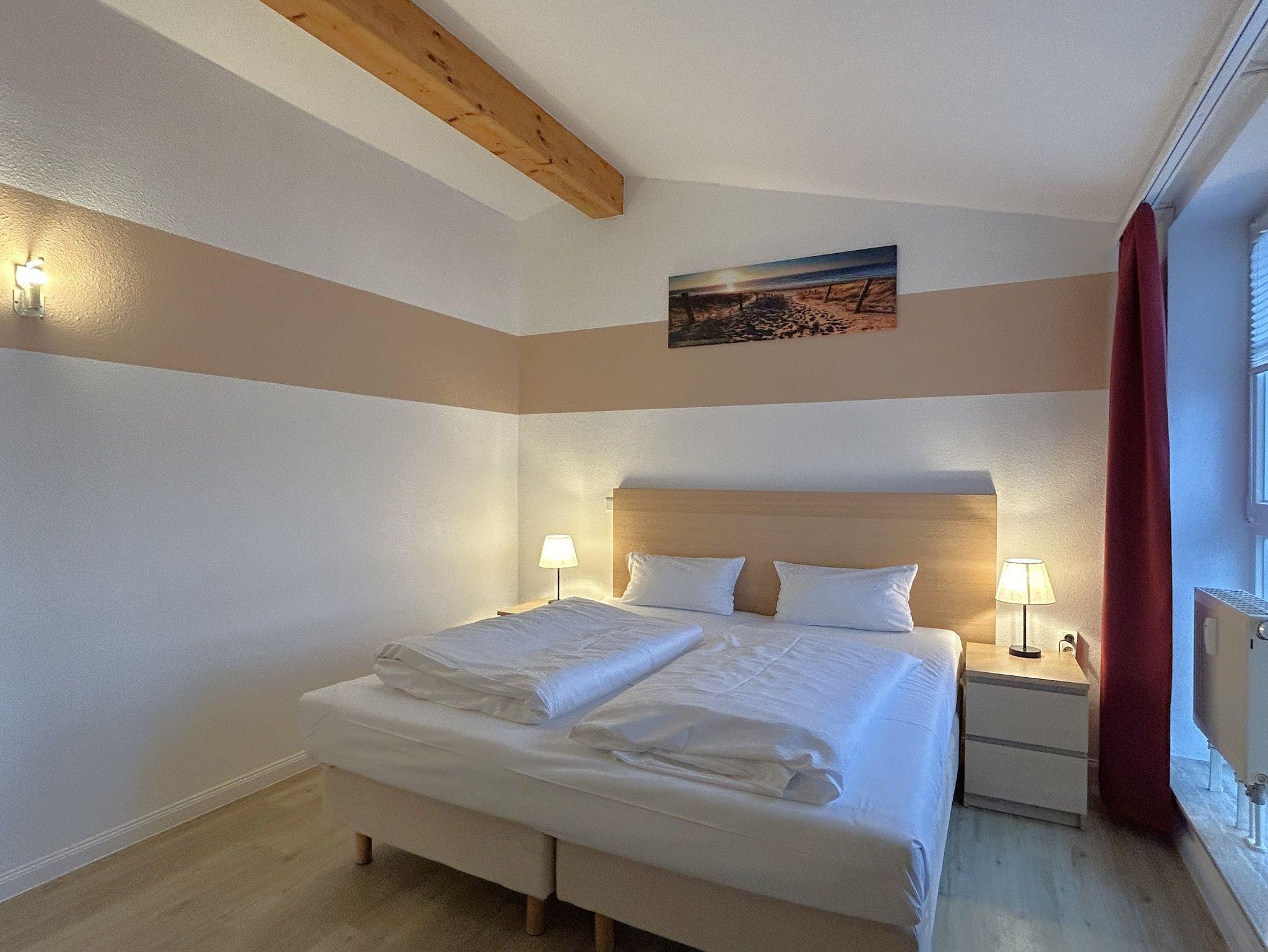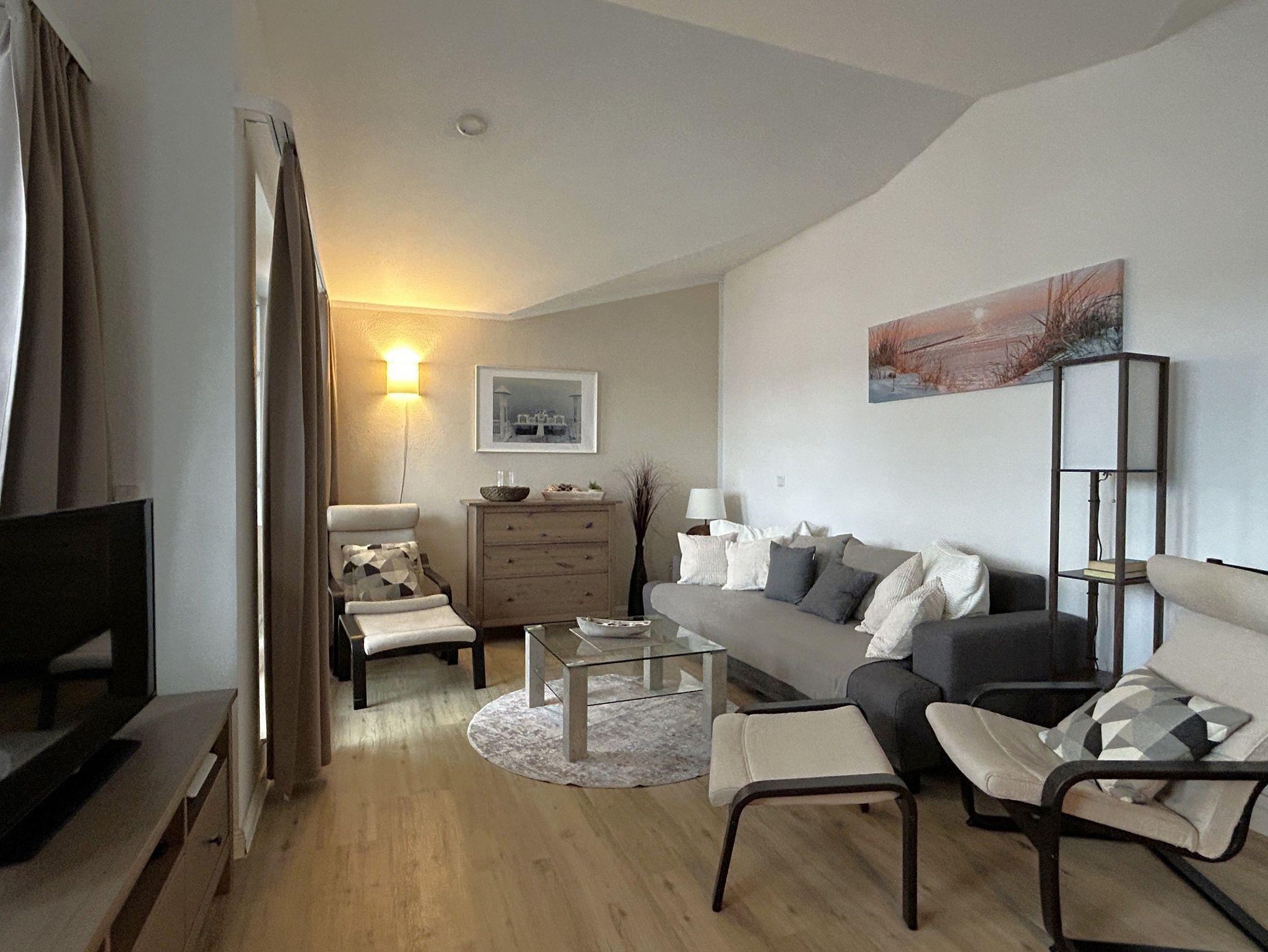 im Wohnzimmer befindet sich zusätzlich eine Doppelschlafcouch. Darüber hinaus verfügt die Ferienwohnung über ein Bad mit Badewanne/WC.