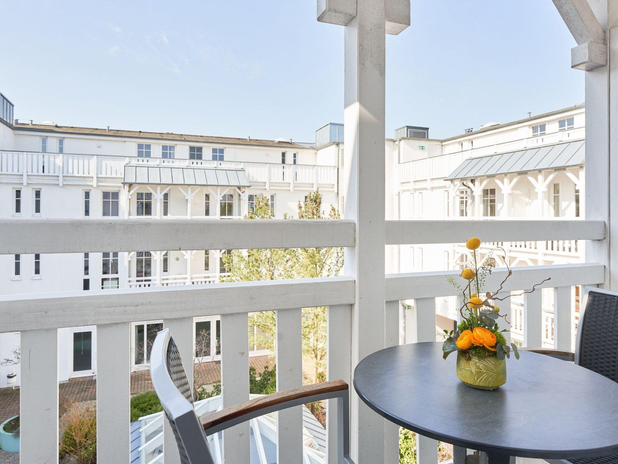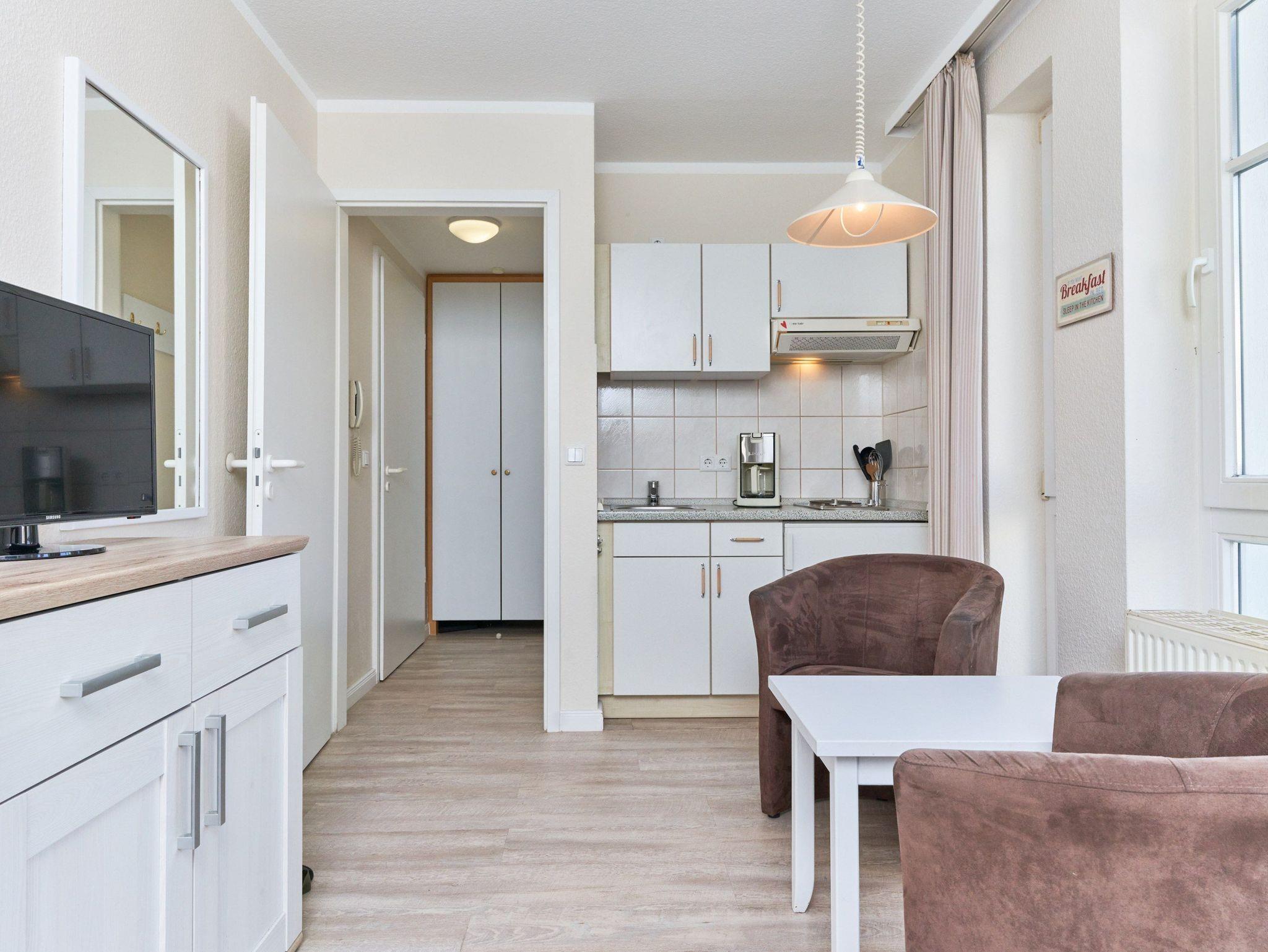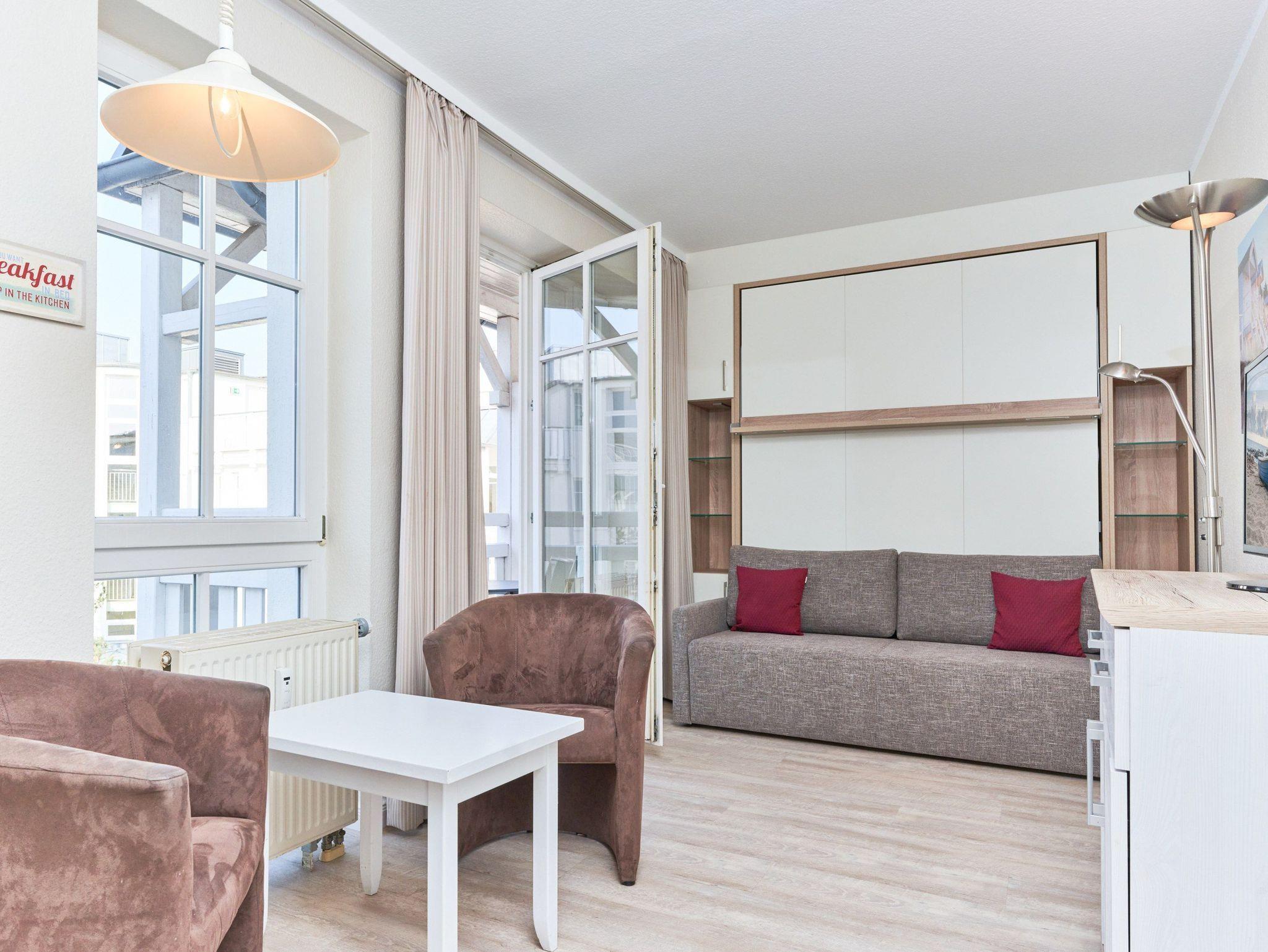 Kleine Ferienwohnung im Seepark Sellin mit Balkon, WLAN, Sky-TV und kostenfreiem Schwimmbadzugang, nahe Strand und Einkaufsmöglichkeiten.