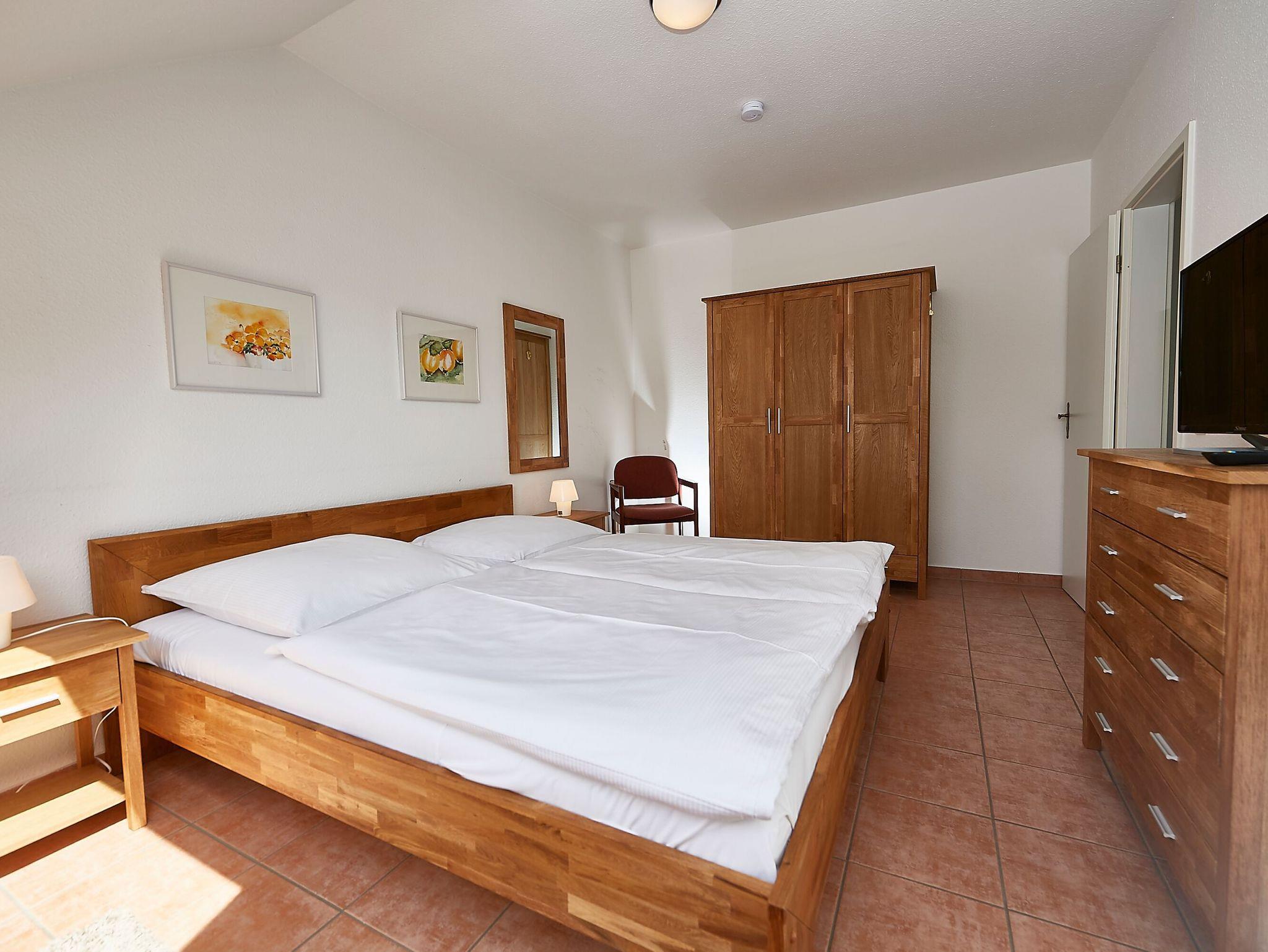 Im geräumigen Bad stehen Ihnen eine Badewanne mit kombinierter Dusche sowie eine Waschmaschine zur Verfügung. Im Schlafzimmer mit Doppelbett und großem Kleiderschrank haben Sie ausreichend Stauraum für Ihre Garderobe sowie einen weiteren Fernseher.