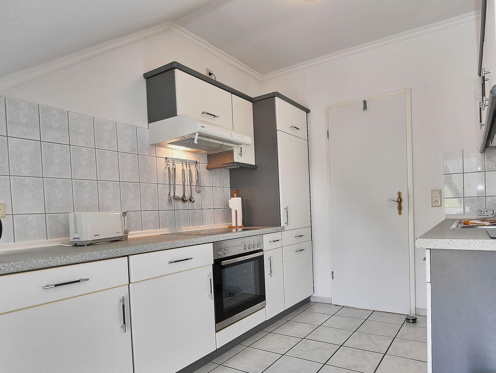 Die separate Küche ist mit einem Kühlschrank, einem 4-Platten-Ceranfeld, einer Spülmaschine, einem Backofen, Toaster, Wasserkocher, Kaffeemaschine und diversem Kleininventar gut ausgestattet.Bis zum nächsten Bäcker für die frischen Frühstücksbrötchen sind es nur knapp 100 Meter.