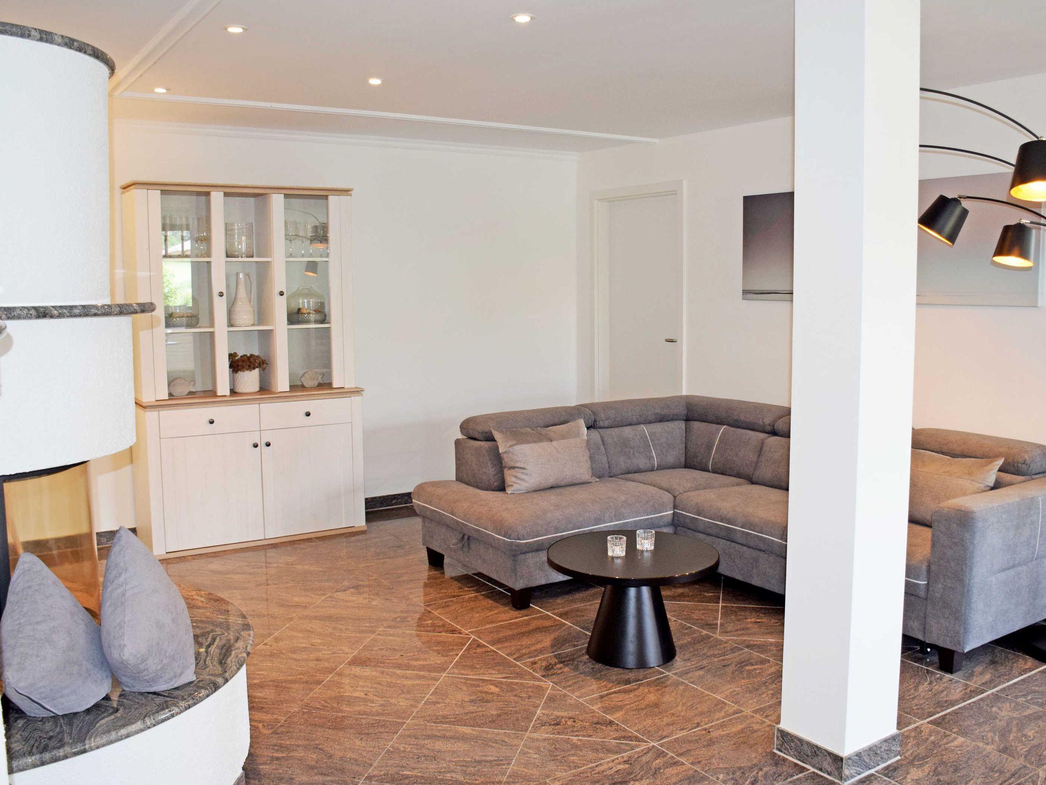 Im großzügigen Wohnraum mit großer Fensterfront und Zugang zur Terrasse, befinden sich zwei bequeme Sitzcouch mit Tisch und ein modernes Flachbild-TV-Gerät. Die moderne riesige Küchenzeile ist mit Geschirrspüler, Elektroherd mit Ceranfeld und Backofen, Mikrowelle, Kühlschrank mit Gefrierfach, Abzugshaube, Kaffeemaschine, Wasserkocher, Toaster und vieles mehr komplett ausgestattet. Ein großer Esstisch mit Stühlen im Wohnraum bietet 6 Personen ausreichend Platz
