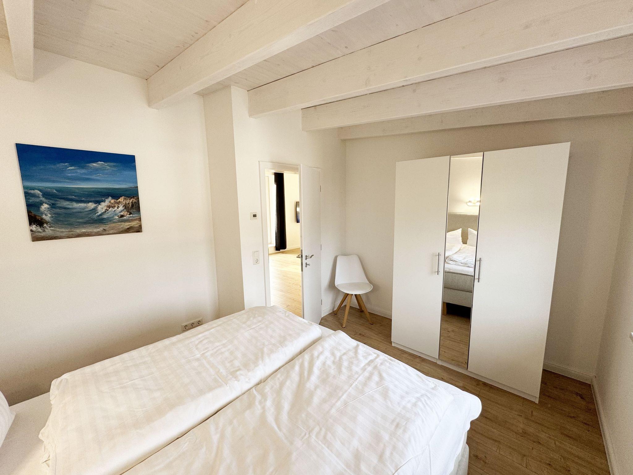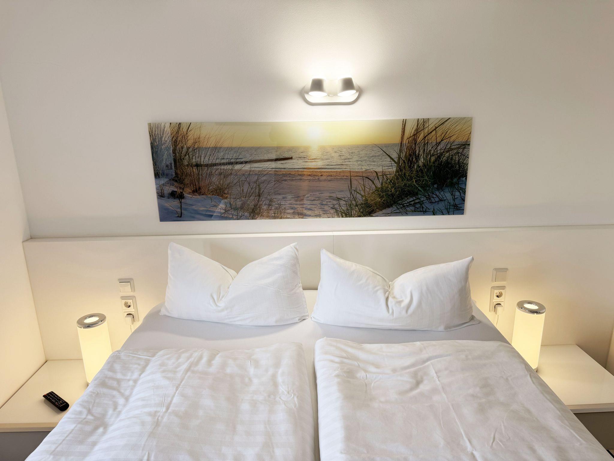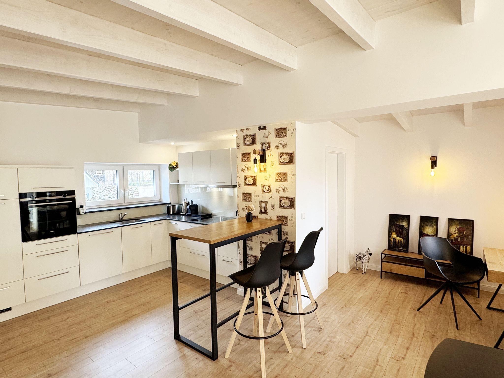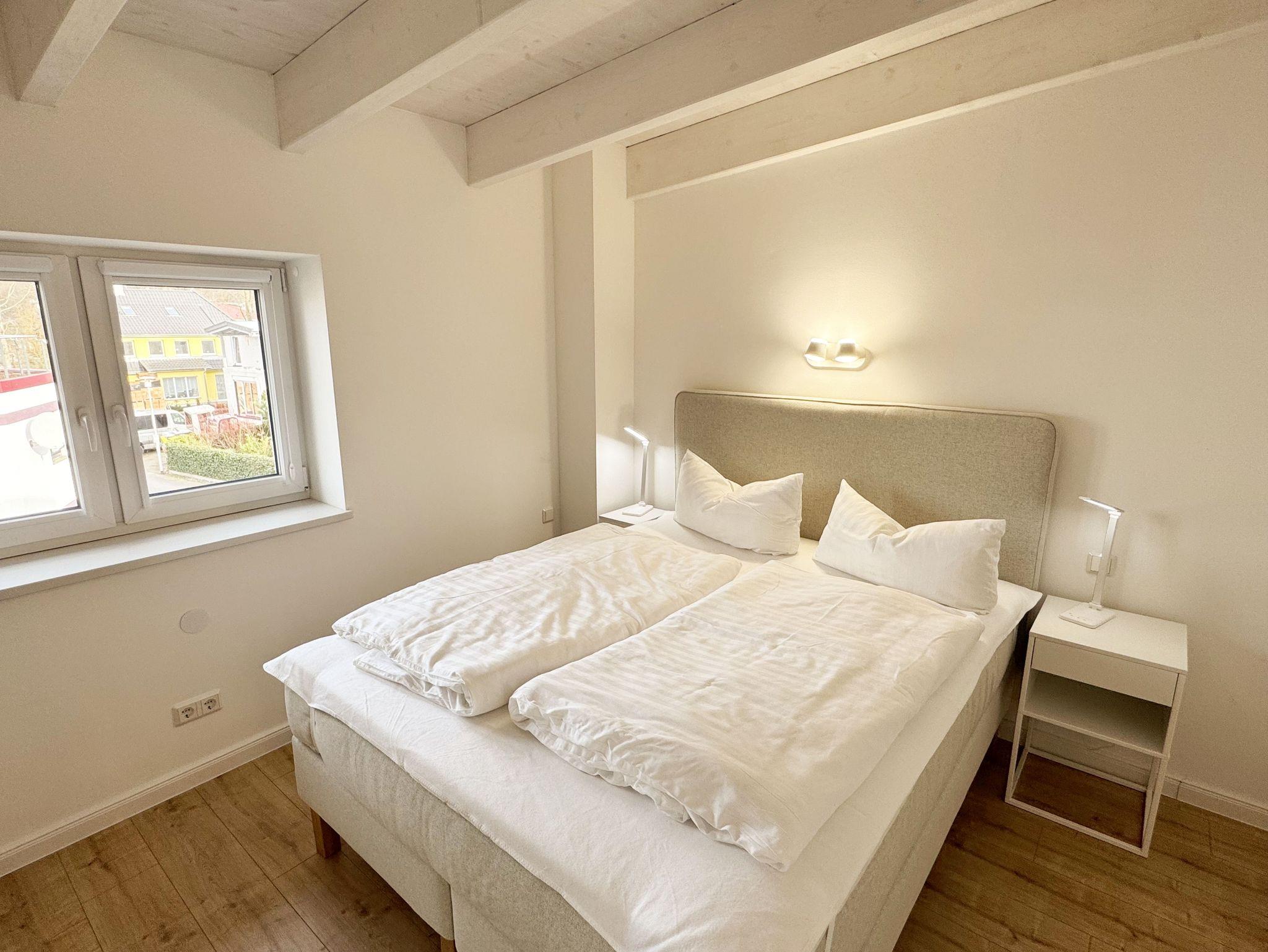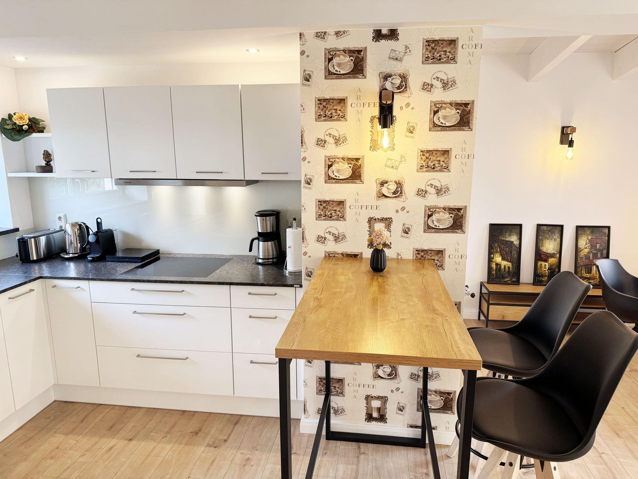 Die gemütlich und komfortable Nichtraucher-Ferienwohnung Ostseelauschen mit etwa 82 qm bietet Ihnen ausreichend Platz für max. 4 Personen. Sie befindet sich im Obergeschoss des Hauses und wurde 2024 fertiggestellt. Bei dem großzügigen, lichtdurchfluteten Wohn- und Essbereich mit bodentiefen Fensterelementen werden Sie sich wohlfühlen. Im Wohnbereich können Sie es sich auf einer Couch oder einem Ohrensessel bequem machen. Ein Schreibtisch innerhalb eines Bürobereichs mit Blick aus dem Fenster ermöglicht entspanntes Arbeiten mit einem eigenen Laptop. Auf dem 55 Zoll Smart TV in Full-HD-Qualität können Sie Ihre Lieblingssendungen anschauen. Der technische Bereich wird durch ein DAB-Radio abgerundet, welches Ihnen durch Ihr Smartphone Ihren Hörgenuss ermöglicht. Auf einen kostenfreien Internetanschluss (WLAN) müssen Sie in Ihrem Urlaub nicht verzichten sowie auch nicht auf einen Gas Kaminofen, der für Ihre Behaglichkeit an kühleren Tagen sorgt. Vom Wohn- und Essbereich (ca. 50 qm) gelangen Sie auf Ihren bestuhlten Balkon mit einer Süd-/ Westausrichtung. Die angrenzende moderne Küchenzeile bietet Ihnen einen Kühl- und Gefrierschrank, ein Cerankochfeld, einen Backofen, einen Geschirrspüler, eine Kaffeemaschine, eine Nespresso Maschine, einen Toaster, einen Wasserkocher, einen Handmixer sowie weitere alltägliche Küchenhelfer, womit das Zubereiten Ihres Lieblingsgerichtes ganz einfach und schnell möglich ist. Zum zusätzlichem Tresen Tisch passt sich ein gemütlicher Esstisch den Räumlichkeiten an. Beide Schlafzimmer betreten Sie vom Wohnbereich. Sie sind jeweils mit einem Boxspringbett (1,60m x 2,00m), Nachttischablagen mit Beleuchtung und einem Kleiderschrank ausgestattet. In einem der Schlafzimmer rundet ein Smart-TV die Ausstattung ab. Eine Dreifachverglasung bietet Ihnen einen erholsamen Schlaf. Das hochwertige Tageslichtbad ist ausgestattet mit einer bodentiefen Echt Glasdusche mit Regenfunktion, einer Badewanne, einem beheizbarem Handtuchtrockner, einem Waschtisch mit großem Wandspiegel, einem Kosmetikspiegel, einem WC, einem Regal sowie einem Fön. Alle Räumlichkeiten sind mit einer Fußbodenheizung ausgestattet. Ein zusätzlicher Abstellraum bietet Platz für Ihre Koffer, wo Sie unter anderem auch einen Wäscheständer, ein Bügelbrett mit Bügeleisen und einen Staubsauger finden. Haustiere sind nicht erlaubt. Ein PKW-Stellplatz befindet sich direkt am Haus.Die Erstausstattung eines Wäschepaketes (komplette Bettwäsche, 1 Duschhandtuch, 2 kleine Handtücher) können Sie bis 14 Tage vor der Anreise gegen einen Aufpreis dazu buchen oder durch eigenes Ergänzen. Ab 2 gebuchten Paketen erhalten Sie einmalig 1 Geschirrtuch und einen Duschvorleger dazu.