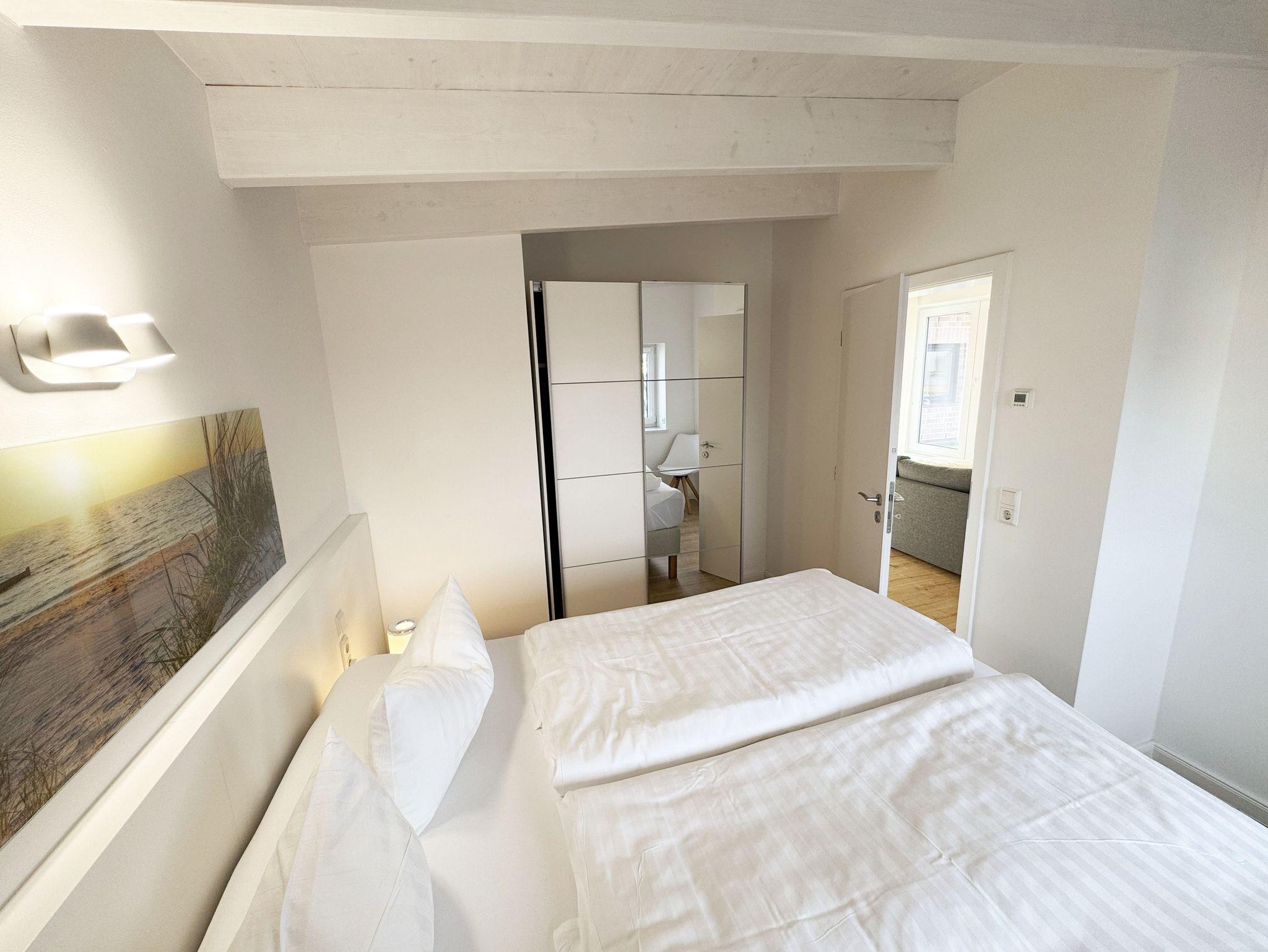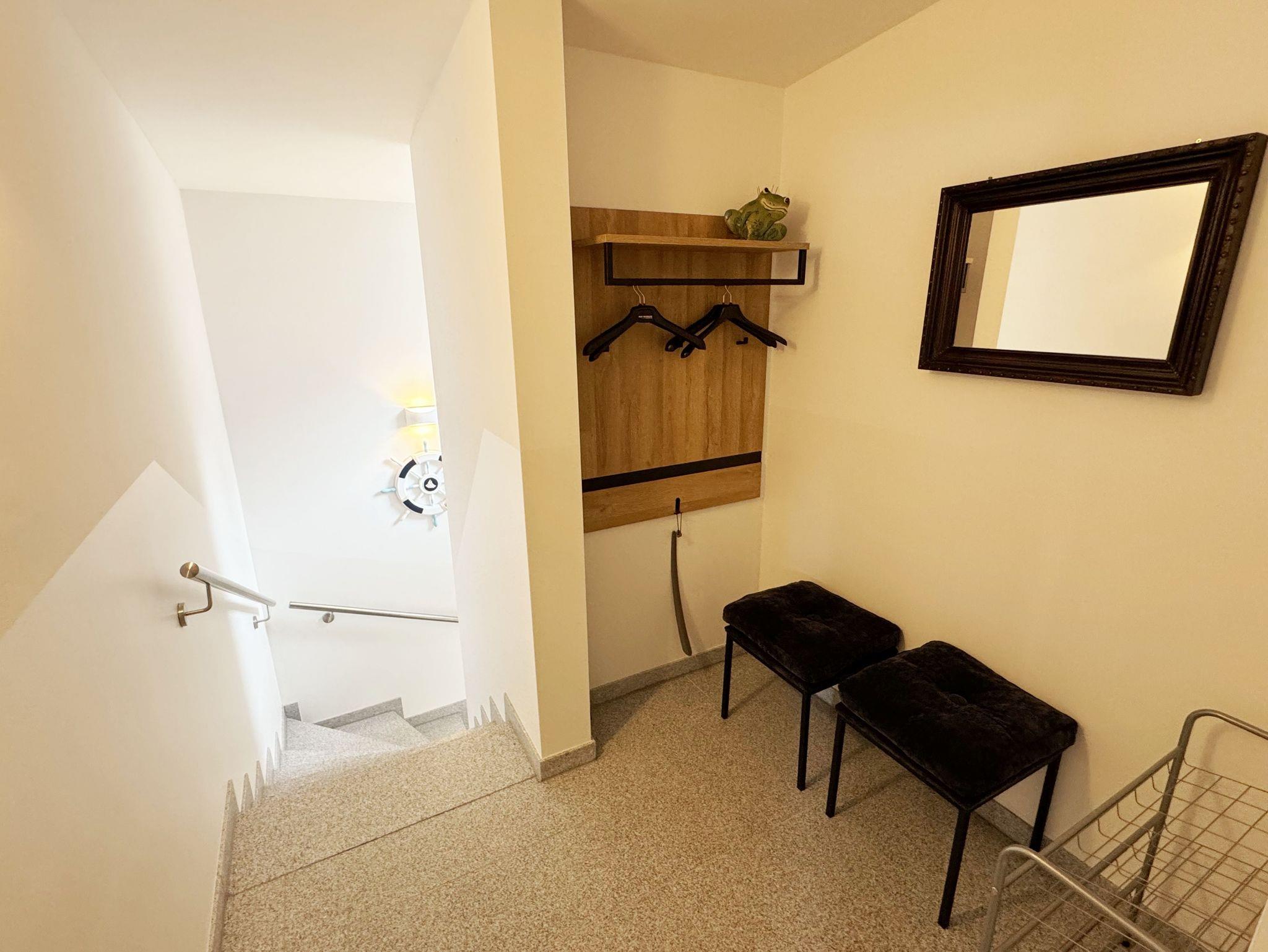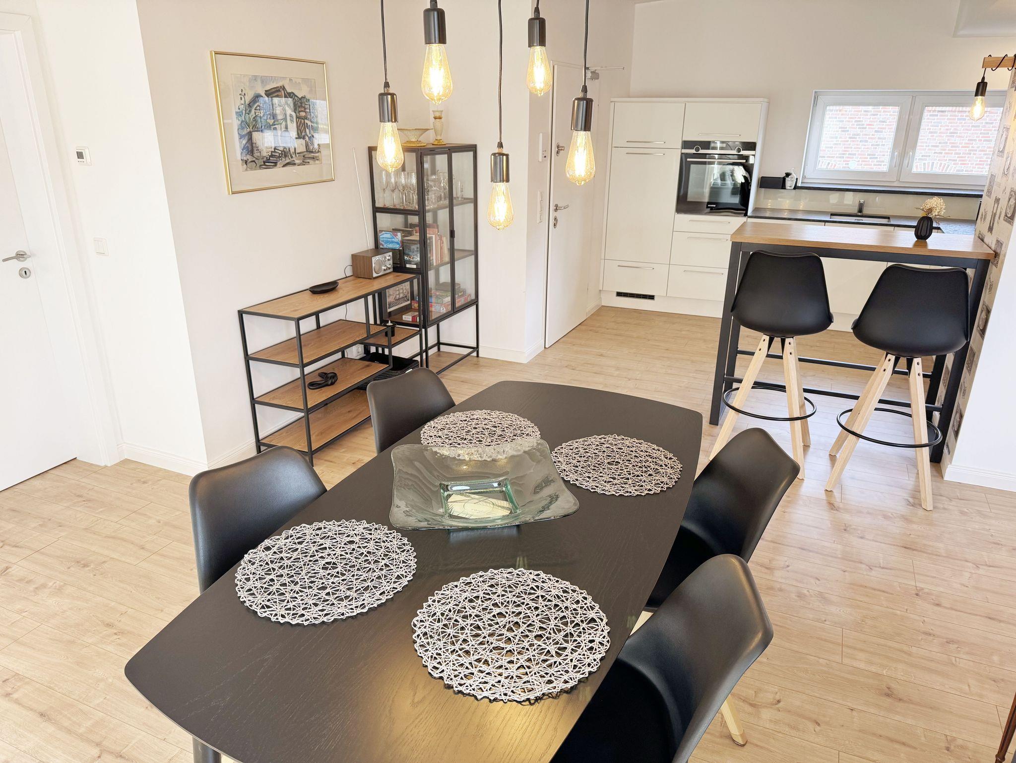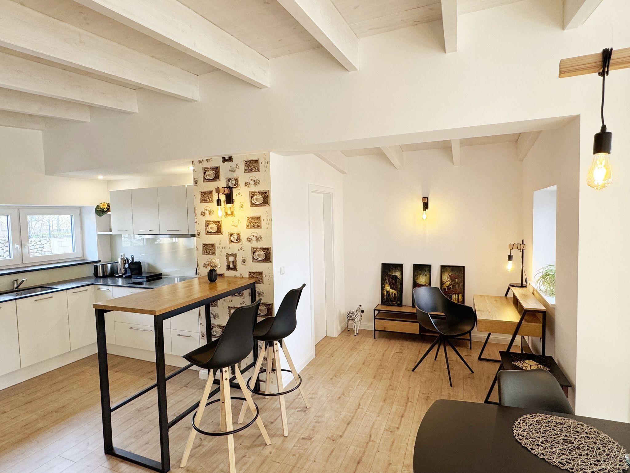 Die gemütlich und komfortable Nichtraucher-Ferienwohnung Ostseelauschen mit etwa 82 qm bietet Ihnen ausreichend Platz für max. 4 Personen. Sie befindet sich im Obergeschoss des Hauses und wurde 2024 fertiggestellt. Bei dem großzügigen, lichtdurchfluteten Wohn- und Essbereich mit bodentiefen Fensterelementen werden Sie sich wohlfühlen. Im Wohnbereich können Sie es sich auf einer Couch oder einem Ohrensessel bequem machen. Ein Schreibtisch innerhalb eines Bürobereichs mit Blick aus dem Fenster ermöglicht entspanntes Arbeiten mit einem eigenen Laptop. Auf dem 55 Zoll Smart TV in Full-HD-Qualität können Sie Ihre Lieblingssendungen anschauen. Der technische Bereich wird durch ein DAB-Radio abgerundet, welches Ihnen durch Ihr Smartphone Ihren Hörgenuss ermöglicht. Auf einen kostenfreien Internetanschluss (WLAN) müssen Sie in Ihrem Urlaub nicht verzichten sowie auch nicht auf einen Gas Kaminofen, der für Ihre Behaglichkeit an kühleren Tagen sorgt. Vom Wohn- und Essbereich (ca. 50 qm) gelangen Sie auf Ihren bestuhlten Balkon mit einer Süd-/ Westausrichtung. Die angrenzende moderne Küchenzeile bietet Ihnen einen Kühl- und Gefrierschrank, ein Cerankochfeld, einen Backofen, einen Geschirrspüler, eine Kaffeemaschine, eine Nespresso Maschine, einen Toaster, einen Wasserkocher, einen Handmixer sowie weitere alltägliche Küchenhelfer, womit das Zubereiten Ihres Lieblingsgerichtes ganz einfach und schnell möglich ist. Zum zusätzlichem Tresen Tisch passt sich ein gemütlicher Esstisch den Räumlichkeiten an. Beide Schlafzimmer betreten Sie vom Wohnbereich. Sie sind jeweils mit einem Boxspringbett (1,60m x 2,00m), Nachttischablagen mit Beleuchtung und einem Kleiderschrank ausgestattet. In einem der Schlafzimmer rundet ein Smart-TV die Ausstattung ab. Eine Dreifachverglasung bietet Ihnen einen erholsamen Schlaf. Das hochwertige Tageslichtbad ist ausgestattet mit einer bodentiefen Echt Glasdusche mit Regenfunktion, einer Badewanne, einem beheizbarem Handtuchtrockner, einem Waschtisch mit großem Wandspiegel, einem Kosmetikspiegel, einem WC, einem Regal sowie einem Fön. Alle Räumlichkeiten sind mit einer Fußbodenheizung ausgestattet. Ein zusätzlicher Abstellraum bietet Platz für Ihre Koffer, wo Sie unter anderem auch einen Wäscheständer, ein Bügelbrett mit Bügeleisen und einen Staubsauger finden. Haustiere sind nicht erlaubt. Ein PKW-Stellplatz befindet sich direkt am Haus.Die Erstausstattung eines Wäschepaketes (komplette Bettwäsche, 1 Duschhandtuch, 2 kleine Handtücher) können Sie bis 14 Tage vor der Anreise gegen einen Aufpreis dazu buchen oder durch eigenes Ergänzen. Ab 2 gebuchten Paketen erhalten Sie einmalig 1 Geschirrtuch und einen Duschvorleger dazu.
