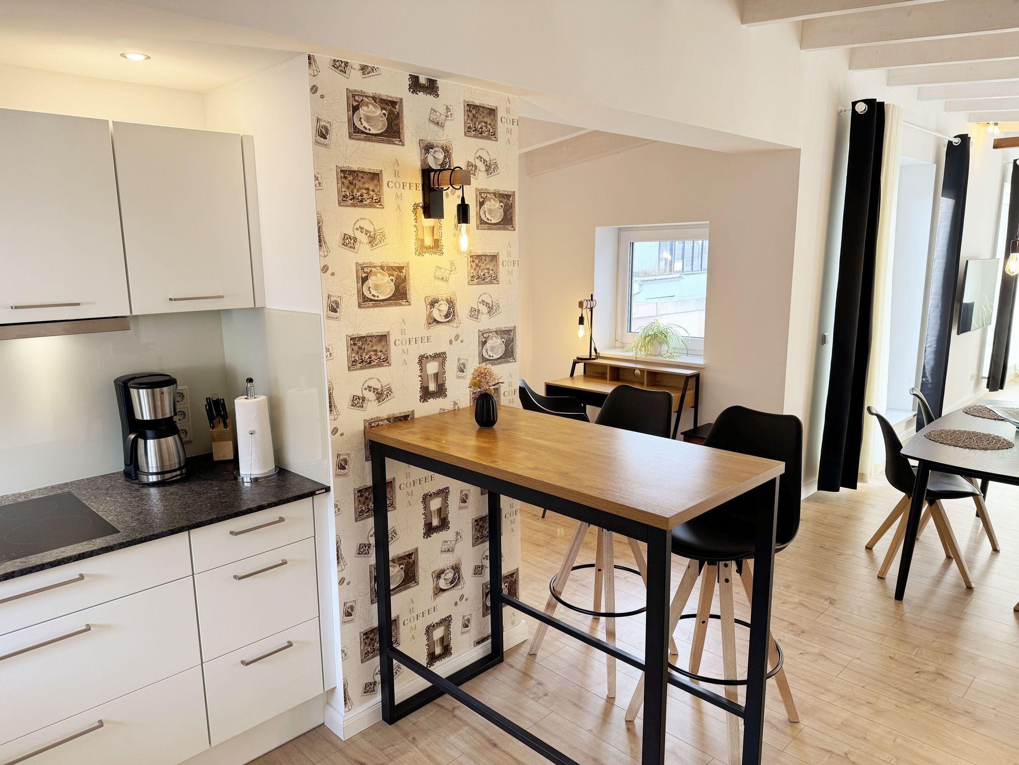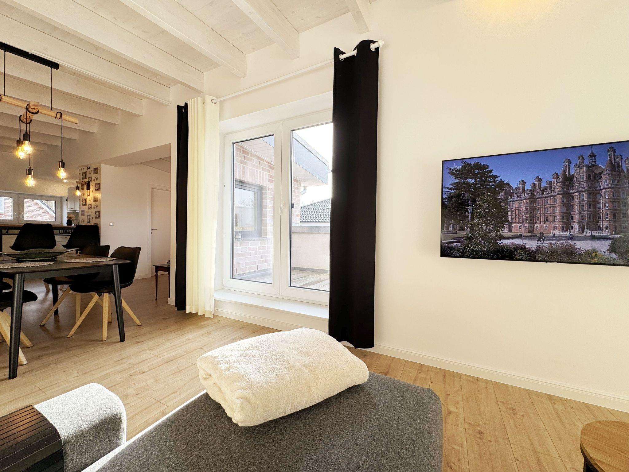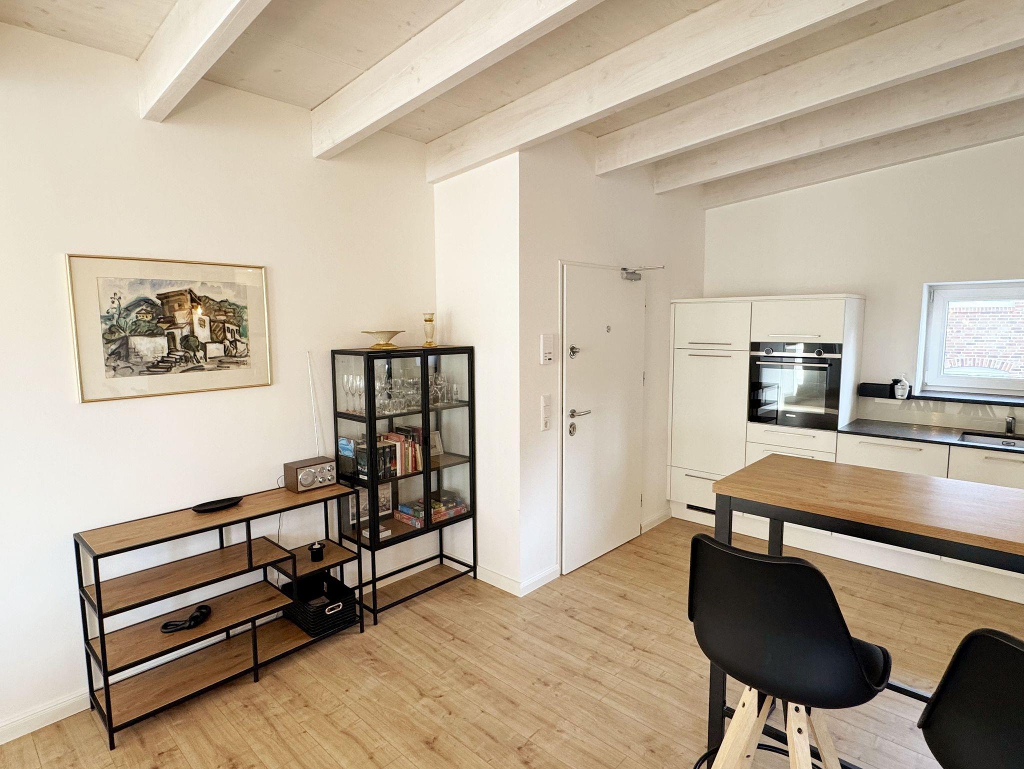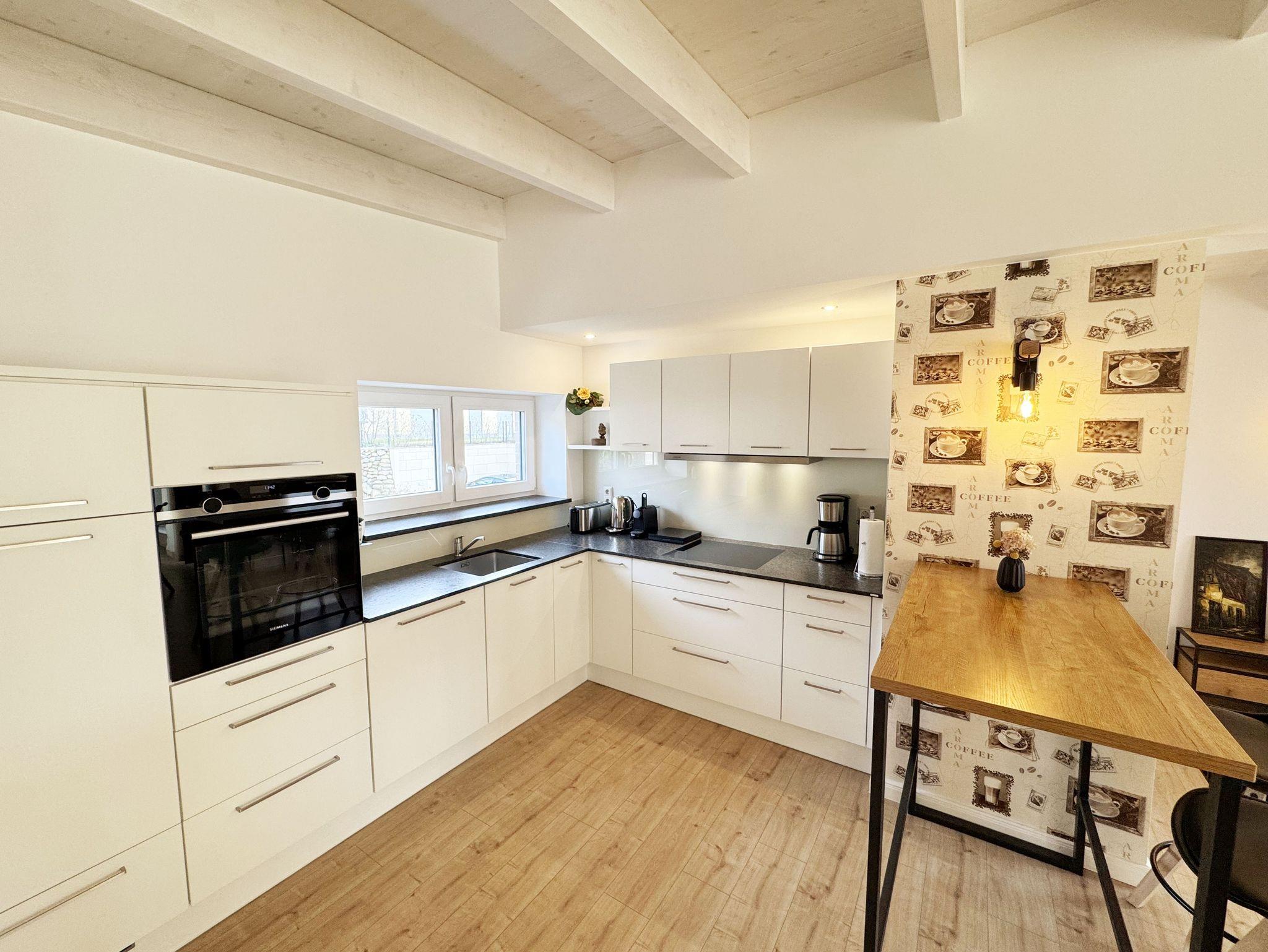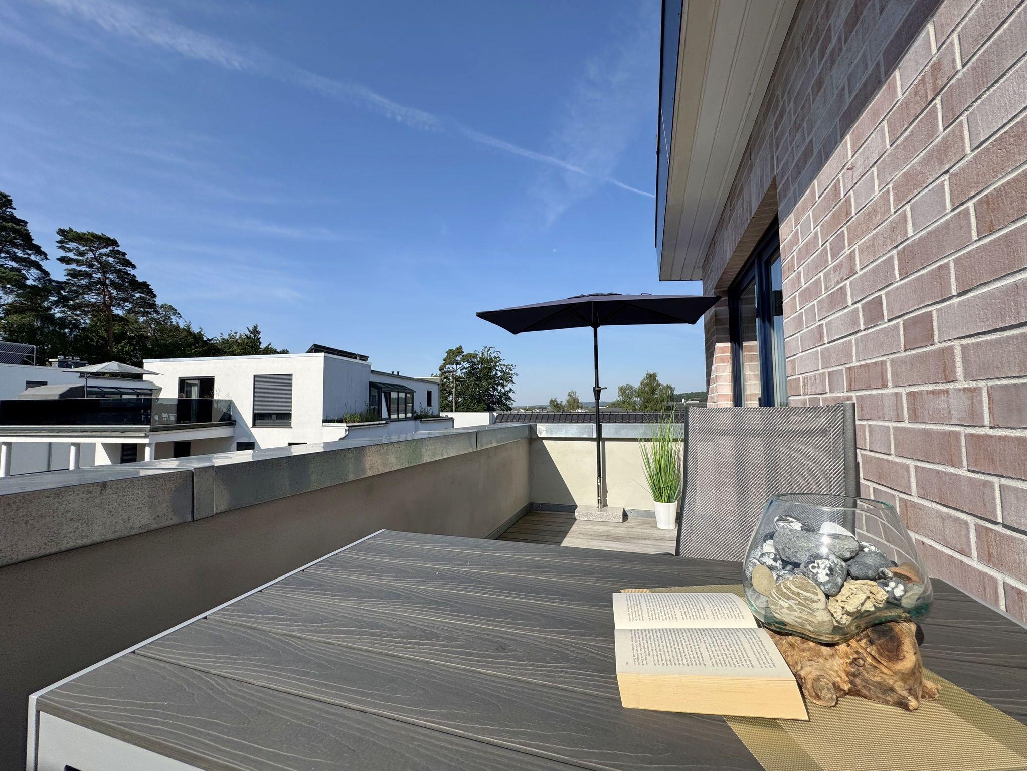 Die gemütlich und komfortable Nichtraucher-Ferienwohnung Ostseelauschen mit etwa 82 qm bietet Ihnen ausreichend Platz für max. 4 Personen. Sie befindet sich im Obergeschoss des Hauses und wurde 2024 fertiggestellt. Bei dem großzügigen, lichtdurchfluteten Wohn- und Essbereich mit bodentiefen Fensterelementen werden Sie sich wohlfühlen. Im Wohnbereich können Sie es sich auf einer Couch oder einem Ohrensessel bequem machen. Ein Schreibtisch innerhalb eines Bürobereichs mit Blick aus dem Fenster ermöglicht entspanntes Arbeiten mit einem eigenen Laptop. Auf dem 55 Zoll Smart TV in Full-HD-Qualität können Sie Ihre Lieblingssendungen anschauen. Der technische Bereich wird durch ein DAB-Radio abgerundet, welches Ihnen durch Ihr Smartphone Ihren Hörgenuss ermöglicht. Auf einen kostenfreien Internetanschluss (WLAN) müssen Sie in Ihrem Urlaub nicht verzichten sowie auch nicht auf einen Gas Kaminofen, der für Ihre Behaglichkeit an kühleren Tagen sorgt. Vom Wohn- und Essbereich (ca. 50 qm) gelangen Sie auf Ihren bestuhlten Balkon mit einer Süd-/ Westausrichtung. Die angrenzende moderne Küchenzeile bietet Ihnen einen Kühl- und Gefrierschrank, ein Cerankochfeld, einen Backofen, einen Geschirrspüler, eine Kaffeemaschine, eine Nespresso Maschine, einen Toaster, einen Wasserkocher, einen Handmixer sowie weitere alltägliche Küchenhelfer, womit das Zubereiten Ihres Lieblingsgerichtes ganz einfach und schnell möglich ist. Zum zusätzlichem Tresen Tisch passt sich ein gemütlicher Esstisch den Räumlichkeiten an. Beide Schlafzimmer betreten Sie vom Wohnbereich. Sie sind jeweils mit einem Boxspringbett (1,60m x 2,00m), Nachttischablagen mit Beleuchtung und einem Kleiderschrank ausgestattet. In einem der Schlafzimmer rundet ein Smart-TV die Ausstattung ab. Eine Dreifachverglasung bietet Ihnen einen erholsamen Schlaf. Das hochwertige Tageslichtbad ist ausgestattet mit einer bodentiefen Echt Glasdusche mit Regenfunktion, einer Badewanne, einem beheizbarem Handtuchtrockner, einem Waschtisch mit großem Wandspiegel, einem Kosmetikspiegel, einem WC, einem Regal sowie einem Fön. Alle Räumlichkeiten sind mit einer Fußbodenheizung ausgestattet. Ein zusätzlicher Abstellraum bietet Platz für Ihre Koffer, wo Sie unter anderem auch einen Wäscheständer, ein Bügelbrett mit Bügeleisen und einen Staubsauger finden. Haustiere sind nicht erlaubt. Ein PKW-Stellplatz befindet sich direkt am Haus.Die Erstausstattung eines Wäschepaketes (komplette Bettwäsche, 1 Duschhandtuch, 2 kleine Handtücher) können Sie bis 14 Tage vor der Anreise gegen einen Aufpreis dazu buchen oder durch eigenes Ergänzen. Ab 2 gebuchten Paketen erhalten Sie einmalig 1 Geschirrtuch und einen Duschvorleger dazu.