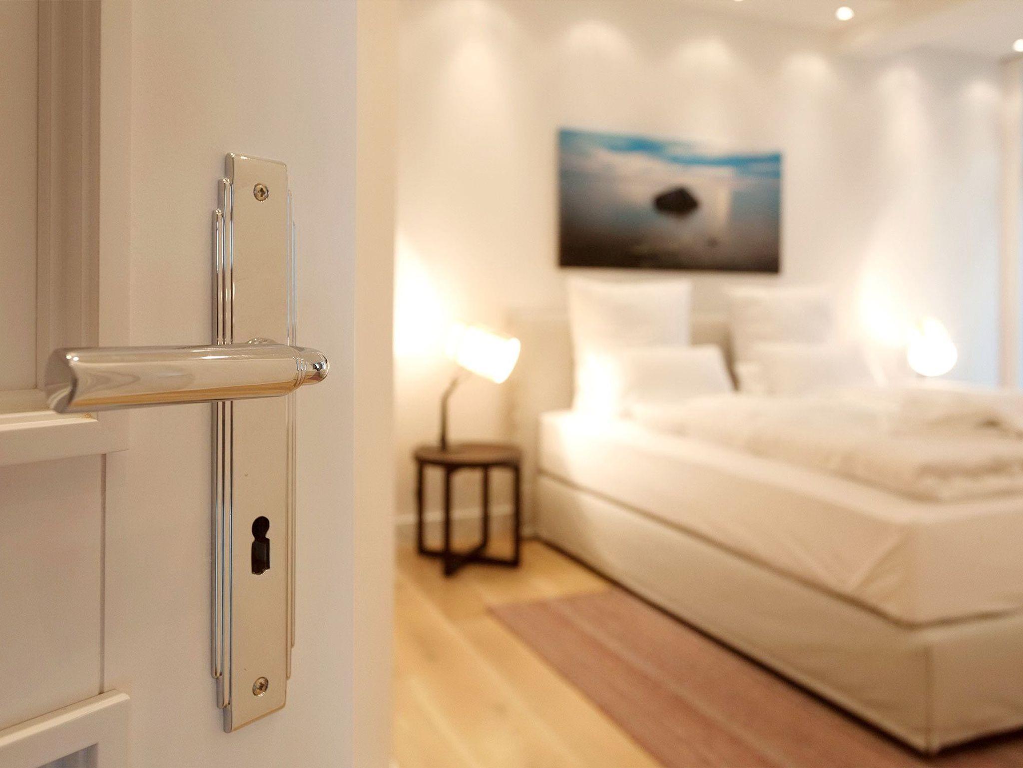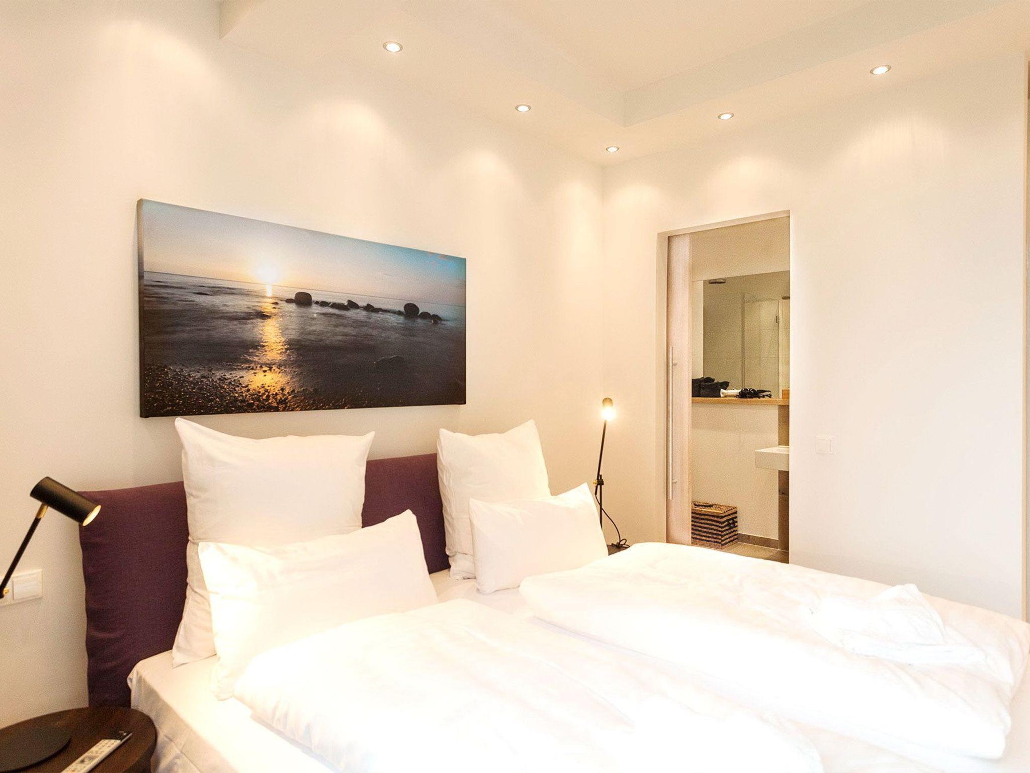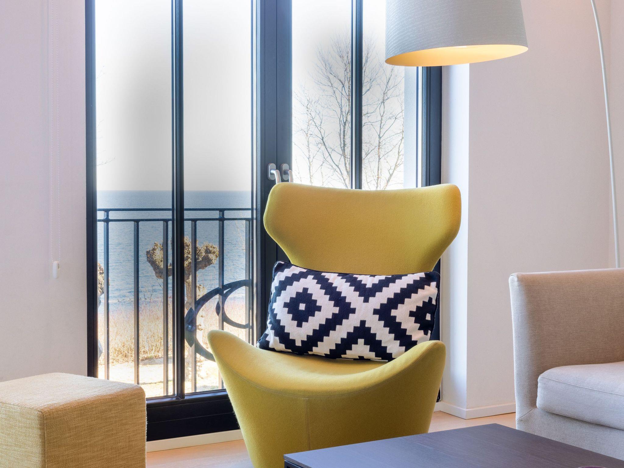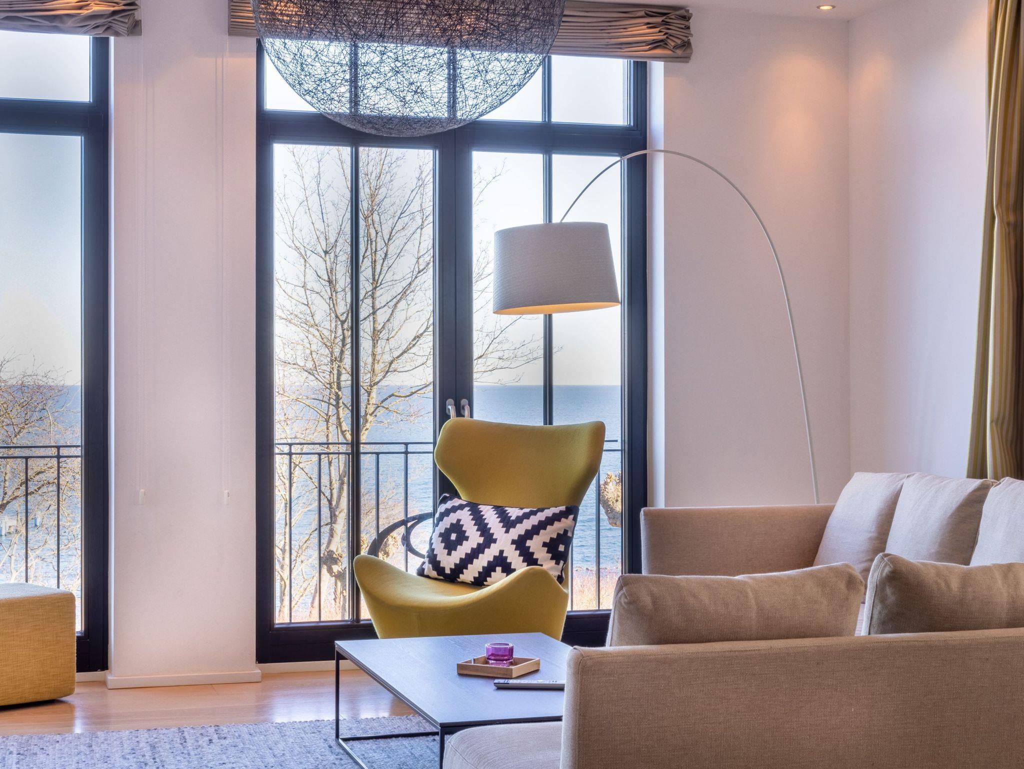 Ihr riesiger, fast 70 Quadratmeter großer Wohn- und Essbereich mit Terrassen befindet sich im ersten Obergeschoss der Villa Philine. Ob trautes Kuscheln vor dem Kaminfeuer, spannende Fernsehabende oder Duelle am wohnungseigenen Kickertisch, relaxter Musikgenuss oder genussvolles Kochen ? für all Ihre Wünsche und Ideen wurde vorgesorgt. All das natürlich begleitet vom immer wieder aufs Neue faszinierenden Blick aufs Meer. Ein paar Treppenstufen tiefer finden Sie Ihre drei Schlafzimmer mit bequemen Doppelbetten von SCHRAMM, Loewe-TV und angeschlossenen Ensuite-Bädern, ausgestattet mit edlen Manufakturfliesen aus Naturstein, feinster Keramik sowie ebenerdigen Duschen bzw. Badewanne. Im Erdgeschoss befindet sich zudem Ihre private Sauna, in der Sie sich nach einem erlebnisreichen Tag auf der Insel Rügen entspannen und wärmen können.