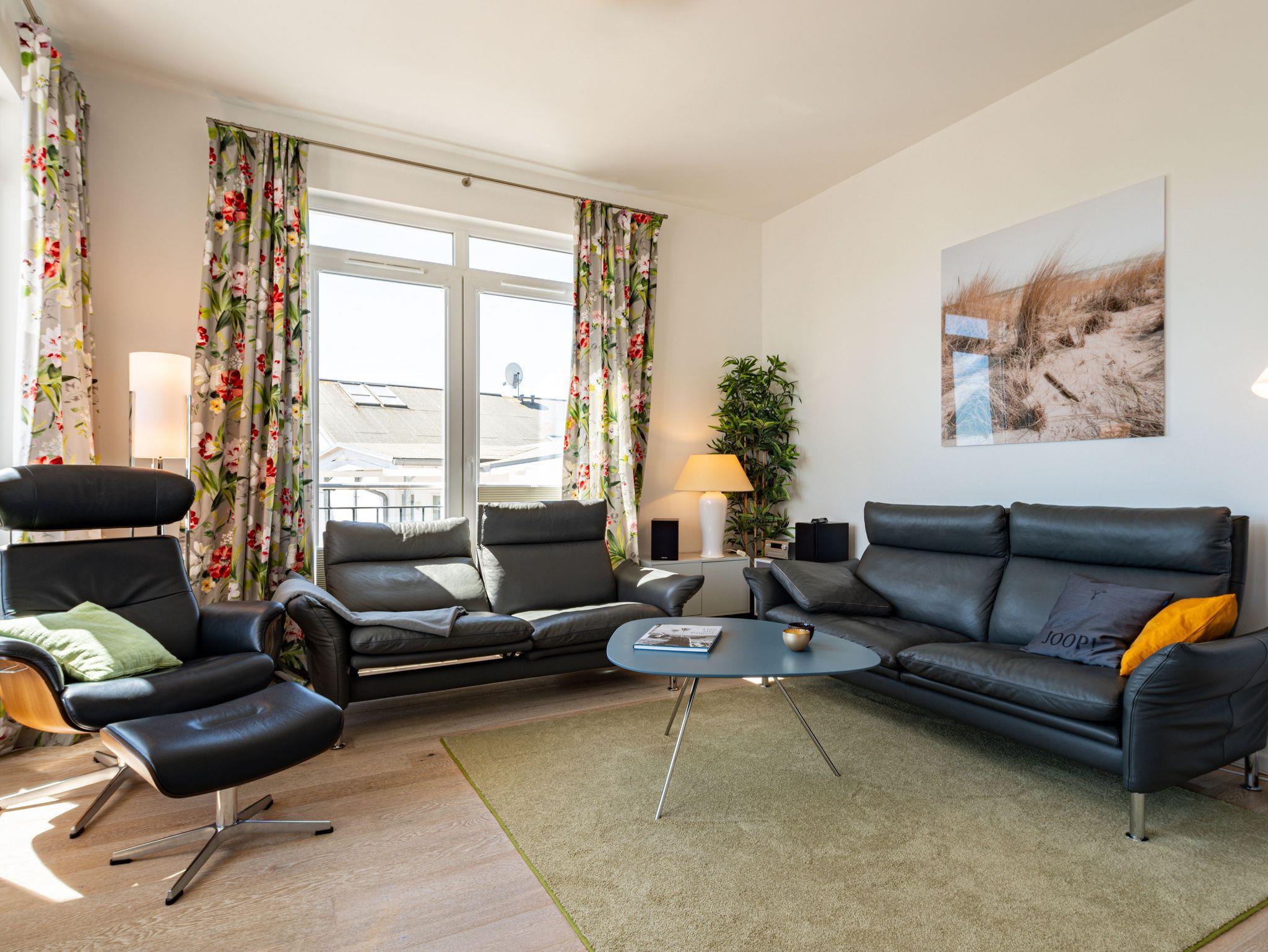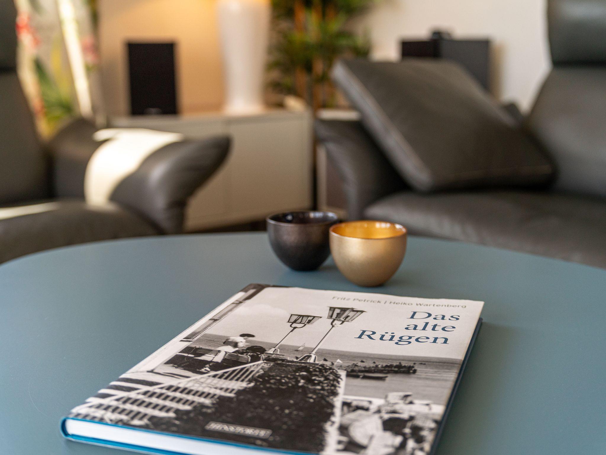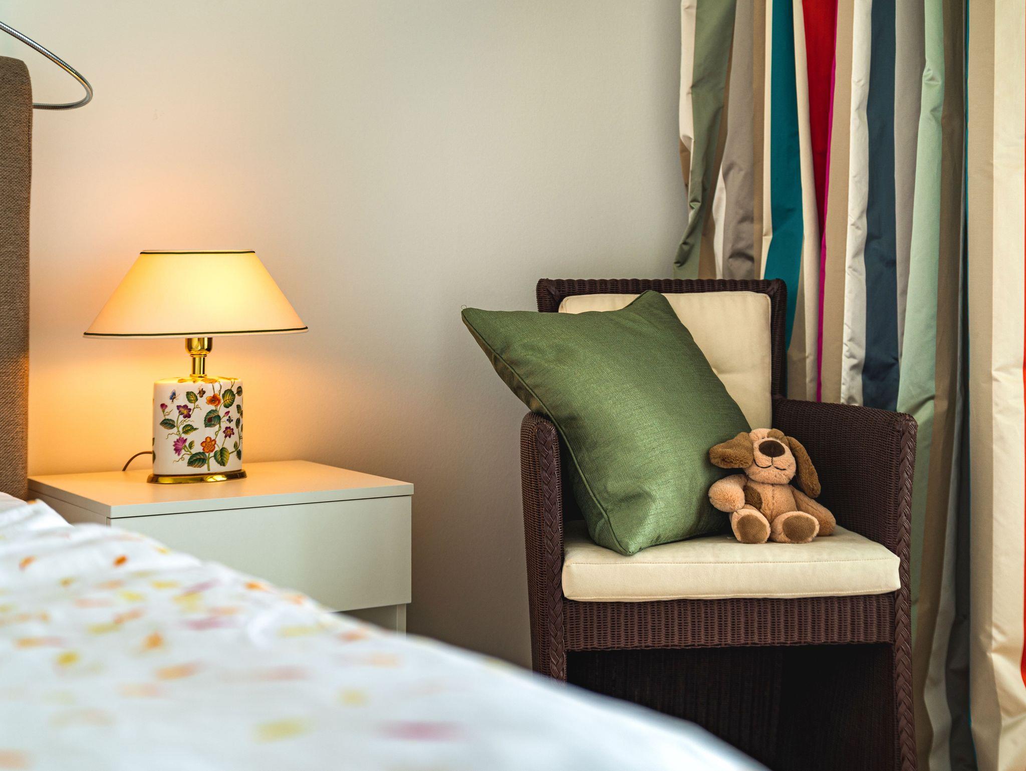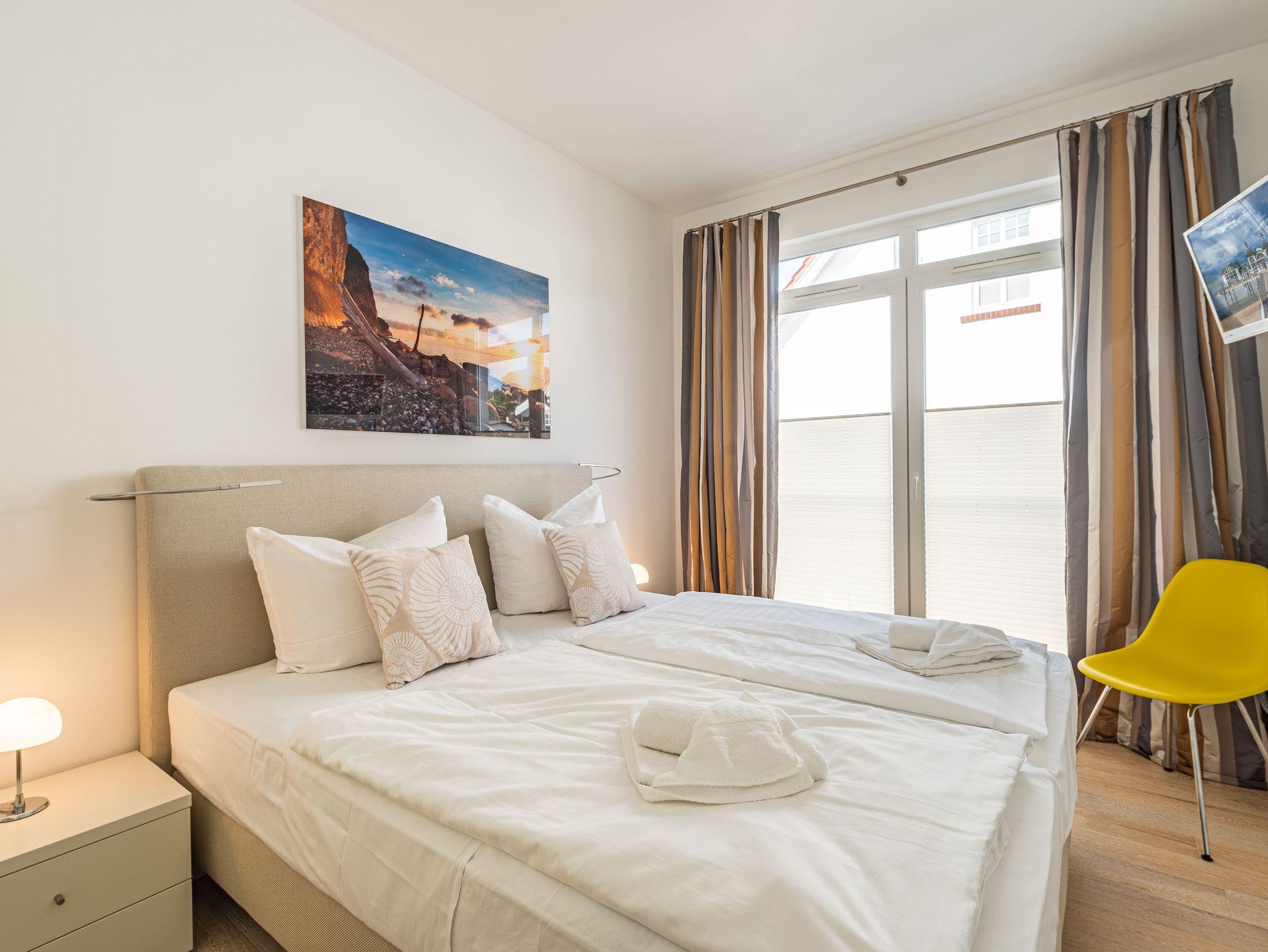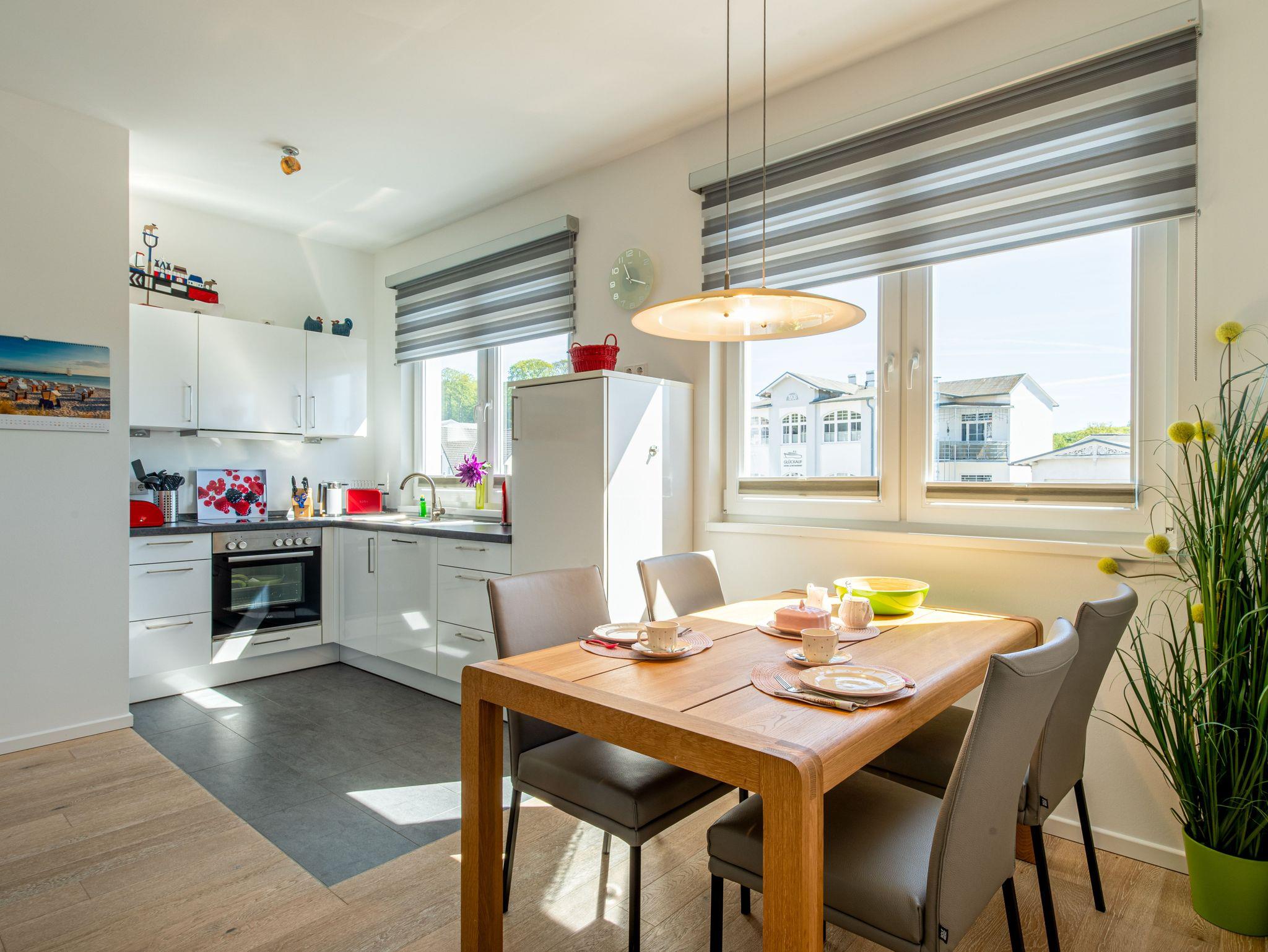 Seit 2016 erwarten Sie im Appartement WILHELMINE auf rund 79 m² Wohnfläche für max. 2 bis 3 Erwachsene + 1 Kleinkind bis 3 Jahre im Kinderreisebett, nicht nur drei liebevoll eingerichtete Zimmer, sondern gleich zwei möblierte Balkone mit herrlichem Blick auf die Linden-gesäumte Wilhelmstraße sowie auf das Hügelland rund um den Selliner See. Die modern und stilvoll eingerichtete Nichtraucher-Ferienwohnung überzeugt durch ihre klare Aufteilung sowie helles und hochwertiges Mobiliar. Im Wohnbereich laden 2 elegante Ledersofas, eine Leselampe, ein Couchtisch, ein Leder-Loungesessel mit Fußhocker zum Entspannen ein, während man ein gutes Buch liest oder einfach nur die Ruhe des Urlaubs genießt. Eine kleine Auswahl an Lektüre steht Ihnen zur Verfügung. Ein 48-Zoll-Smart-TV, Blu-Ray Player eine Mini-Stereoanlage mit CD-Player sowie kostenfreies WLAN sorgen für Unterhaltung. Die angrenzende Küchenzeile, ausgestattet mit Cerankochfeld, Backofen, Kühlschrank mit Gefrierfach, Spülmaschine, Kaffeemaschine, Espressokocher, Toaster, Wasserkocher sowie umfangreiche Küchenutensilien, macht Lust mal wieder den eigenen Kochkünsten freien Lauf zulassen. Ein großer Esstisch ergänzt die Ausstattung. Das 1. Schlafzimmer ist mit einem Hülsta Boxspringbett (1,80m x 2,00m), einem Kleiderschrank, Nachttischablagen und einem TV-Gerät ausgestattet. Das 2. Schlafzimmer verfügt über ein Boxspringbett (1,20m x 2,00m), einen Kleiderschrank, und einen Sessel mit Tisch. Auch ein Kinderreisebett kann hier auf Anfrage dazu gestellt werden. Für einen angenehmen Schlafkomfort sorgen in beiden Schlafzimmern Gesundheitsmatratzen (Härtegrad 3/hart), Plissees sowie Verdunklungsgardinen. Das Tageslicht-Bad bietet Ihnen eine Dusche mit Rainshower, ein Bidet, ein Kosmetikspiegel, ein WC, eine Handtuchheizung, einen Fön sowie einen Waschtisch mit beleuchtetem Spiegel. Zusätzlich rundet ein separates Gäste-WC die Wohnungsausstattung ab. Um den einmaligen Blick auf die historischen Häuser und Lindenbäume zu genießen gelangen Sie einmal vom Wohnbereich und vom kleineren Schlafzimmer auf die bestuhlten Balkone (NO & SO). Hier können Sie in Ruhe den Tag ausklingen lassen. Ein in der Wohnung befindender Abstellraum hält Staubsauger, Wäscheständer, Bügelbrett und ?eisen, Reinigungsutensilien sowie Sitzkissen für die Balkonmöbel bereit. Für unsere kleinen Gäste steht ein Hochstuhl sowie ein Kinderreisebett (ohne Zusatz Matratze) zur Verfügung. Unter dem hellen Echtholzparkett verbirgt sich eine flächendeckende Fußbodenheizung, die ganzjährig für ein angenehmes Raumklima sorgt. Im geräumigen, abschließbaren Gemeinschafts-Fahrradkeller sind Ihre Räder sicher untergebracht. Ein Fahrstuhl bringt Sie in das 2. Obergeschoss. Haustiere sind nicht erlaubt. Ein PKW-Stellplatz (Nr.08) befindet sich direkt hinter dem Haus, welcher mittels einer Schranke gesichert ist. Die Erstausstattung eines Wäschepaketes (komplette Bettwäsche, 1 Duschhandtuch, 2 kleine Handtücher) können Sie bis 14 Tage vor Anreise gegen einen Aufpreis dazu buchen oder durch eigene ergänzen. Ab 2 gebuchten Paketen erhalten Sie einmalig 1 Geschirrhandtuch und 1 Duschvorleger hinzu.