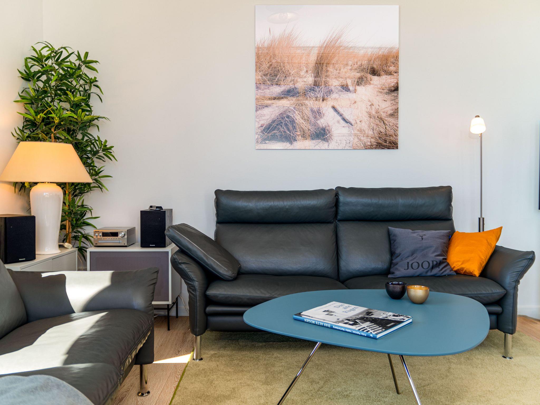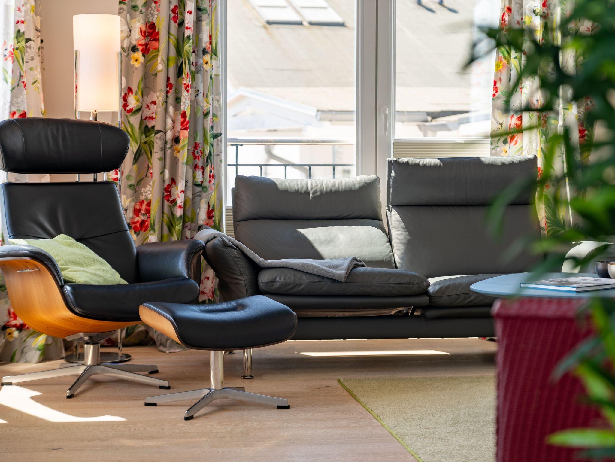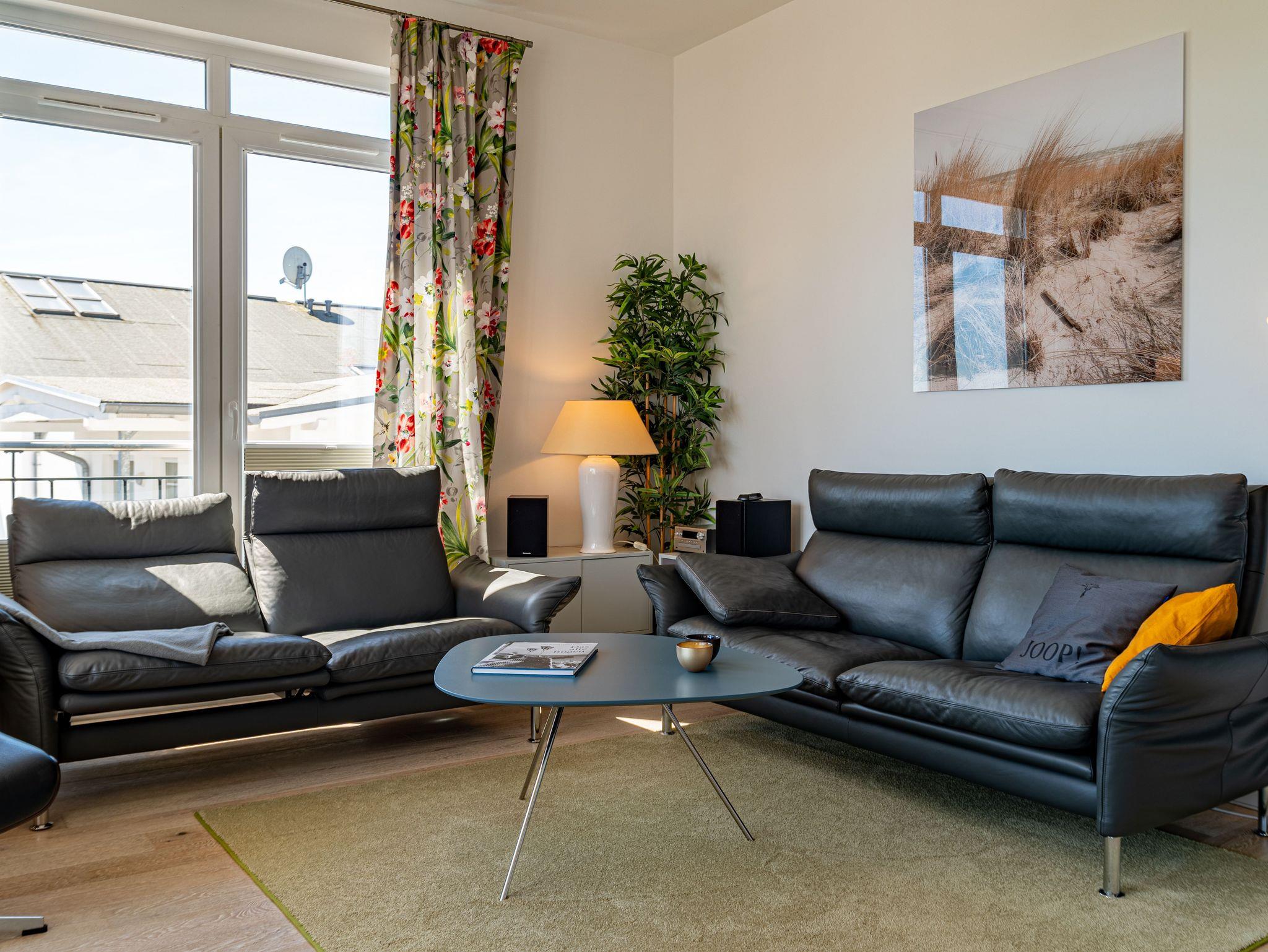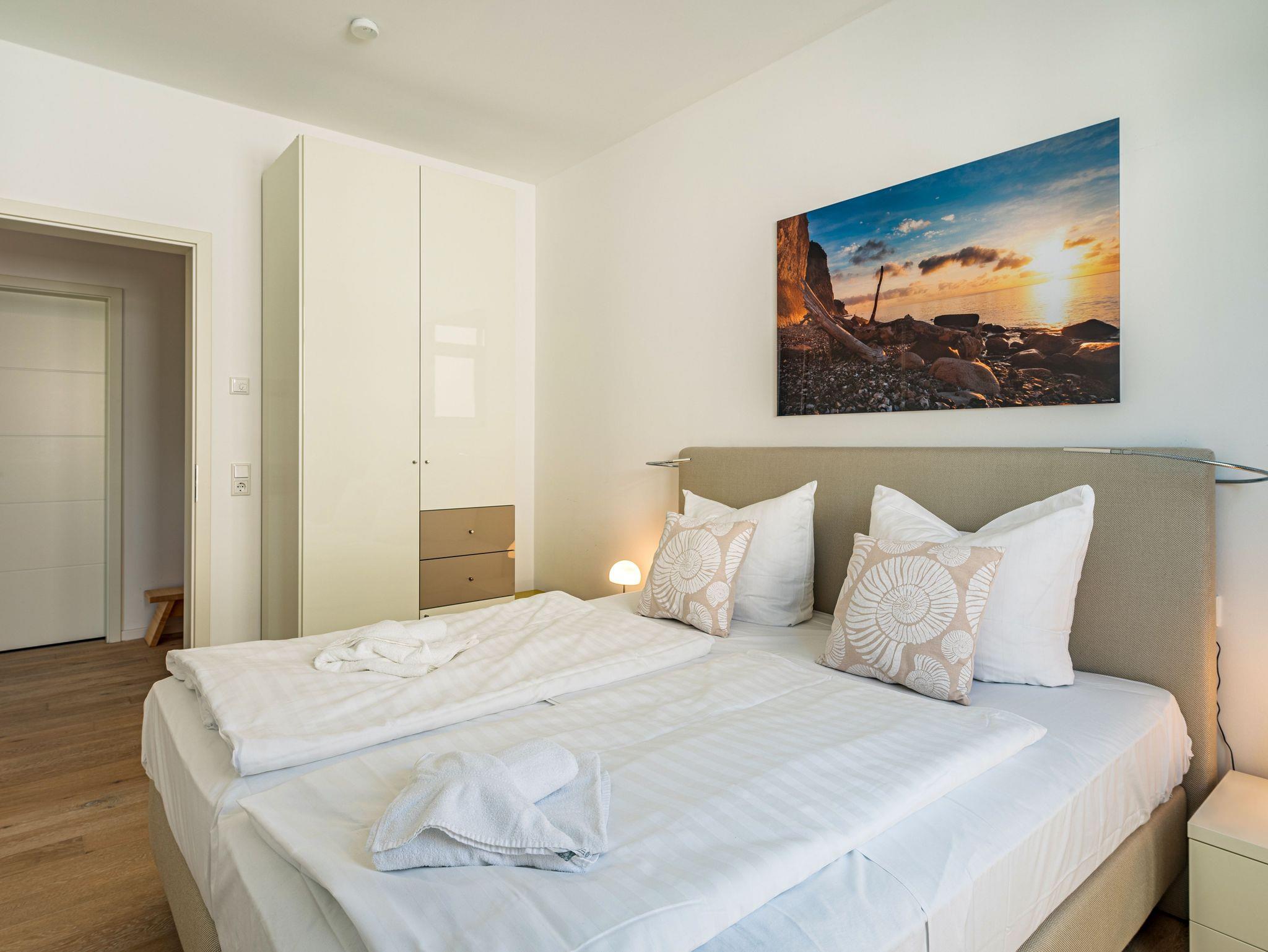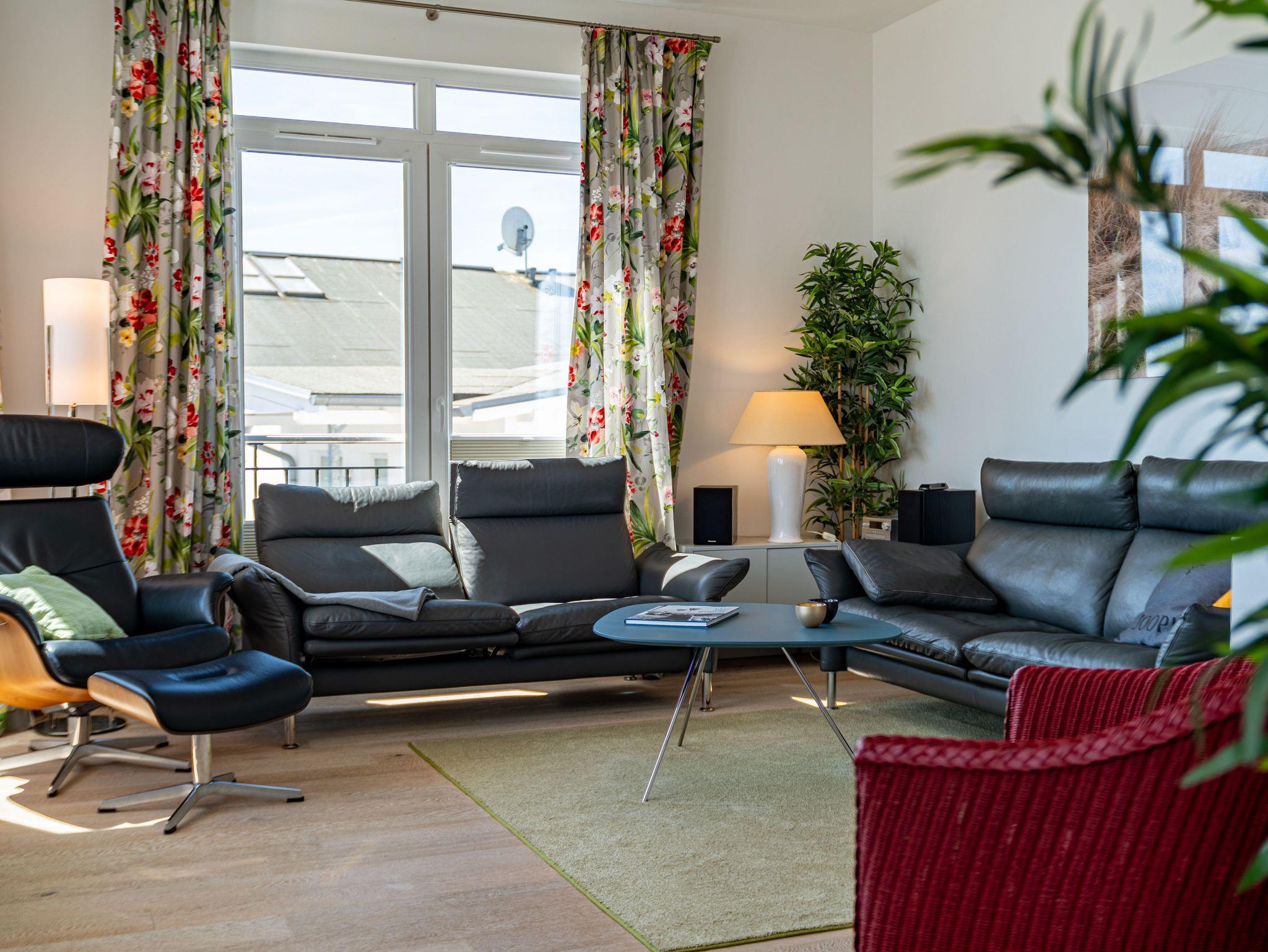 Seit 2016 erwarten Sie im Appartement WILHELMINE auf rund 79 m² Wohnfläche für max. 2 bis 3 Erwachsene + 1 Kleinkind bis 3 Jahre im Kinderreisebett, nicht nur drei liebevoll eingerichtete Zimmer, sondern gleich zwei möblierte Balkone mit herrlichem Blick auf die Linden-gesäumte Wilhelmstraße sowie auf das Hügelland rund um den Selliner See. Die modern und stilvoll eingerichtete Nichtraucher-Ferienwohnung überzeugt durch ihre klare Aufteilung sowie helles und hochwertiges Mobiliar. Im Wohnbereich laden 2 elegante Ledersofas, eine Leselampe, ein Couchtisch, ein Leder-Loungesessel mit Fußhocker zum Entspannen ein, während man ein gutes Buch liest oder einfach nur die Ruhe des Urlaubs genießt. Eine kleine Auswahl an Lektüre steht Ihnen zur Verfügung. Ein 48-Zoll-Smart-TV, Blu-Ray Player eine Mini-Stereoanlage mit CD-Player sowie kostenfreies WLAN sorgen für Unterhaltung. Die angrenzende Küchenzeile, ausgestattet mit Cerankochfeld, Backofen, Kühlschrank mit Gefrierfach, Spülmaschine, Kaffeemaschine, Espressokocher, Toaster, Wasserkocher sowie umfangreiche Küchenutensilien, macht Lust mal wieder den eigenen Kochkünsten freien Lauf zulassen. Ein großer Esstisch ergänzt die Ausstattung. Das 1. Schlafzimmer ist mit einem Hülsta Boxspringbett (1,80m x 2,00m), einem Kleiderschrank, Nachttischablagen und einem TV-Gerät ausgestattet. Das 2. Schlafzimmer verfügt über ein Boxspringbett (1,20m x 2,00m), einen Kleiderschrank, und einen Sessel mit Tisch. Auch ein Kinderreisebett kann hier auf Anfrage dazu gestellt werden. Für einen angenehmen Schlafkomfort sorgen in beiden Schlafzimmern Gesundheitsmatratzen (Härtegrad 3/hart), Plissees sowie Verdunklungsgardinen. Das Tageslicht-Bad bietet Ihnen eine Dusche mit Rainshower, ein Bidet, ein Kosmetikspiegel, ein WC, eine Handtuchheizung, einen Fön sowie einen Waschtisch mit beleuchtetem Spiegel. Zusätzlich rundet ein separates Gäste-WC die Wohnungsausstattung ab. Um den einmaligen Blick auf die historischen Häuser und Lindenbäume zu genießen gelangen Sie einmal vom Wohnbereich und vom kleineren Schlafzimmer auf die bestuhlten Balkone (NO & SO). Hier können Sie in Ruhe den Tag ausklingen lassen. Ein in der Wohnung befindender Abstellraum hält Staubsauger, Wäscheständer, Bügelbrett und ?eisen, Reinigungsutensilien sowie Sitzkissen für die Balkonmöbel bereit. Für unsere kleinen Gäste steht ein Hochstuhl sowie ein Kinderreisebett (ohne Zusatz Matratze) zur Verfügung. Unter dem hellen Echtholzparkett verbirgt sich eine flächendeckende Fußbodenheizung, die ganzjährig für ein angenehmes Raumklima sorgt. Im geräumigen, abschließbaren Gemeinschafts-Fahrradkeller sind Ihre Räder sicher untergebracht. Ein Fahrstuhl bringt Sie in das 2. Obergeschoss. Haustiere sind nicht erlaubt. Ein PKW-Stellplatz (Nr.08) befindet sich direkt hinter dem Haus, welcher mittels einer Schranke gesichert ist. Die Erstausstattung eines Wäschepaketes (komplette Bettwäsche, 1 Duschhandtuch, 2 kleine Handtücher) können Sie bis 14 Tage vor Anreise gegen einen Aufpreis dazu buchen oder durch eigene ergänzen. Ab 2 gebuchten Paketen erhalten Sie einmalig 1 Geschirrhandtuch und 1 Duschvorleger hinzu.