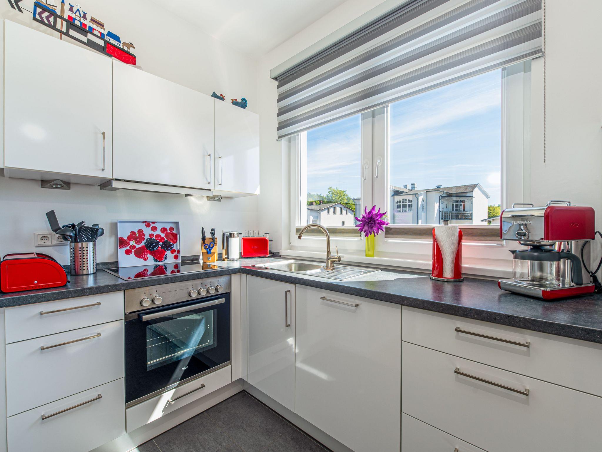 Herzlich willkommen im wunderschönen Urlaubs-Domizil WILHELMINE im zweiten OG der Villa Wiederkehr direkt an der berühmten Wilhelmstraße im Ostseebad Sellin. Die Villa Wiederkehr, im klassischen Bauhausstil errichtet, befindet sich am oberen Ende der Wilhelmstraße zentral gelegen und doch nicht mittendrin im Trubel. Bis zur historischen Seebrücke mit ihren Pavillions und dem feinsandigen Ostseestrand sind es ca. 700 Meter. Der Strand erstreckt sich von Sellin über 7 km, an Baabe vorbei bis zum Ostseebad Göhren. Von der Seebrücke aus startet (saisonal) die Weiße Flotte in Richtung Binz und Sassnitz, bis zu den weltberühmten Kreidefelsen. Von der Villa Wiederkehr ausgehend gelangen Sie in ca. 500 Metern an den Selliner See, der zu herrlichen Wanderungen und Radfahrten einlädt. Wer gerne ein Restaurant besuchen möchte, findet in unmittelbarer Nähe verschiedene Möglichkeiten. Ganz in der Nähe befindet sich auch die Haltestelle des Rasenden Roland, eine der Hauptattraktionen Rügens: die dampflokbetriebene historische Schmalspurbahn, mit der Sie vorbei am Jagdschloss Granitz auch nach Binz fahren können. Ein Spaß für Groß und Klein.
