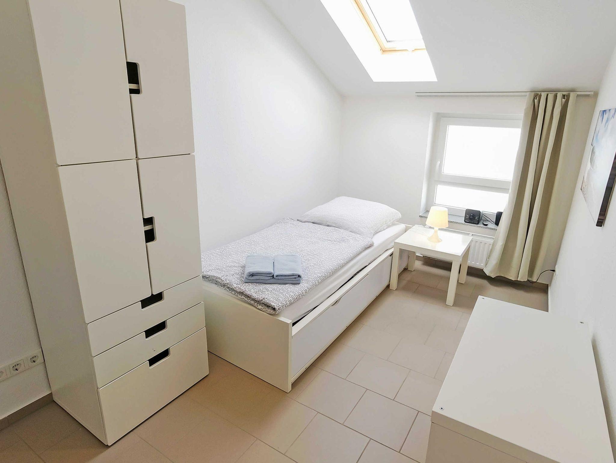 Im zweiten Schlafzimmer gibt es ein Einzelbett (0,90x2,00m) sowie einen Kleiderschrank ein Beistelltisch und eine Lampe.