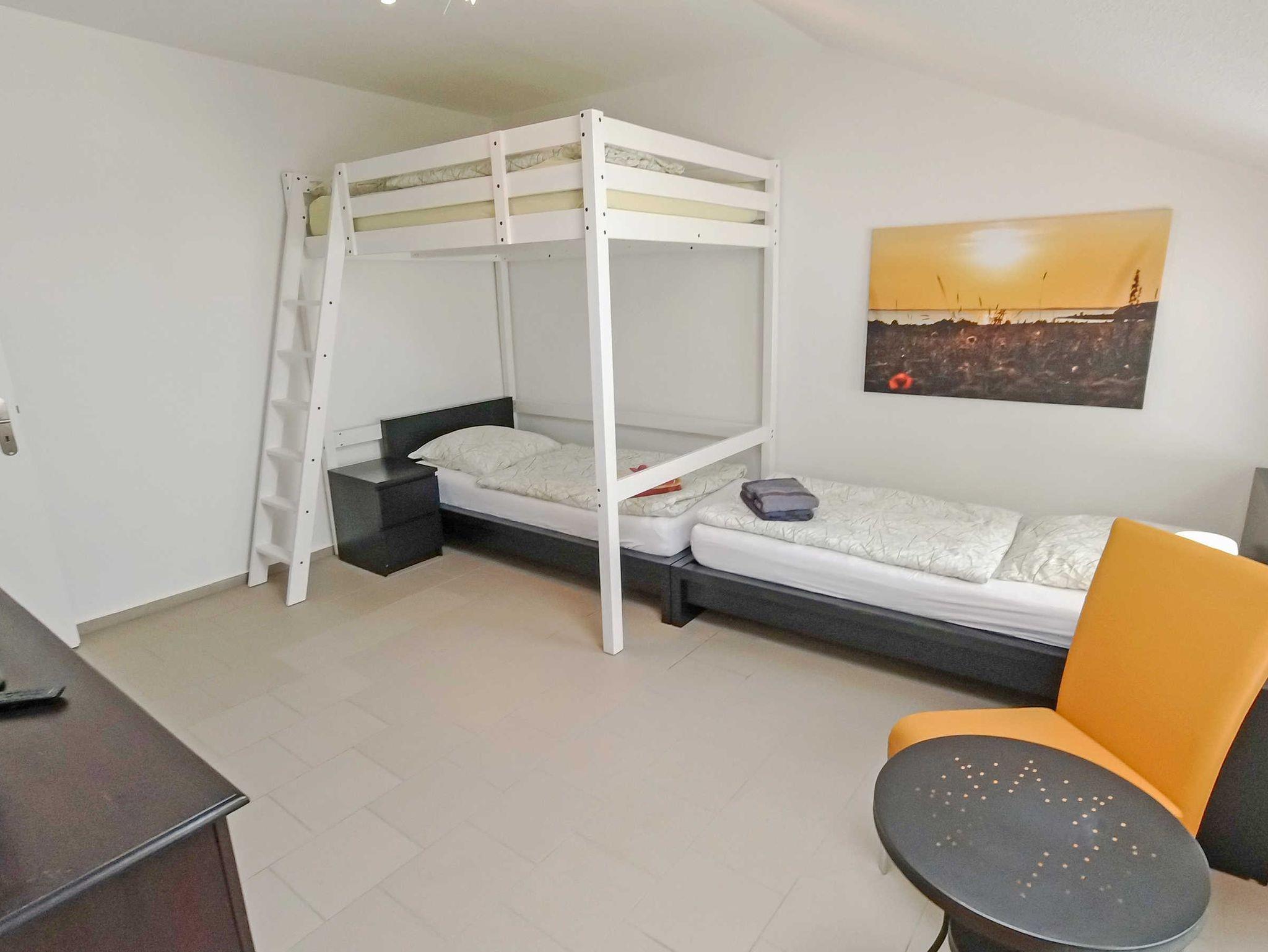 Das dritte Schlafzimmer hat zwei Einzelbetten (0,90x2,00m), ein Hochbett (1,40x2,00m) eine Kommode einen Tisch mit zwei Stühlen und einen Kleiderschrank. In einer Nische steht zudem ein Waschtrockner.