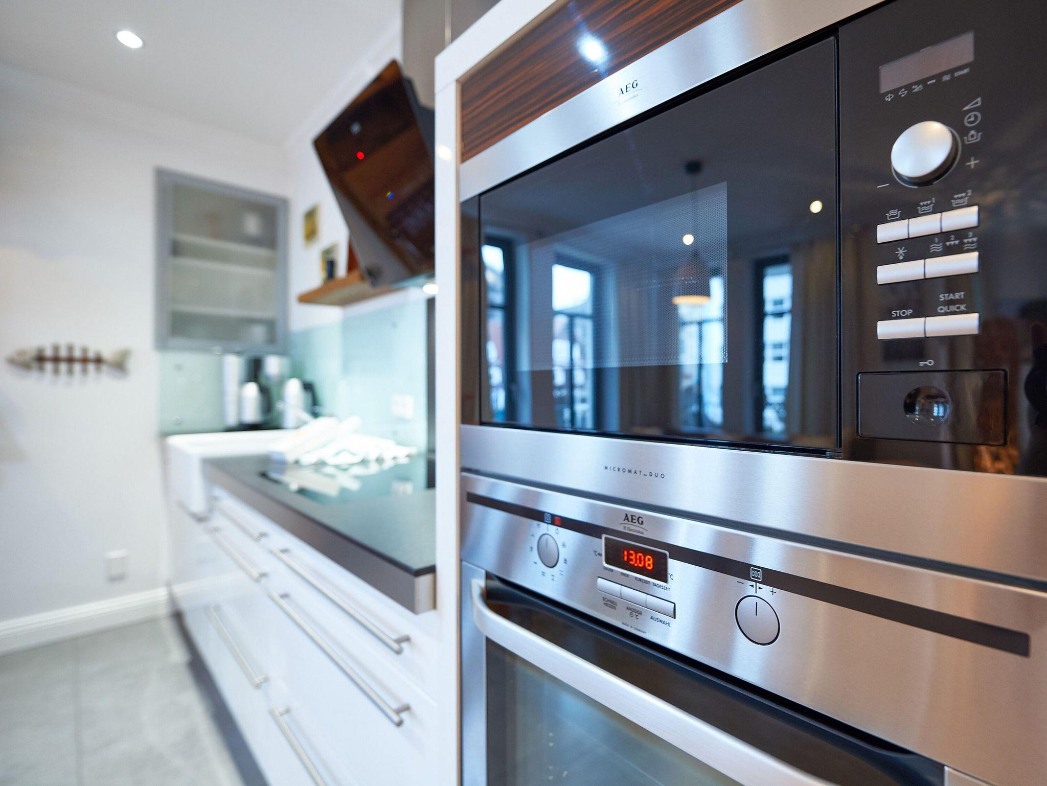 Der in den Wohnraum harmonisch integrierte Kochbereich überzeugt mit hochwertigen Geräten. Ein Miele-Induktionskochfeld, ein Backofen, eine Mikrowelle, ein Geschirrspüler, ein Kühlschrank mit Gefrierfach, ein Toaster, eine Nespresso-Maschine (Vertuo-System - halbrunde Kapseln), ein Kaffeeautomat Siemens-Porsche-Design, ein Wasserkocher, WMF-Kochtöpfe und diverses Kleininventar lassen das Herz jeden Hobbykochs höher schlagen. Der große Massivholz-Esstisch ist ein echtes Unikat und bietet 4 Personen genügend Platz für ein anregendes Mahl. Die frischen Urlaubsbrötchen bekommen Sie beim ca. 20 m entfernten Bäcker.
