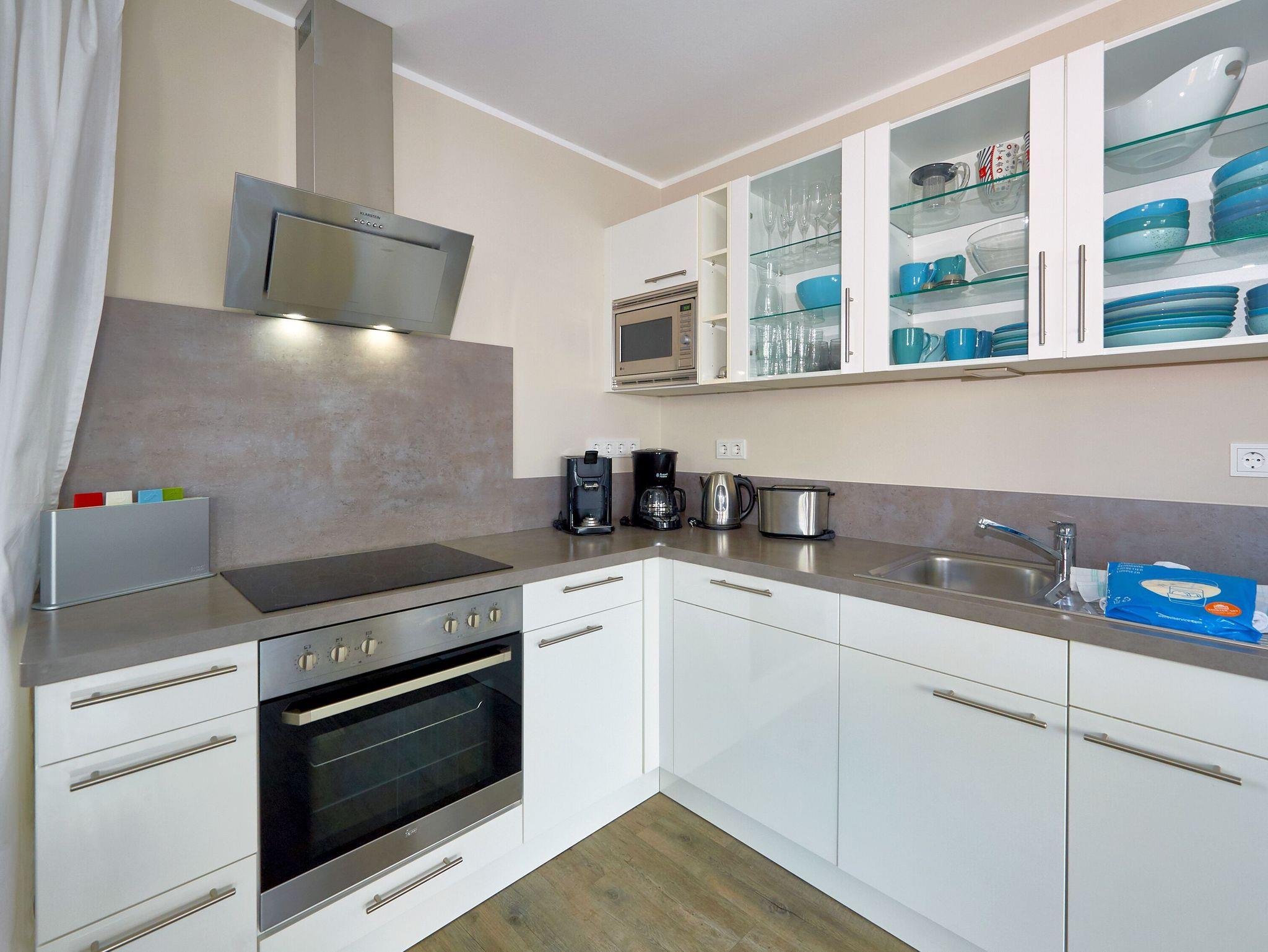 Die geräumige offene Wohnküche ist mit einem großen Kühlschrank, einem Gefrierschrank (mit zwei großen Gefrierfächern), einem Backofen, einem 4-Zonen-Cerankochfeld, einer Mikrowelle, einer Spülmaschine, einer SENSEO-Kaffeepadmaschine, einer Filterkaffeemaschine, einem Handmixer, einem Waffeleisen, einem Stabmixer und diversem Kleininventar, das die Küchenausstattung komplettiert, eingerichtet.