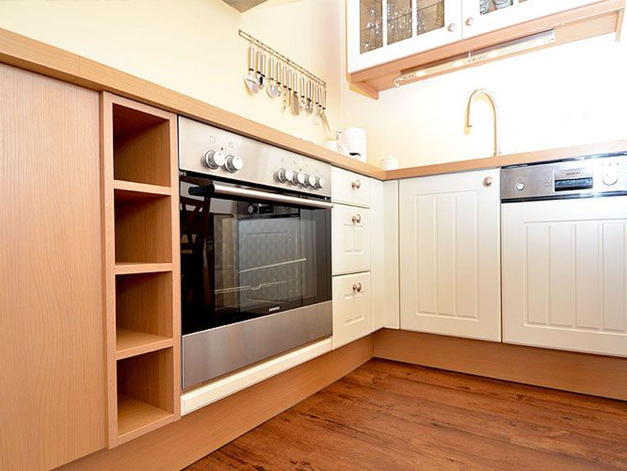 Die offene Landhausküche ist mit einem Kühlschrank mit Gefrierfach, einem Backofen, einem 4 Platten-Ceranfeld, einer Spülmaschine, sowie Mikrowelle, Toaster, Mixer, einem Eierkocher und diversem Kleininventar, das die Küchenausstattung komplettiert, eingerichtet. Ein JURA-Kaffeeautomat sorgt für Kaffee satt.
