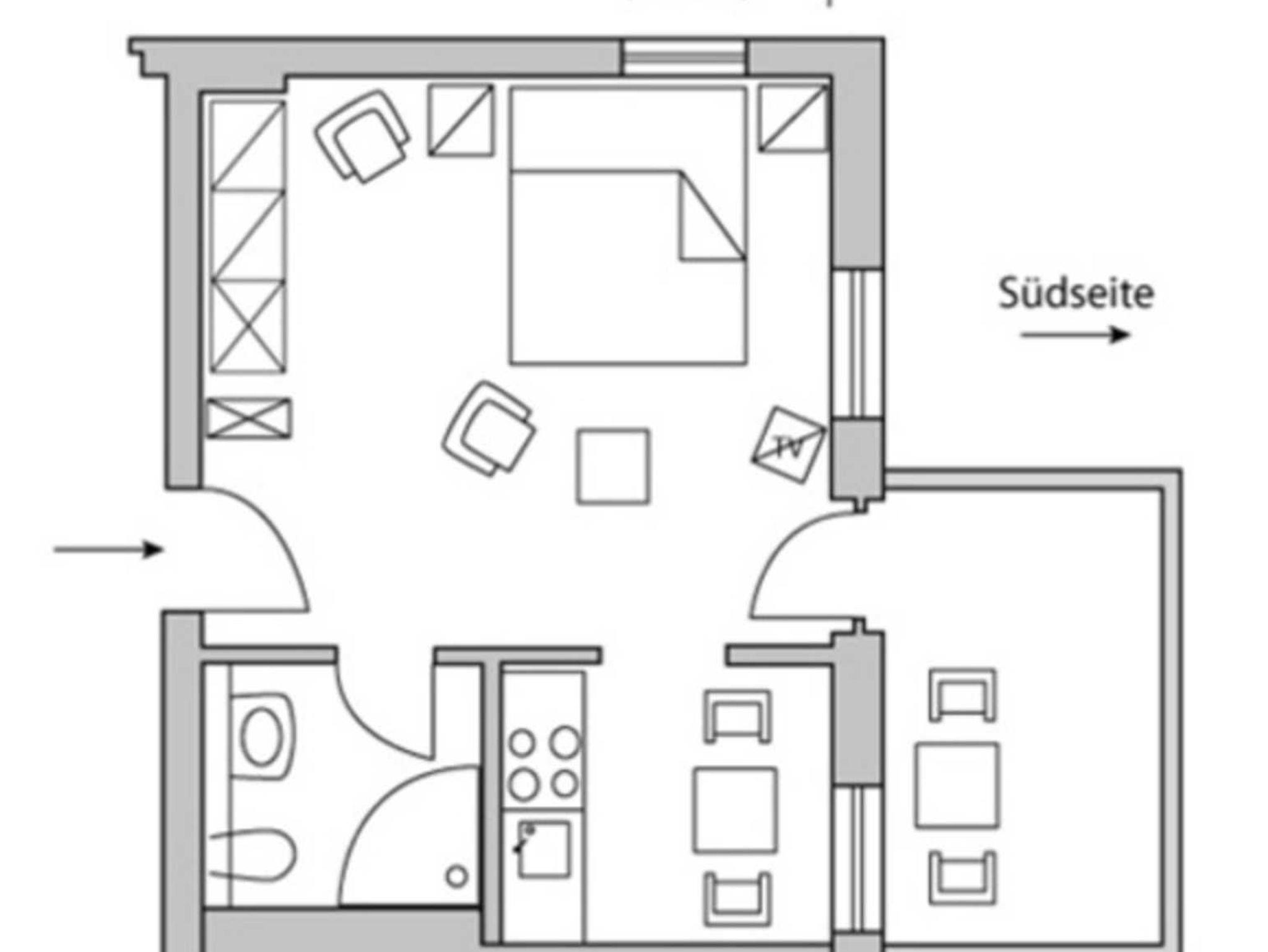 Die gradlinig-nordisch ausgestattete Einzimmer-Ferienwohnung mit Balkon (D203 Typ) ist 30 qm groß. Der kombinierte Wohn- und Schlafraum mit Doppelbett verfügt über Dusche/WC sowie TV/Radio, Telefon und DSL-Internetzugang (LAN/WLAN).