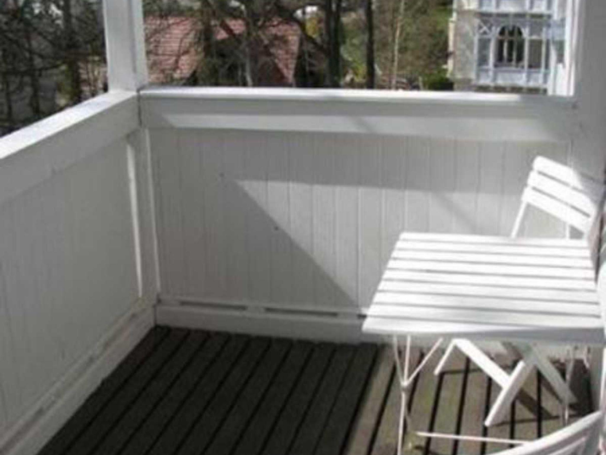 Die abgetrennte Küche mit Herd und Backofen hat einen kleinen Essplatz. Vom überdachten Balkon mit Gartenmöbeln können Sie sowohl zum Wald als auch zur Villenallee Wilhelmstraße blicken. Das Appartement ist vom Vermieter mit Bettwäsche, Hand- und Geschirrtüchern ausgestattet. Die Betten sind bezogen. Wäschewechsel gegen Gebühr.