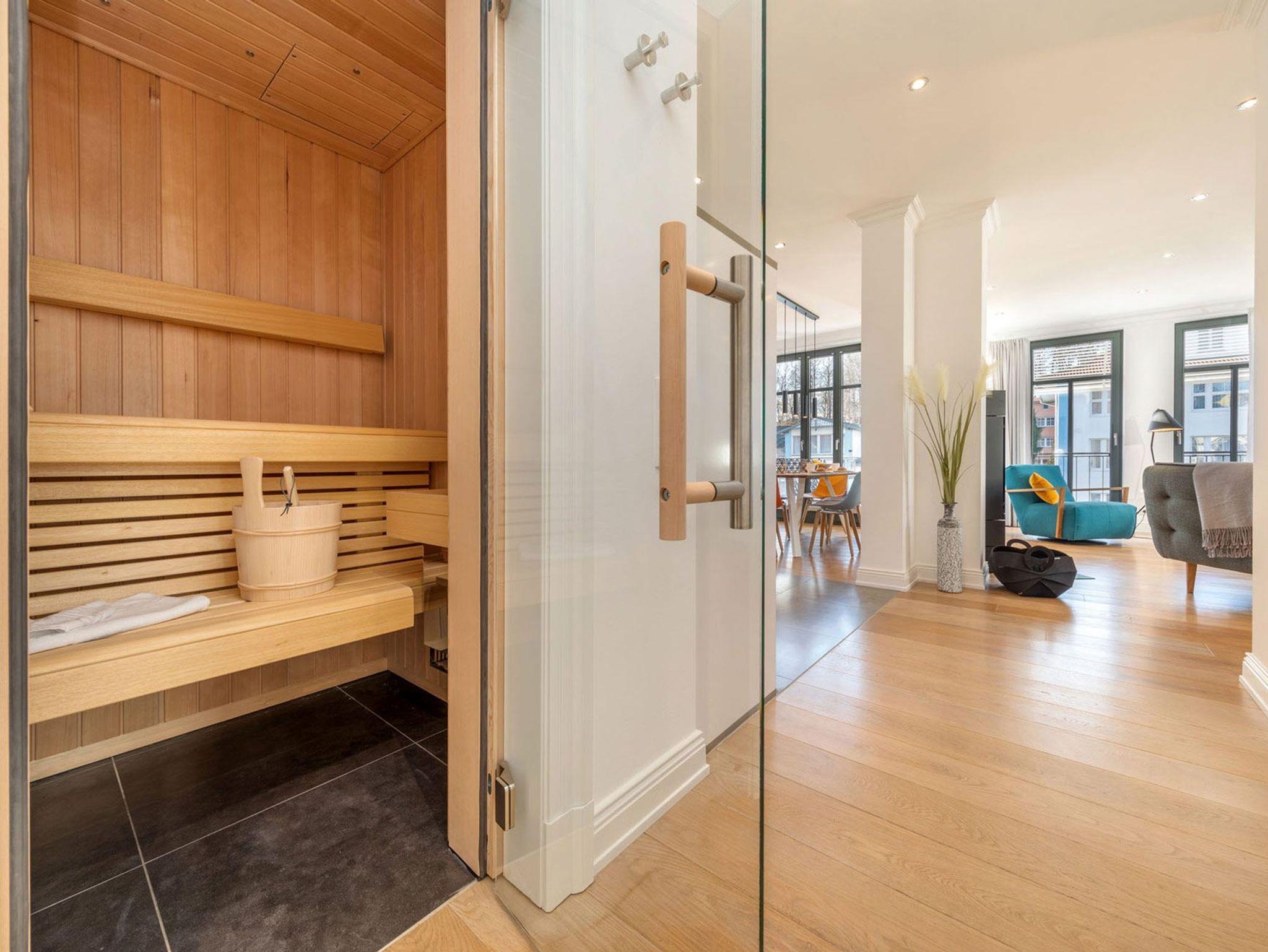 In Ihrem Urlaubsdomizil erwartet Sie ein stilvolles Ambiente durch hochwertige Möbel in exklusivem Design. Zum Wohlfühl-Erlebnis sorgt die flächendeckende Fußbodenheizung und eine wohnungseigene Sauna, die zum Verweilen an kalten Wintertagen einlädt. Die moderne Küchenzeile und -insel im kombinierten Wohn- und Esszimmer wurde mit hochwertigen Markengeräten und allem notwendigen Geschirr ausgestattet und lädt zum gemeinsamen Kochen ein. Hier bleiben keine Wünsche offen.