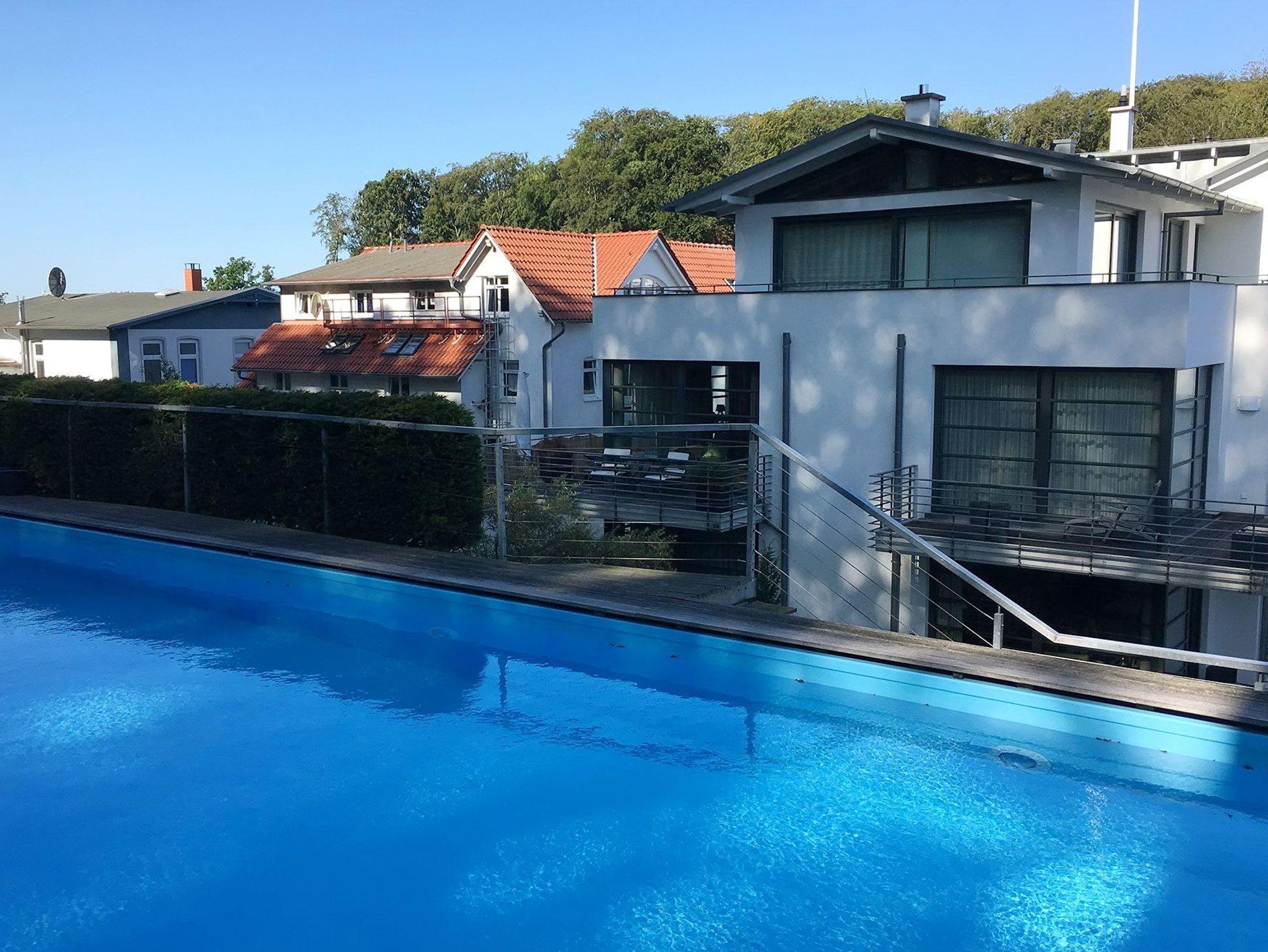 Die beiden Schlafzimmer überzeugen mit ihren luxuriösen Boxspring-Doppelbetten, Kleiderschränken und den 32 Zoll LED Fernsehern (inkl. Netflix) und strahlen eine elegante Behaglichkeit aus. Vom ersten Schlafzimmer (Richtung Osten) genießen Sie einen herrlichen Blick auf den solar beheizten Aussenpool und dem seitlichen Blick auf die Wilhelmstraße. Dem Schlafzimmer angeschlossen befinden sich jeweils ein Ensuite-Bad, welches mit hochwertiger Keramik von Villeroy [&] Boch und Amaturen von Grohe Axor ausgestattet ist. Dies gibt den Ensuite-Bädern eine definierte Ästhetik und lässt keine Wünsche offen.