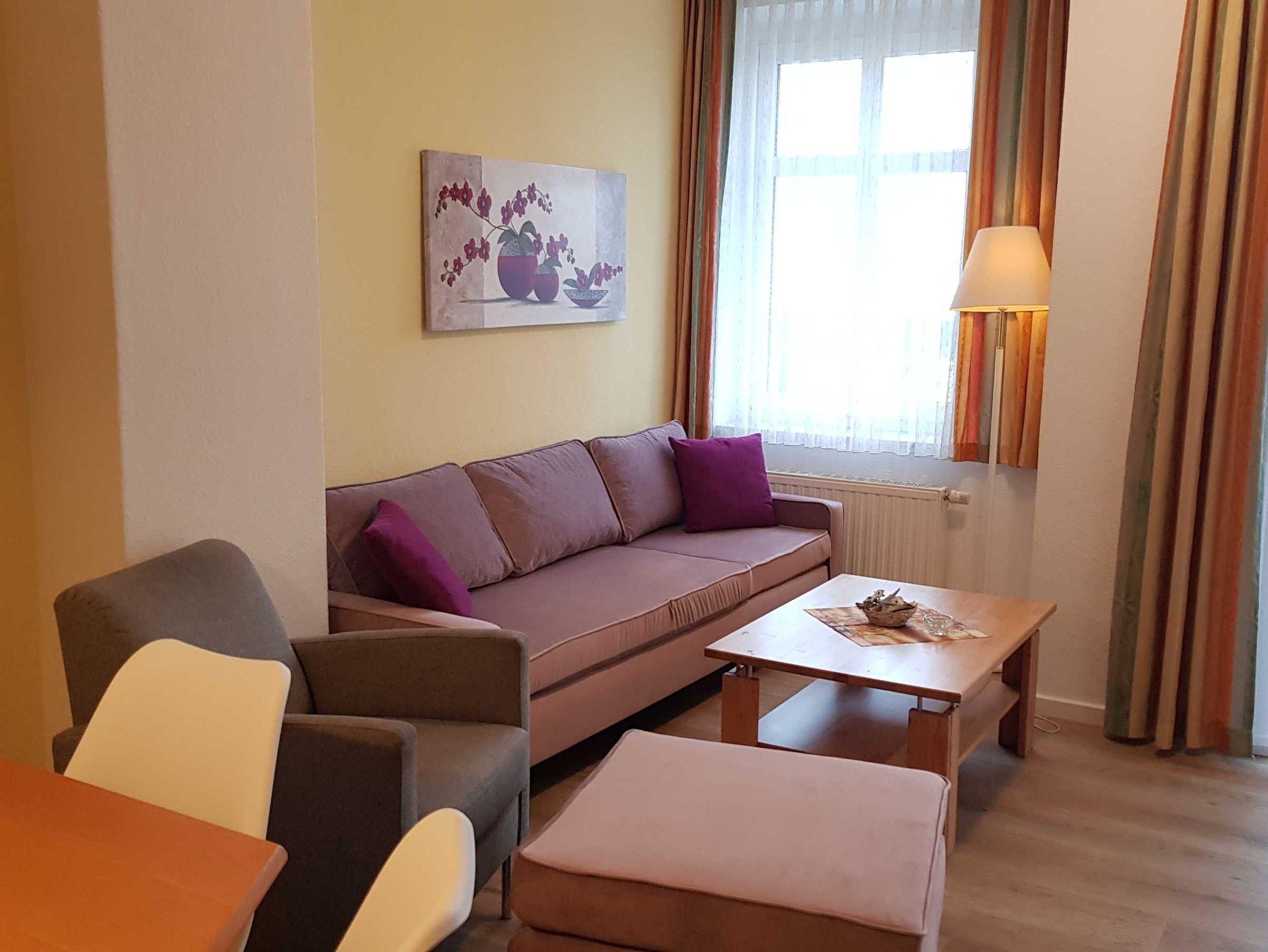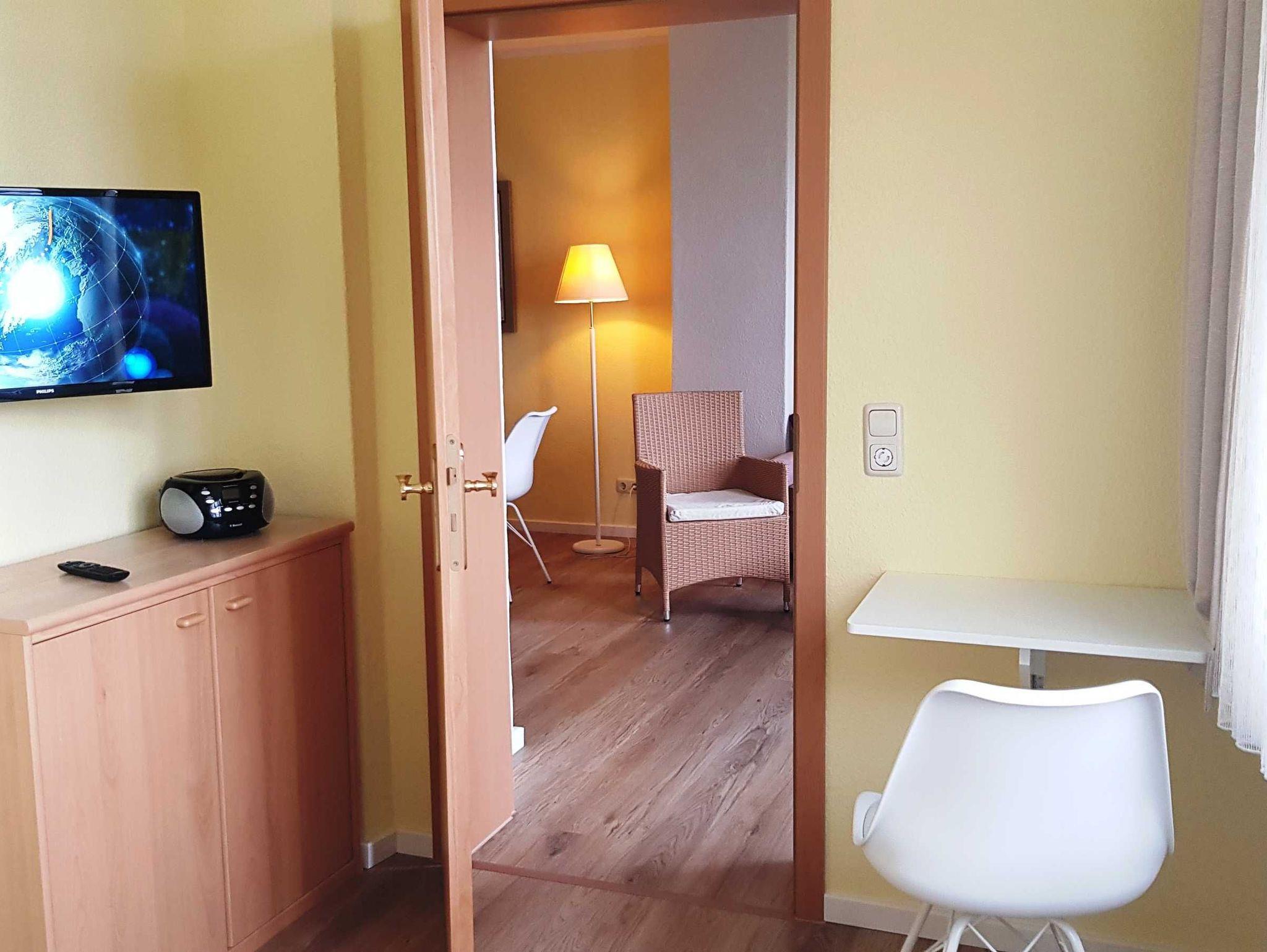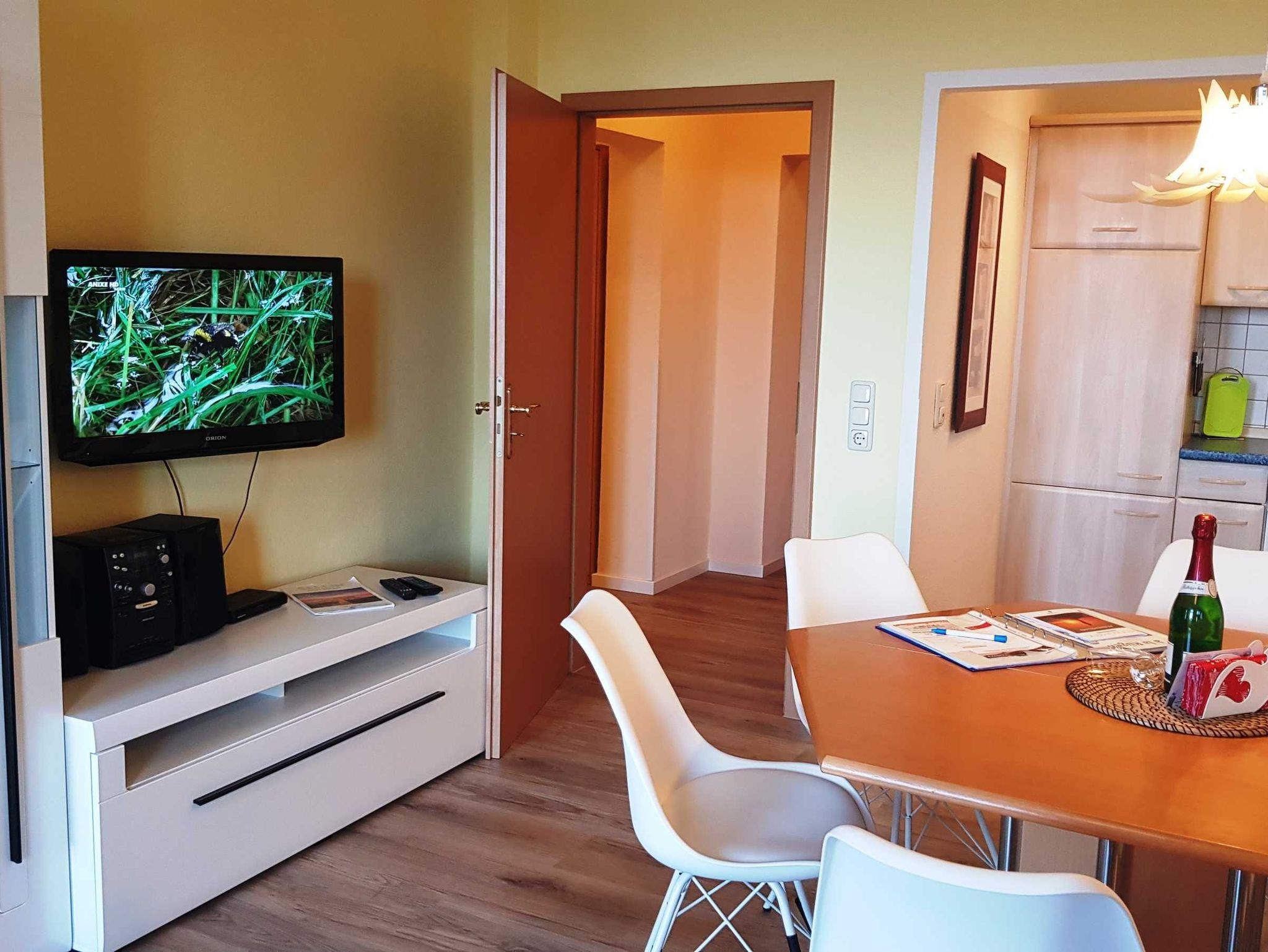 Wohnzimmer mit Radio, Flatscreen-TV, W-LAN und Couch. Großer Esstisch für 4 Personen