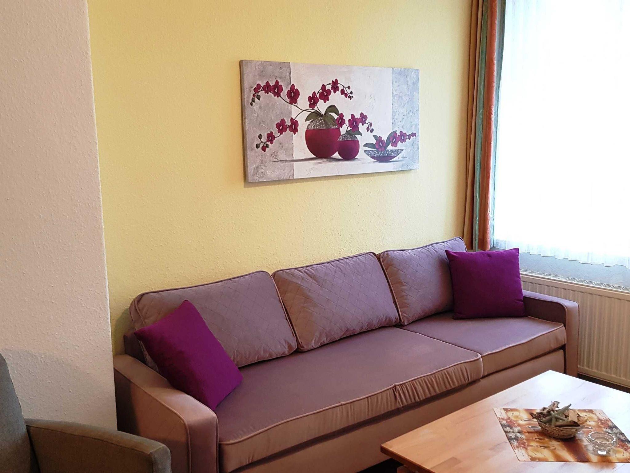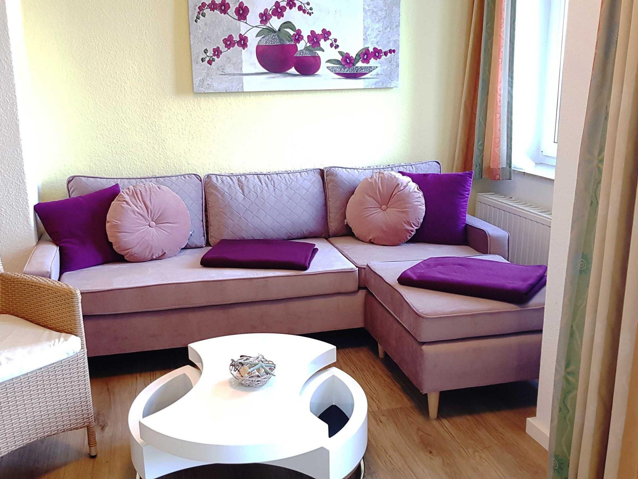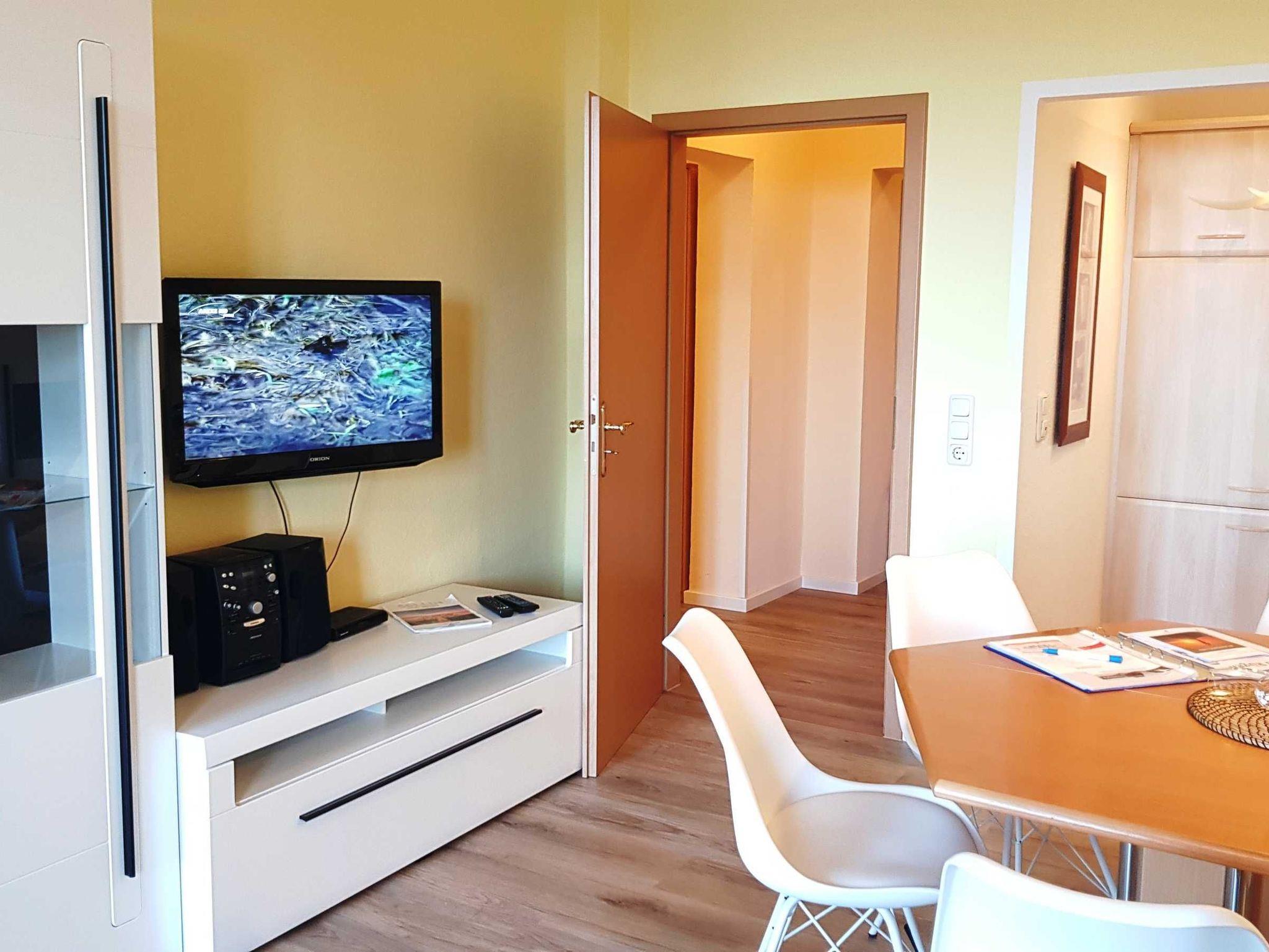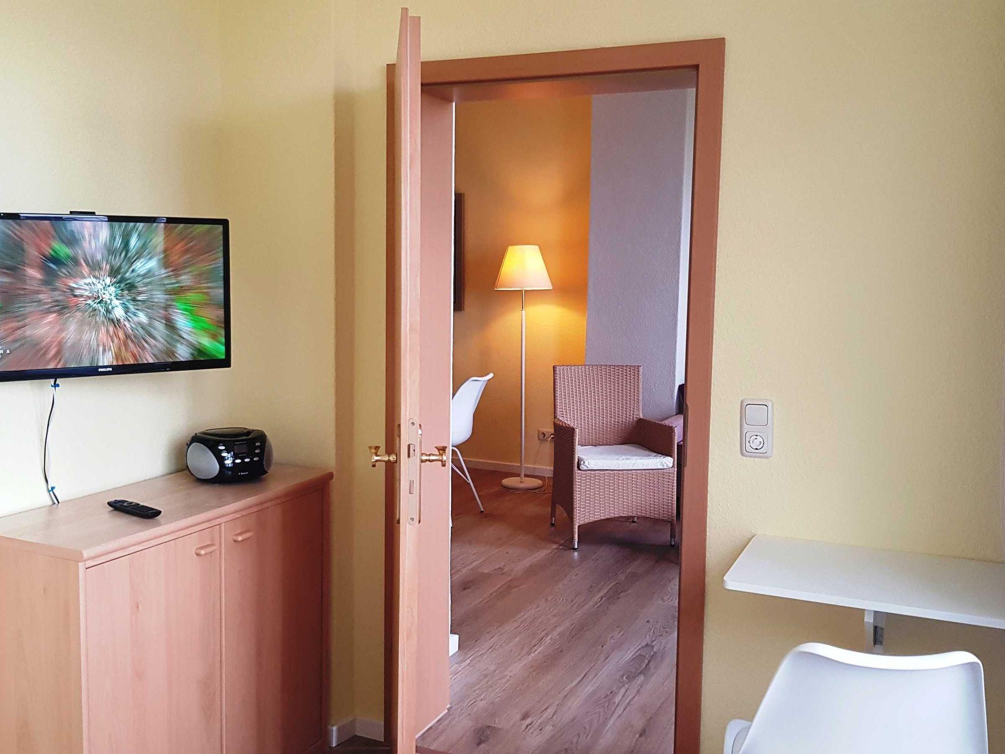 Wohnzimmer mit Radio, Flatscreen-TV, W-LAN und Couch. Großer Esstisch für 4 Personen