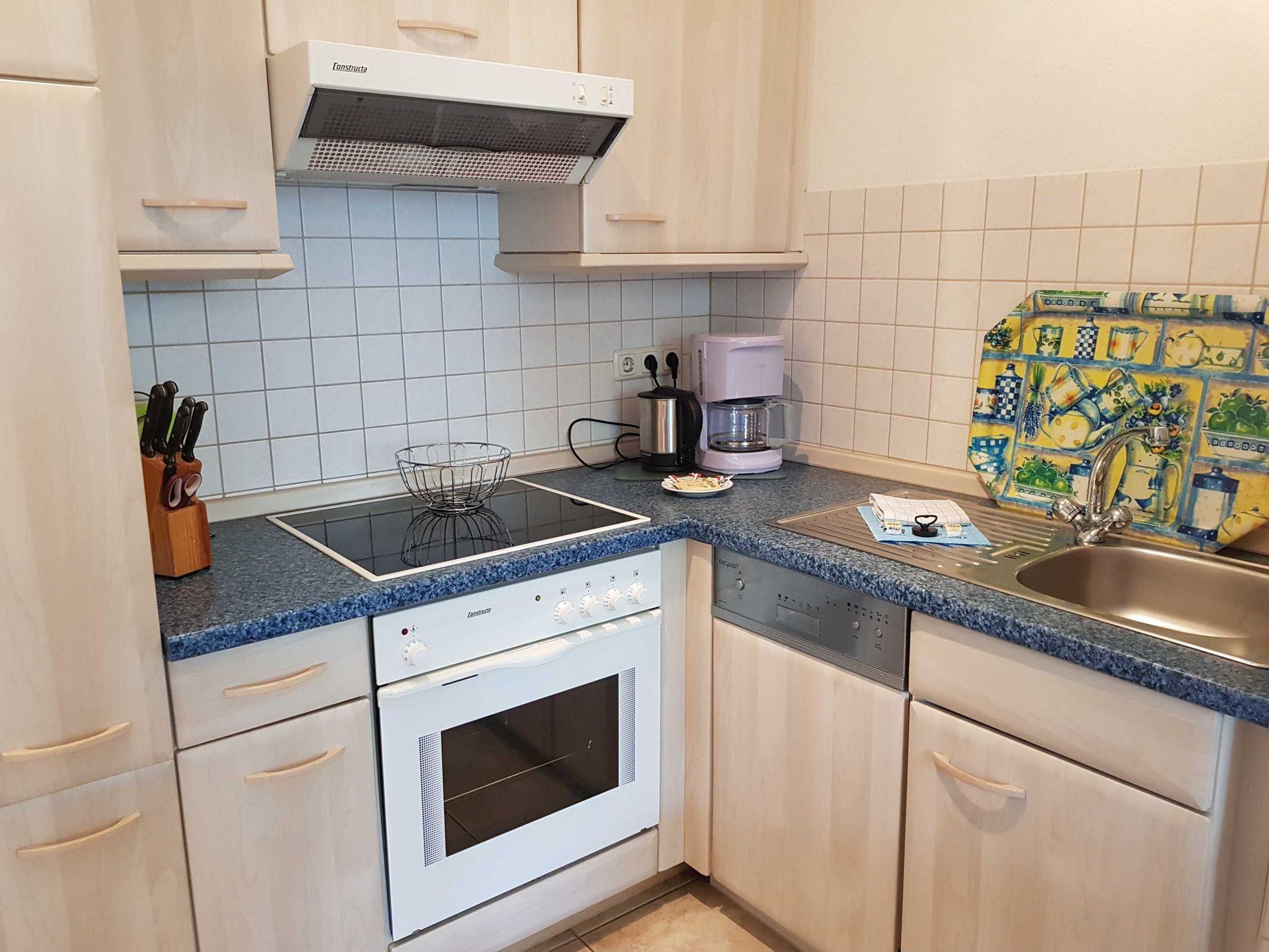 • Küche mit 4 Platten Cerankochfeld, Backofen,Kühlscvhrank und Geschirrspüler ,Kaffemaschine, Wasserkocher, Toaster.