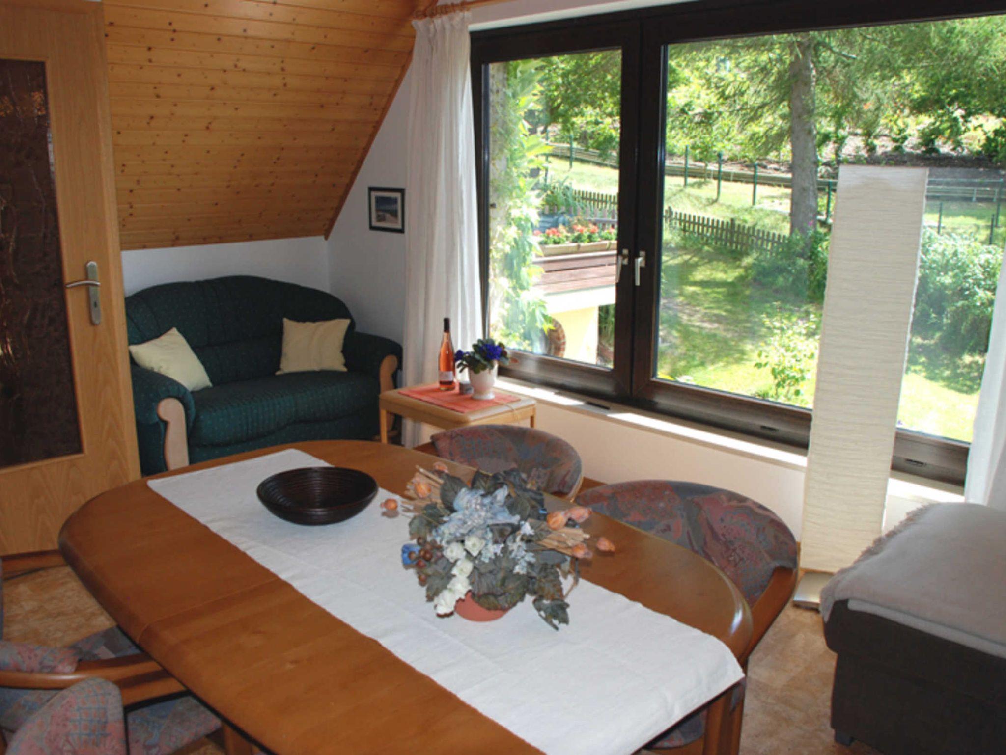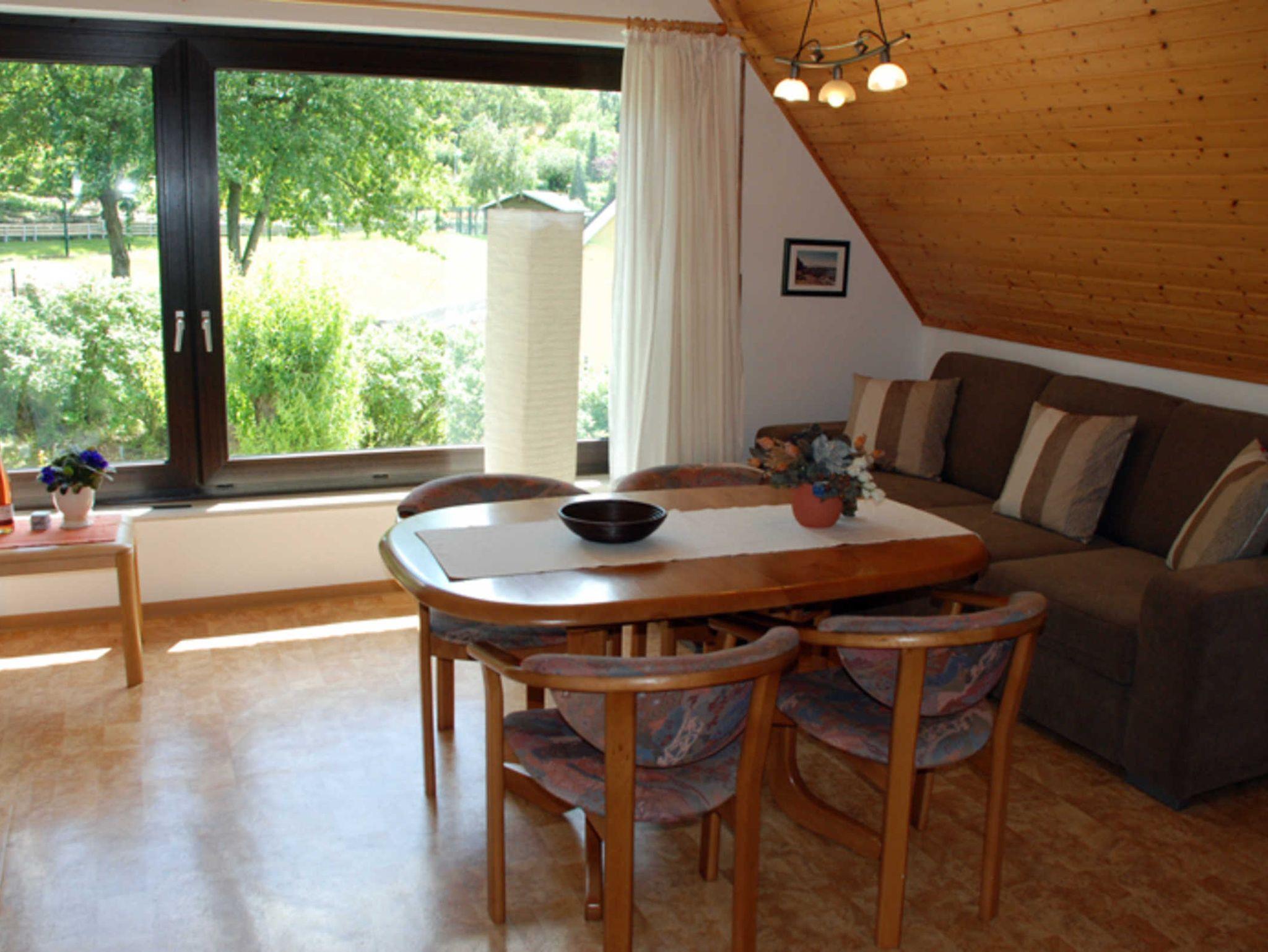 Im Wohnraum befinden sich eine bequeme Sitzcouch mit Tisch und ein modernes Flachbild-TV-Gerät. Hier steht auch ein Esstisch mit Stühlen. Ein Internetzugang steht Ihnen kostenfrei zur Verfügung.