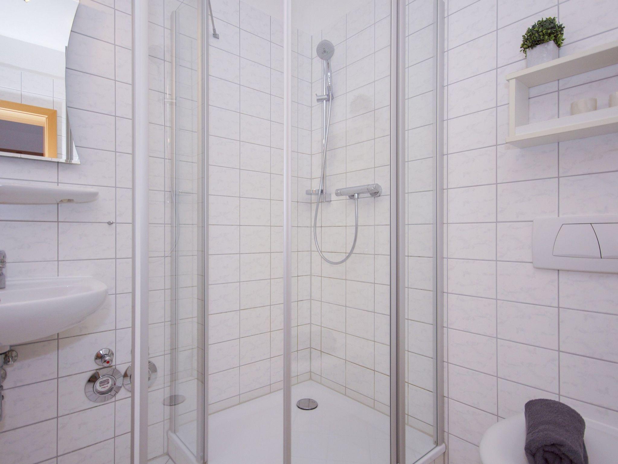 Im Badezimmer befindet sich eine hochwertige Dusche, ein WC und ein Waschbecken mit entsprechendem Spiegel.