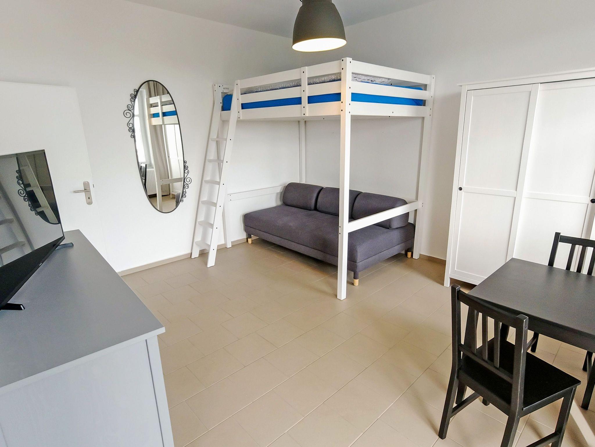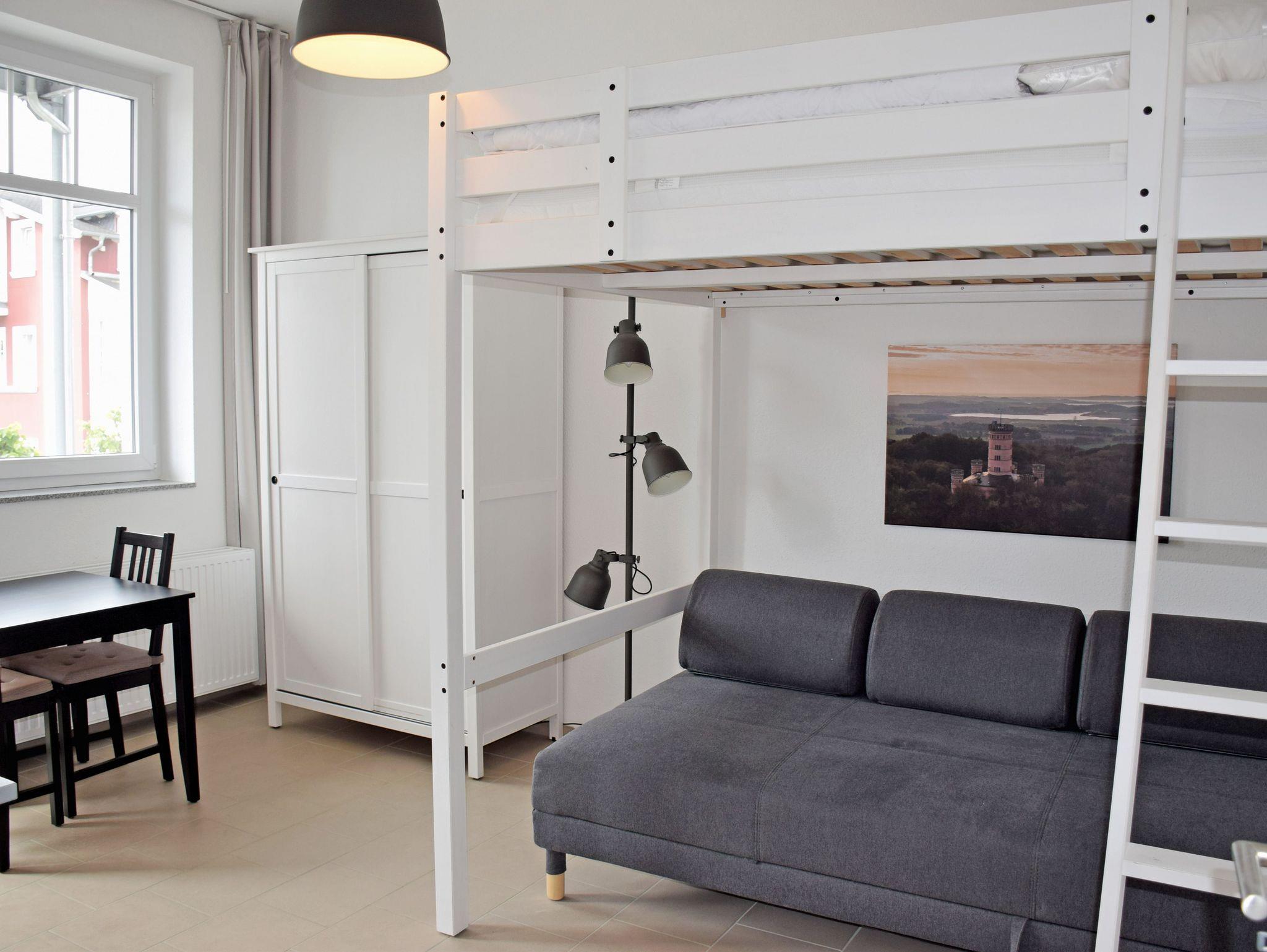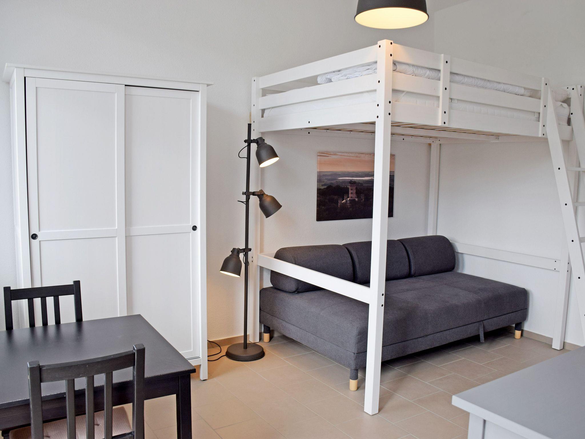 In dem kombinierten Schlaf-/ Wohnraum stehen ein Hochbett (1,40 x 2,00m), ein Schlafsofa , ein Kleiderschrank, ein Esstisch mit zwei Stühlen und eine Kommode mit Flachbild-TV. Es können also hier max. 2 Erwachsen und ein Kind bis 16 Jahre wohnen und schlafen. Achtung das Hochbett ist nur 1,40 breit!
