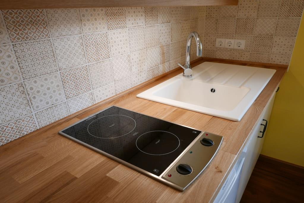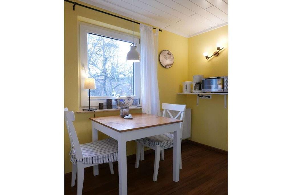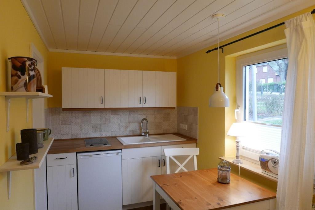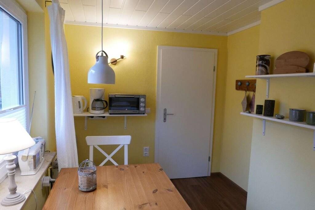 Die kleine gemütliche Ferienwohnung für 2 Personen umfasst 30,00 m². Sie wurde 2018 vollständig renoviert und und hochwertig umgebaut. Die Ferienwohnung ist über eine schöne Holzterrasse mit eigenem Eingang zu erreichen. Es gibt ein geschmackvoll eingerichtetes Schlaf-/Wohnzimmer mit Doppelbett, 2 Nachttischen, SAT-LED Fernseher mit Radio (MP3-USB/SD), einem Schrank, einem Zweisitzer-Sofa mit Beistelltisch und zahlreiche gemütliche Beleuchtungsmöglichkeiten, sowie Plissees an den Fenstern. Die Küche verfügt über eine Eichenfurnierarbeitsplatte mit 2 integrierten Cerankochfeldern von Schott, einer weißen Keramikspüle von Villeroy und Boch, Kühlschrank mit Gefrierfach, Kaffeemaschine, Toaster, Wasserkocher und Minibackofen. Die mediterranen Keramik-Fließen wurden in Spanien gebrannt und passen gut zum natürlichen Holzton der Arbeitsplatte. Im Bad gibt es WC, Waschbecken und Dusche mit Grohe Euphoria Rain-Dusche und Badheizkörper.
