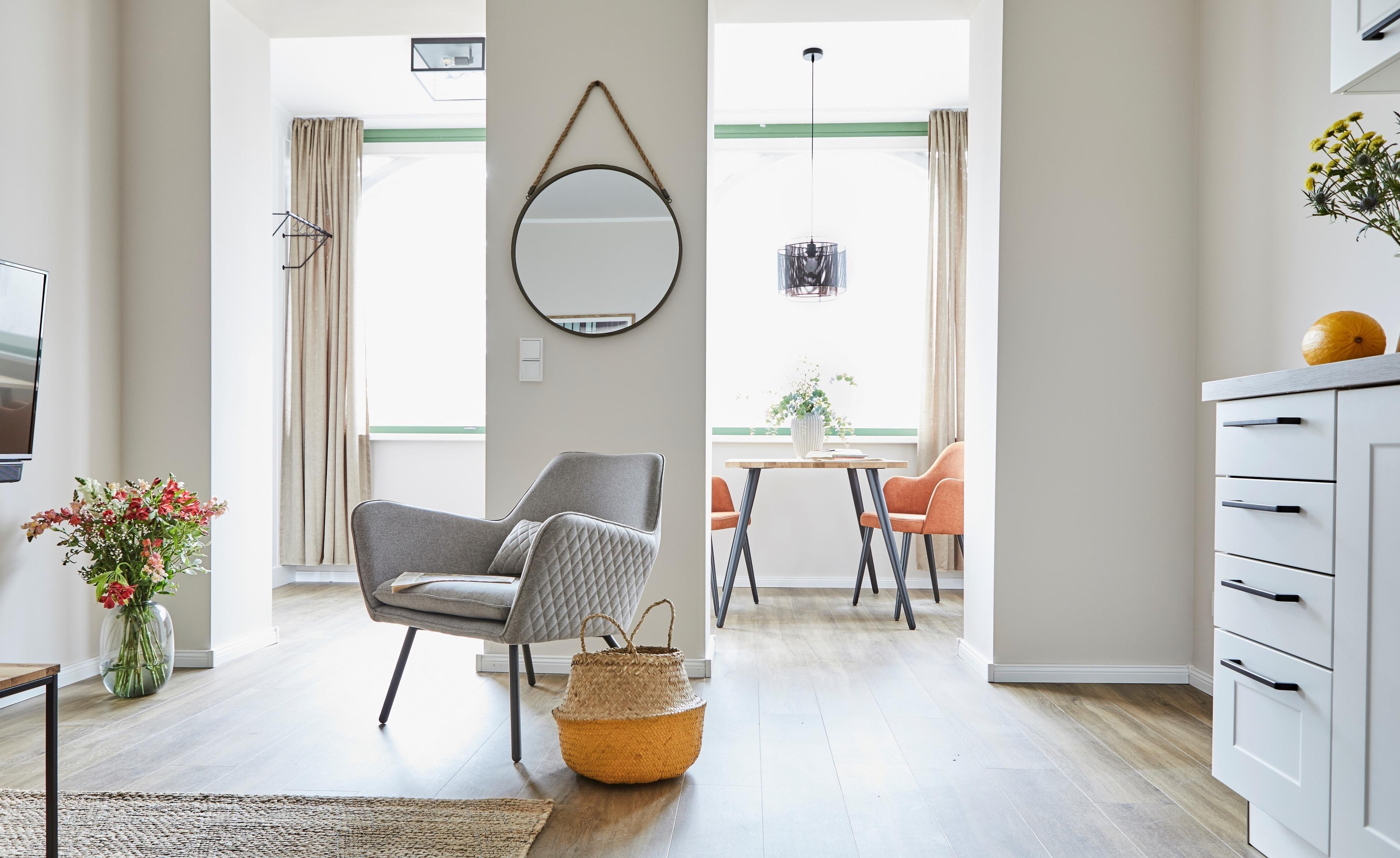 Die Ferienwohnung Suite mit Gartenterrasse befindet sich im Anbau des historischen Haupthauses unserer kleinen Ferienanlage und hat eine Fläche von ca. 47 m2.