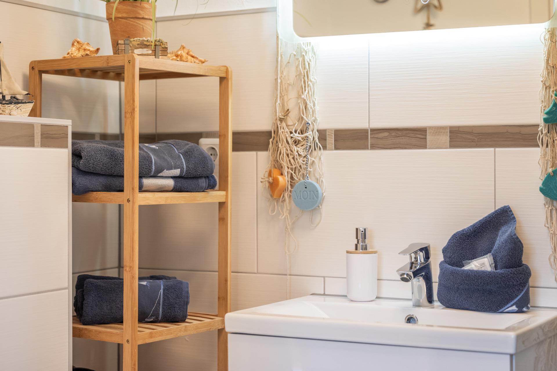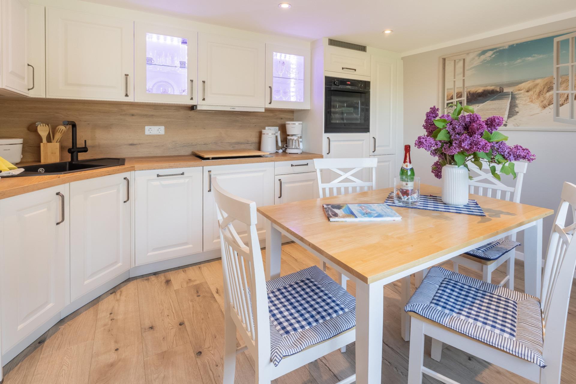 Das Ferienhaus ist geschmackvoll im Landhausstil eingerichtet und verfügt über ein Wohn-/Esszimmer mit Küchenzeile, ein Schlafzimmer mit Boxspringbett und ein Badezimmer mit Dusche.