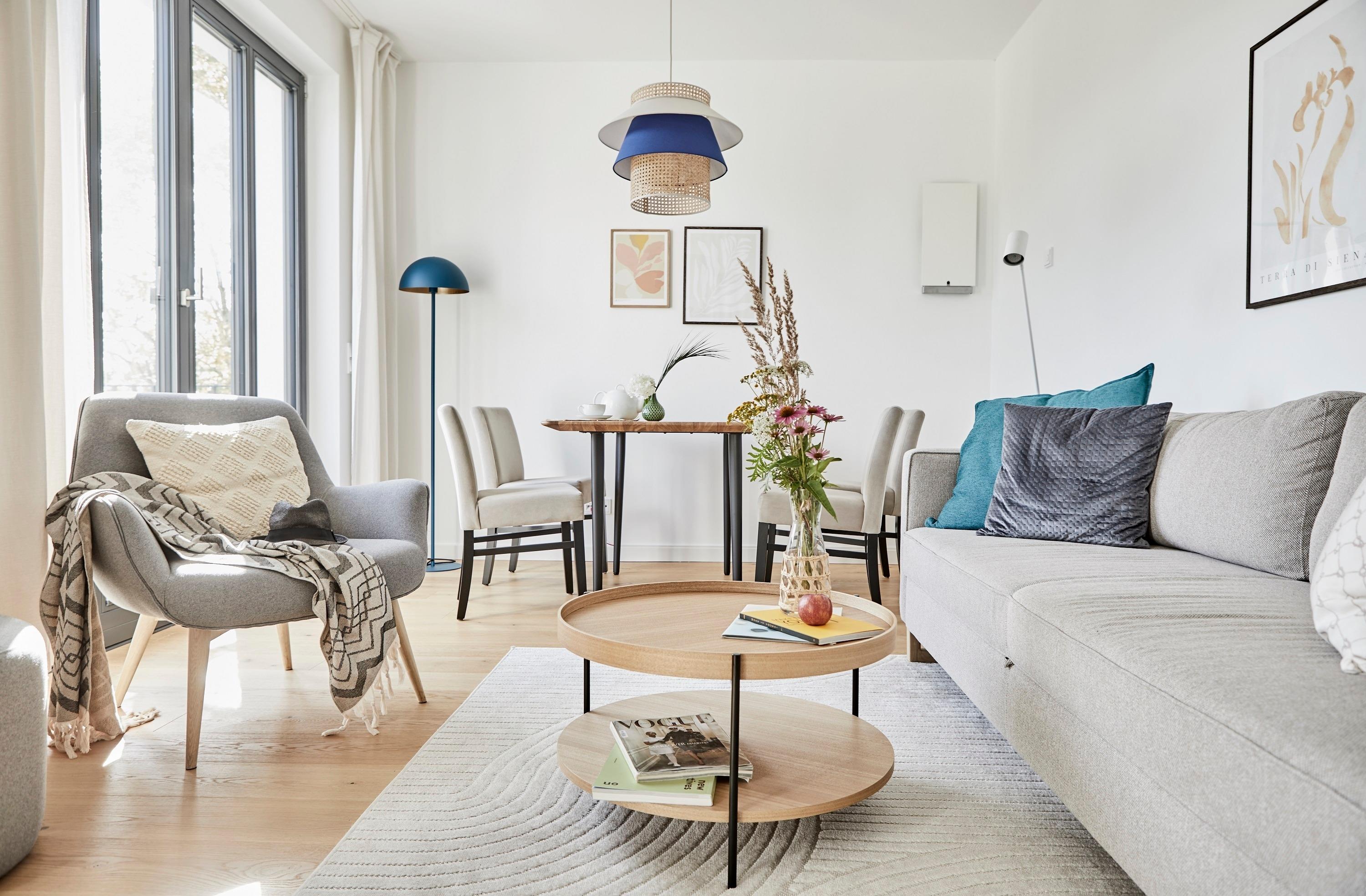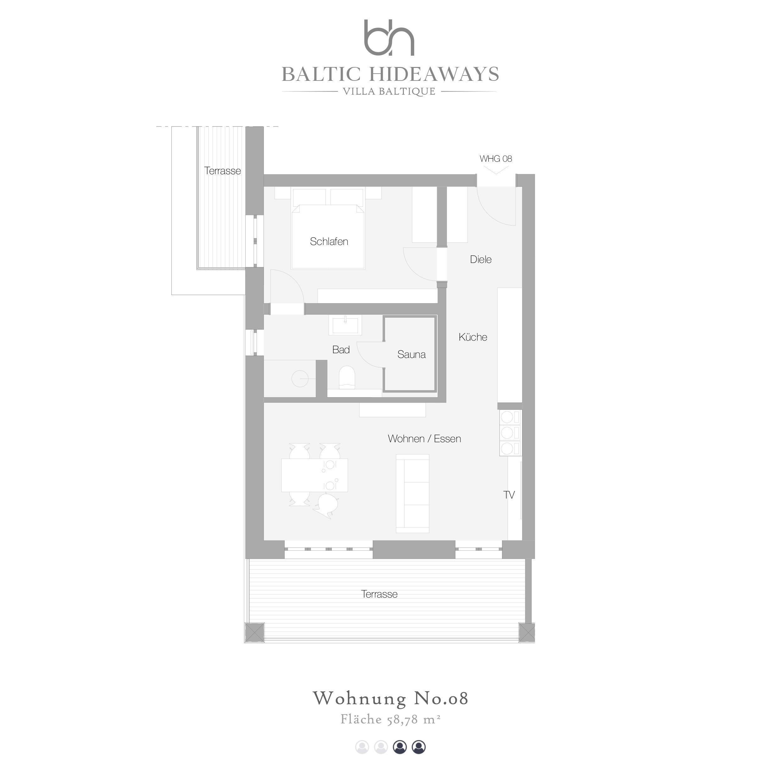 Moderne Ferienwohnung in Sellin mit privater Sauna, Kamin und zwei Balkonen für entspannte Urlaubstage.