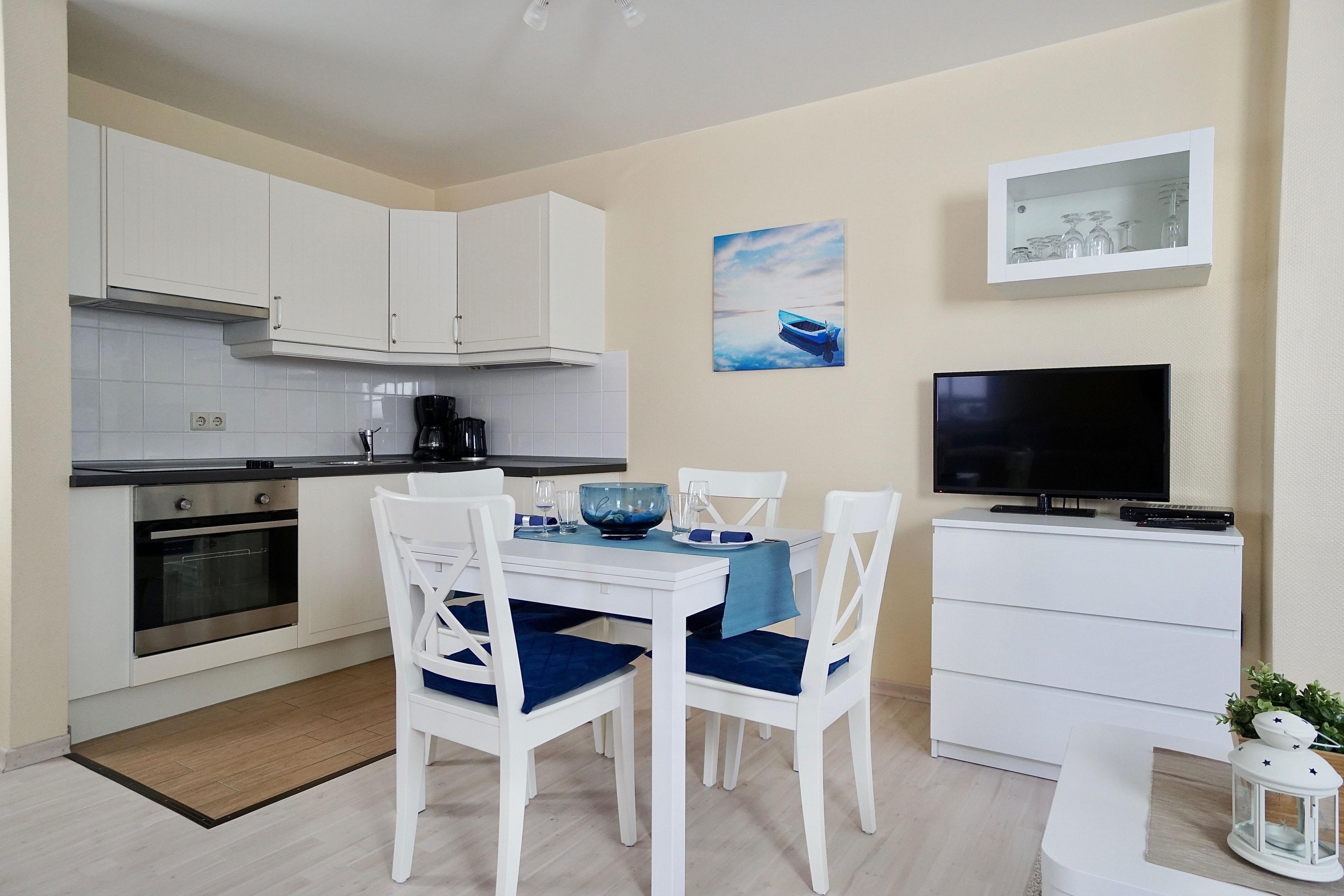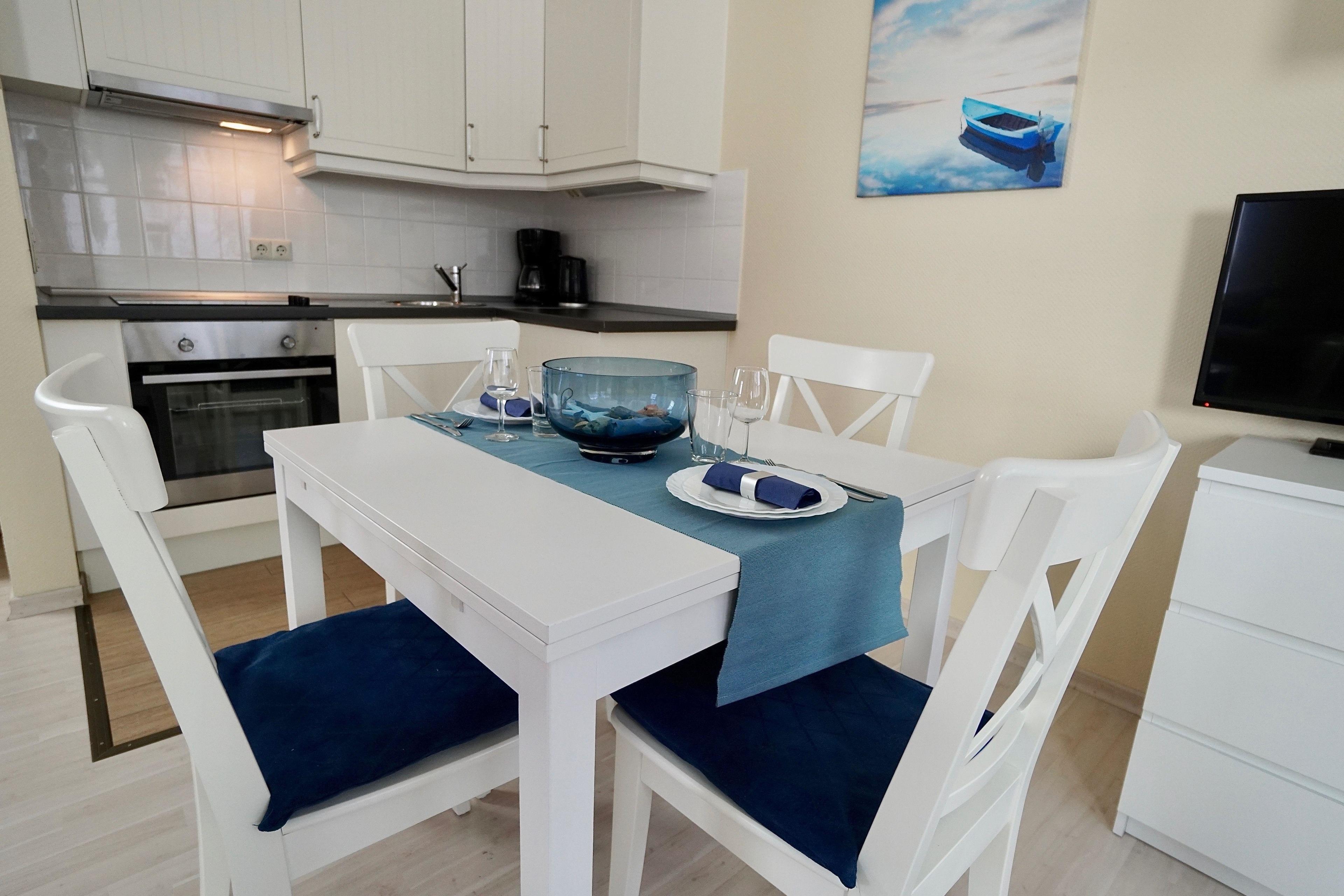 Sie haben hier die Möglichkeit sich in unserem Ferienappartement selbst zu versorgen. In der voll ausgestatteten Küchenzeile stehen Ihnen auch ein Backofen mit Ceranfeld zur Verfügung. Die selbst hergestellte köstliche Mahlzeit können Sie direkt nebenan an dem großzügigen Esstisch genießen.