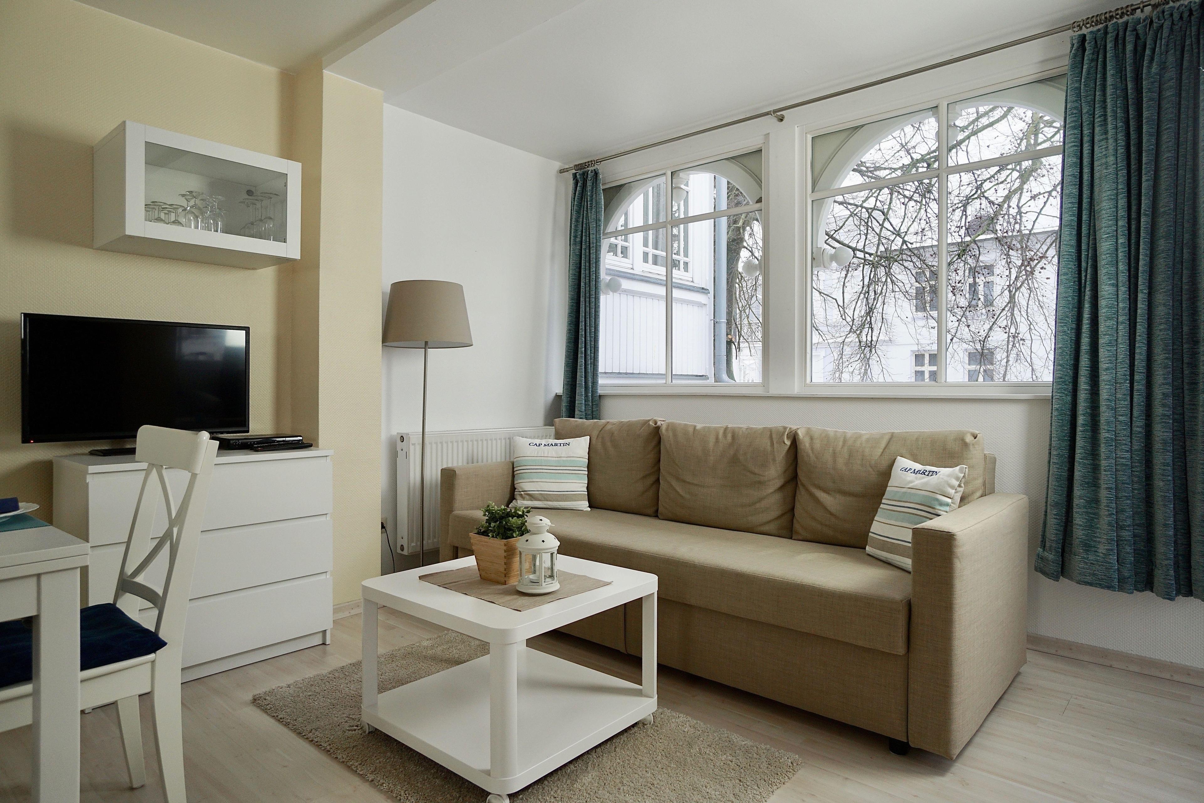 In diesem Komfort-Doppelzimmer des Typ Mönchgut bietet Ihnen ein großes Doppelbett eine perfekte Schlafmöglichkeit, um sich von einem erlebnisreichen Urlaubstag zu erholen. Zwei weitere Personen finden auf der komfortablen Schlafcouch ausreichend Platz zum Schlafen. Ob von der Couch aus oder vom Bett - lassen sich auch von dem Flachbild-Fernseher unterhalten, der Ihnen in diesem Appartement zur Verfügung steht.