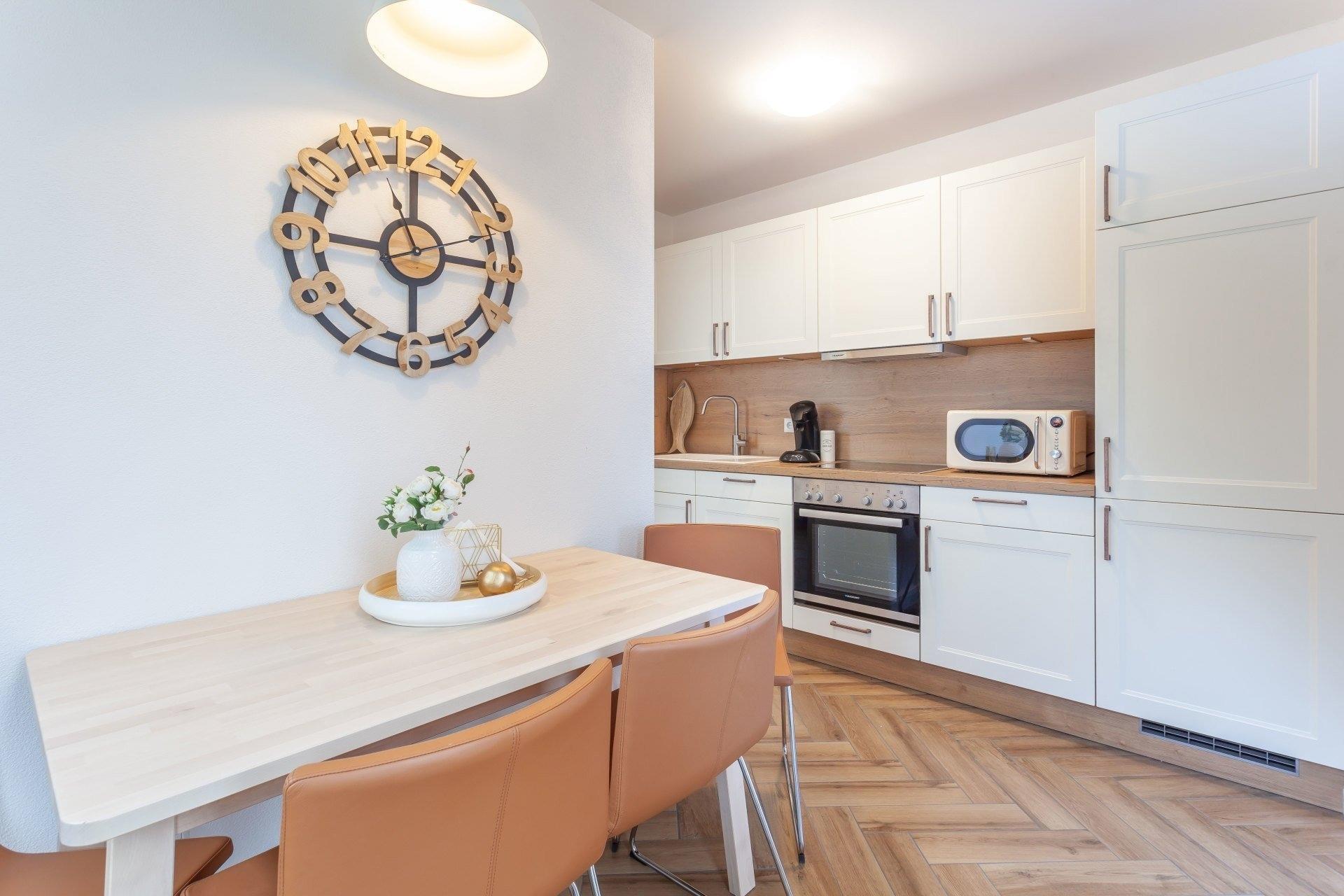 • Küchenbereich: voll ausgestattete Einbauküche mit Backofen, Spülmaschine, Kühlschrank, Wasserkocher, Toaster, Kaffeemaschine, Geschirr & Besteck