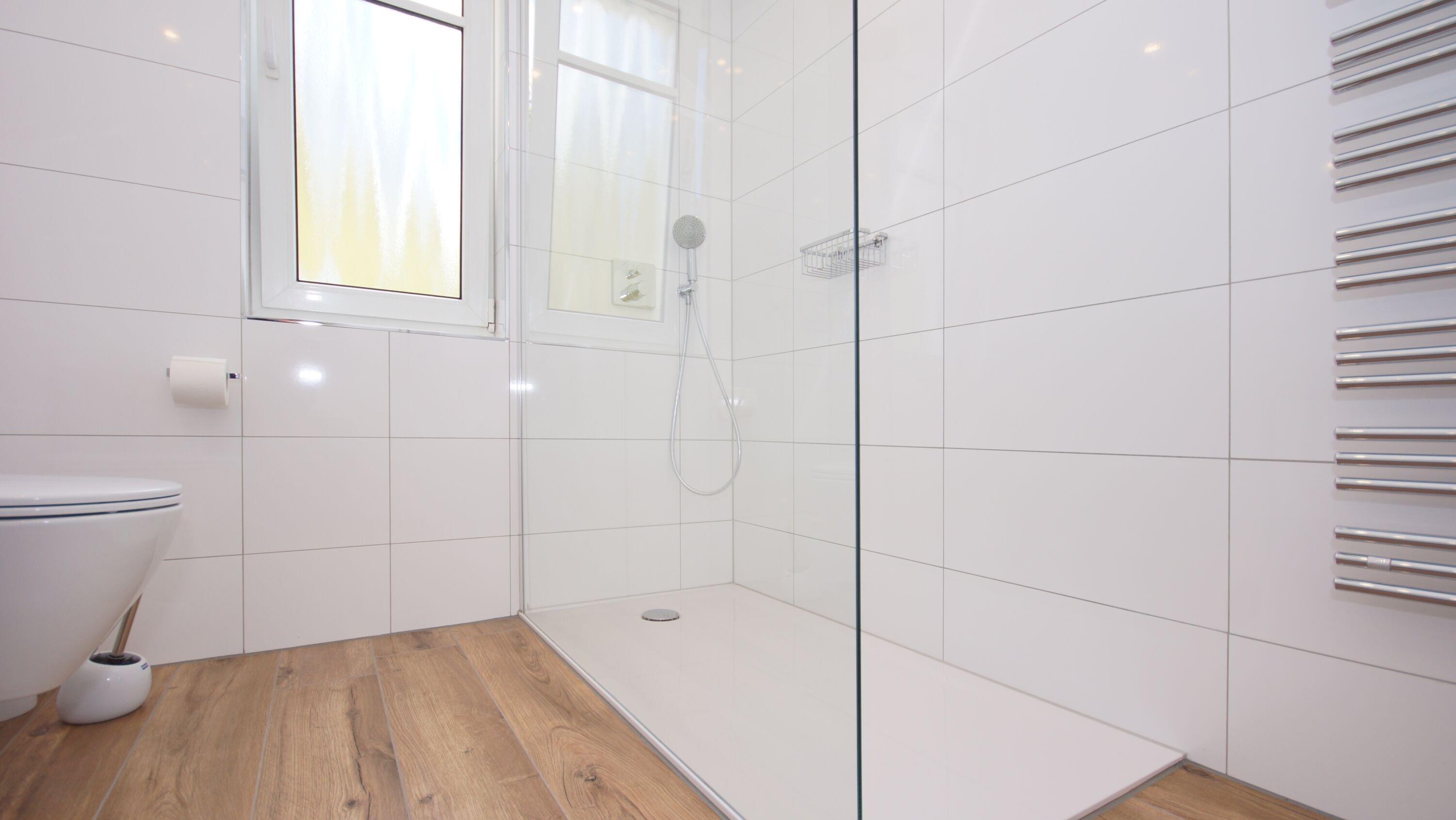 Das moderne Badezimmer ist mit einer Dusche, einem Waschbecken mit großem Spiegel und einer Toilette ausgestattet.