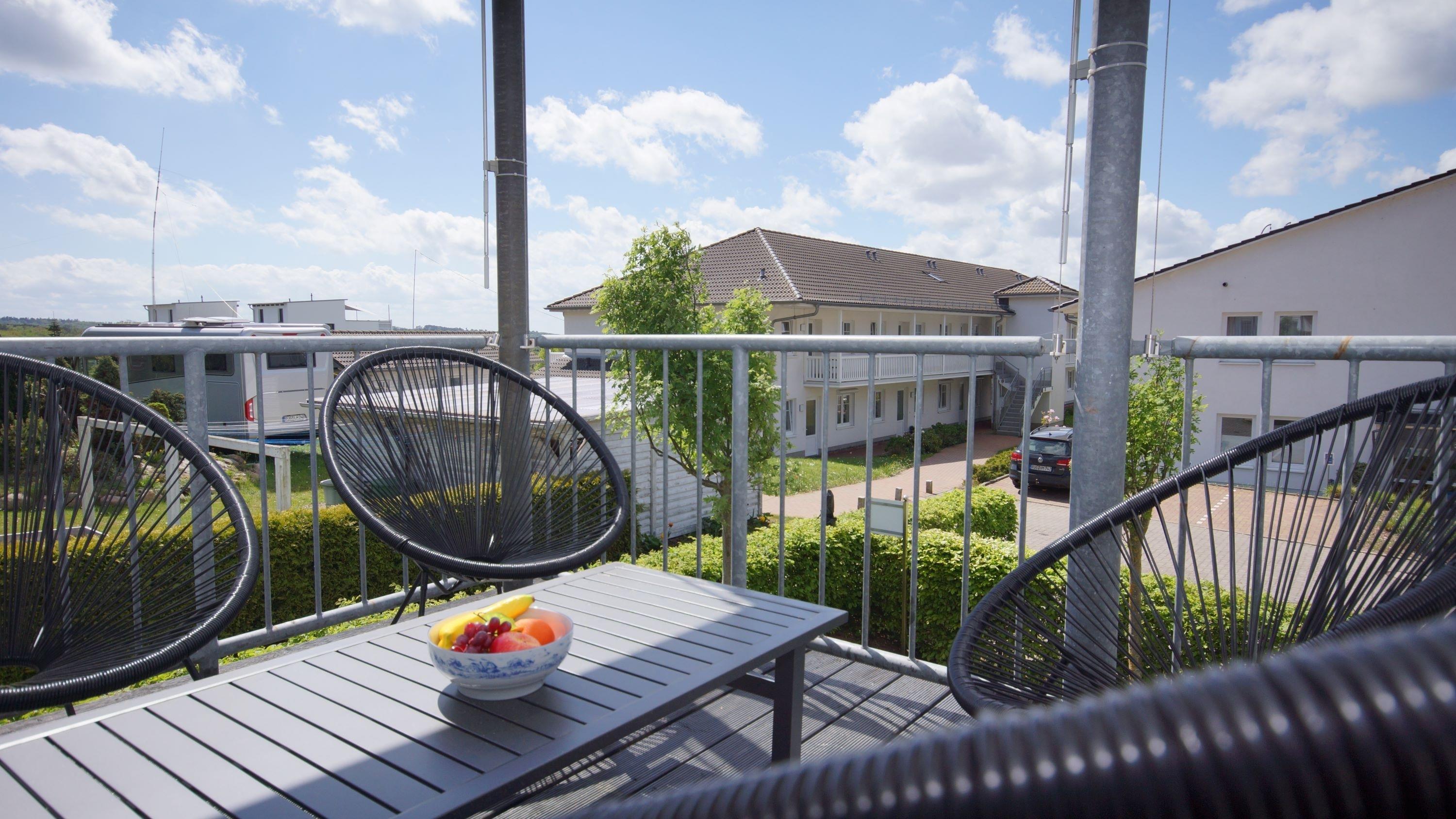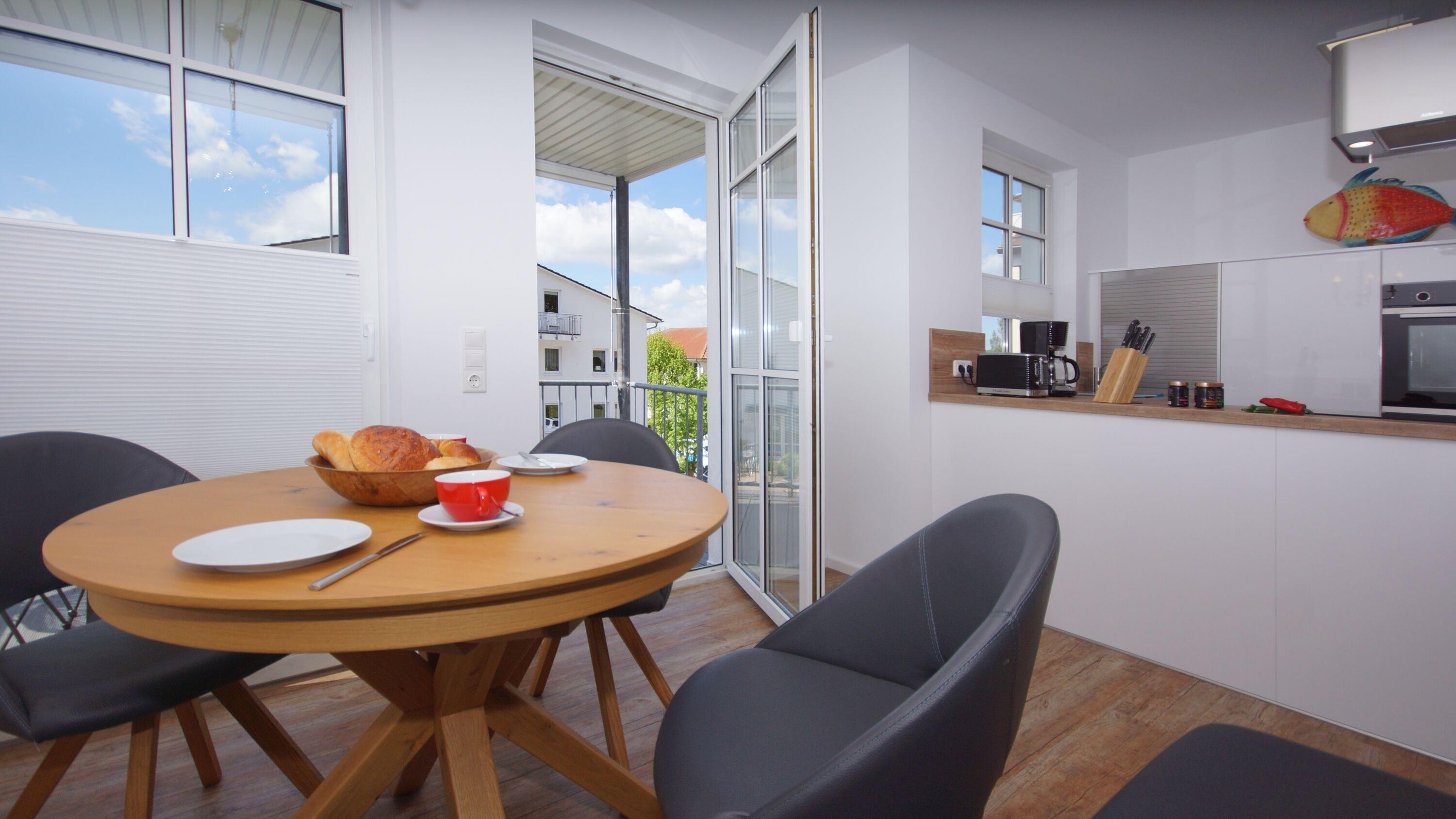 Von hier aus erreichen Sie den sonnigen Balkon. Die für Sie zur Verfügung gestellten komfortablen Gartenmöbel eignen sich zum Sonnenbaden oder für ein angenehmes Frühstück an der frischen Ostseeluft. Ausfahrbare Markisen sorgen für die nötige Privatsphäre.