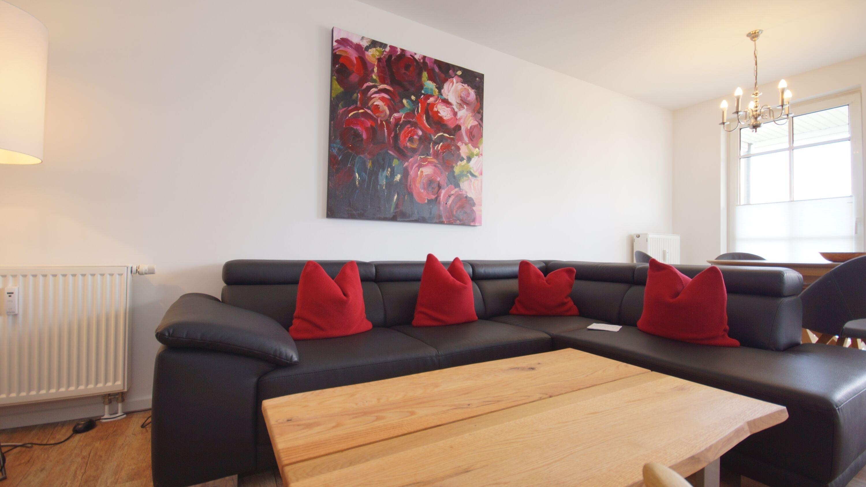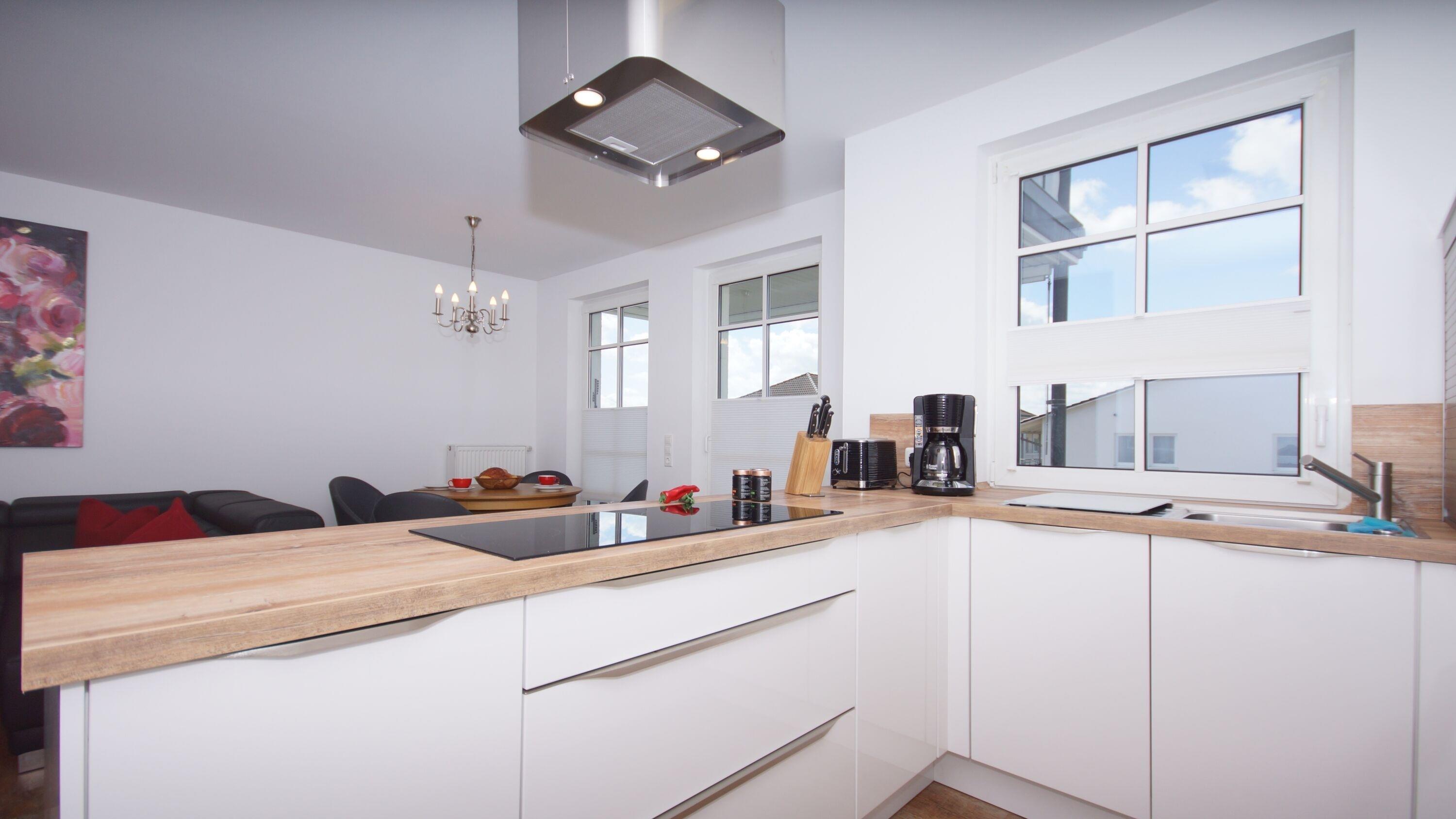 Auf 69 m² Wohnfläche können Sie Ihren Urlaub auf Rügen, egal zu welcher Jahreszeit, in vollen Zügen genießen. Das freundliche Wohn- und Esszimmer mit offener Küche überzeugt mit großen Fensterfronten und der modernen Sofagarnitur, die zu einem entspannten Tagesabschluss einlädt.