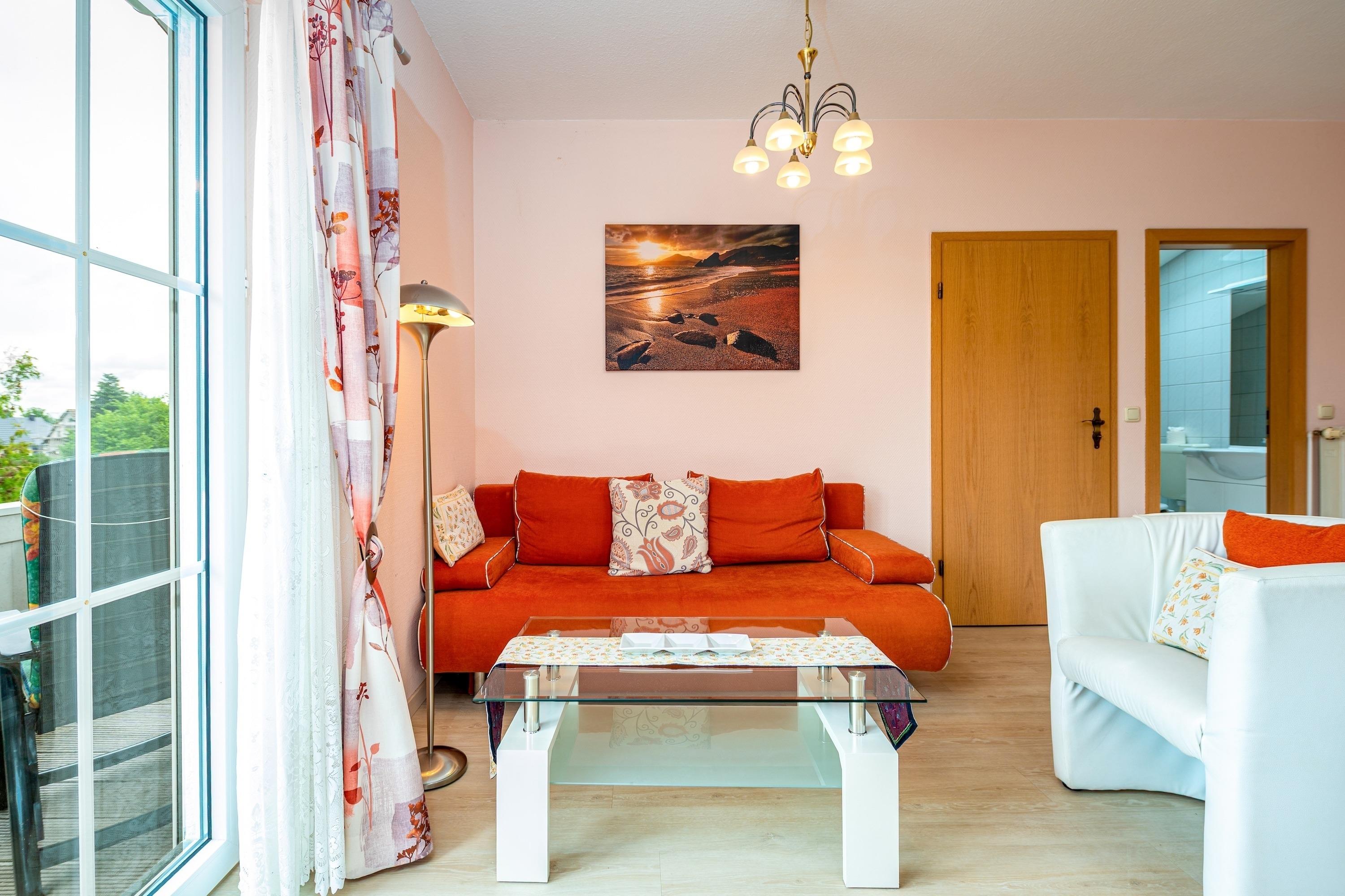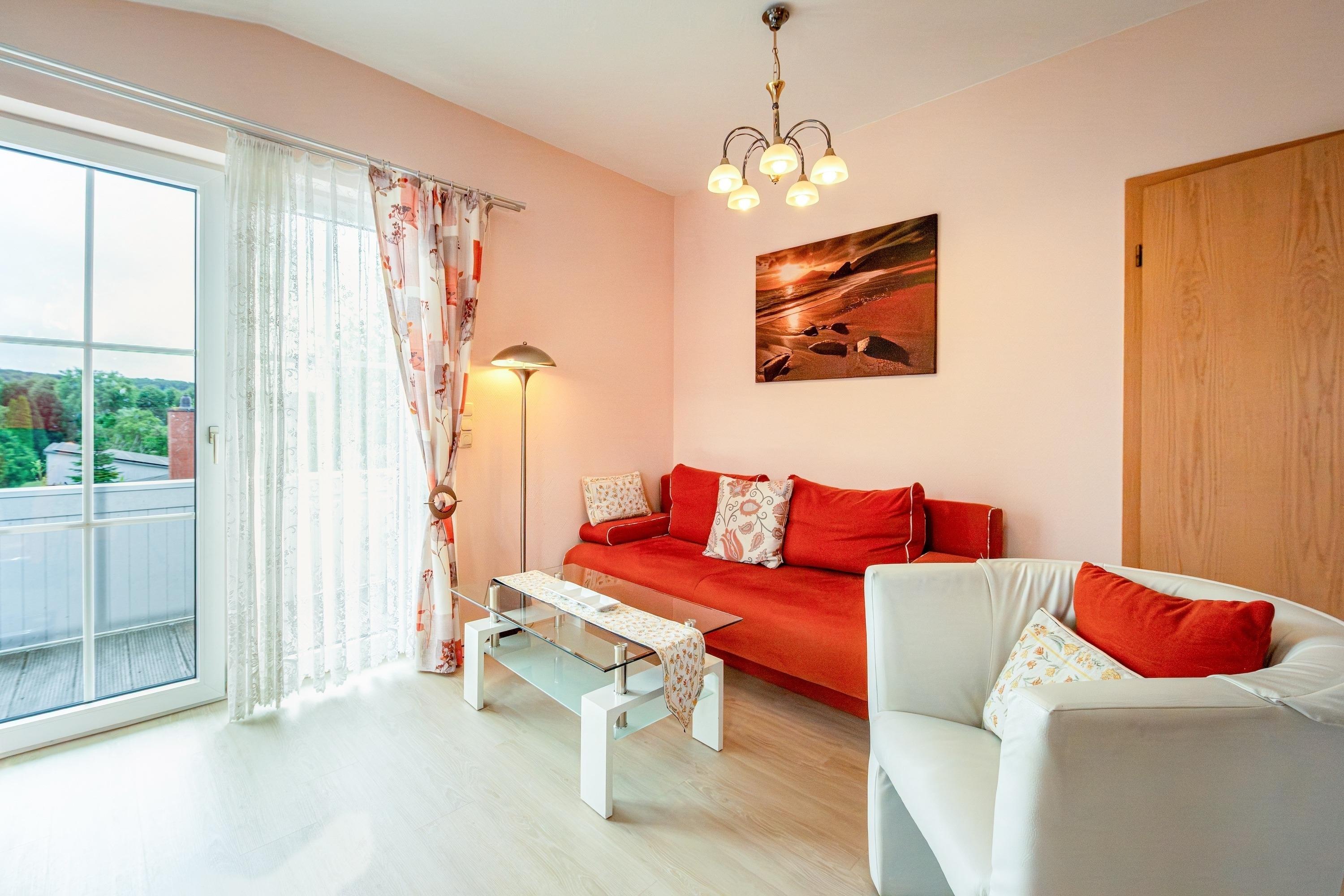 Charmante Ferienwohnung „Kranich“ in Sellin, 950 m vom Strand, mit Balkon, Sauna, Parkplatz und hundefreundlich.