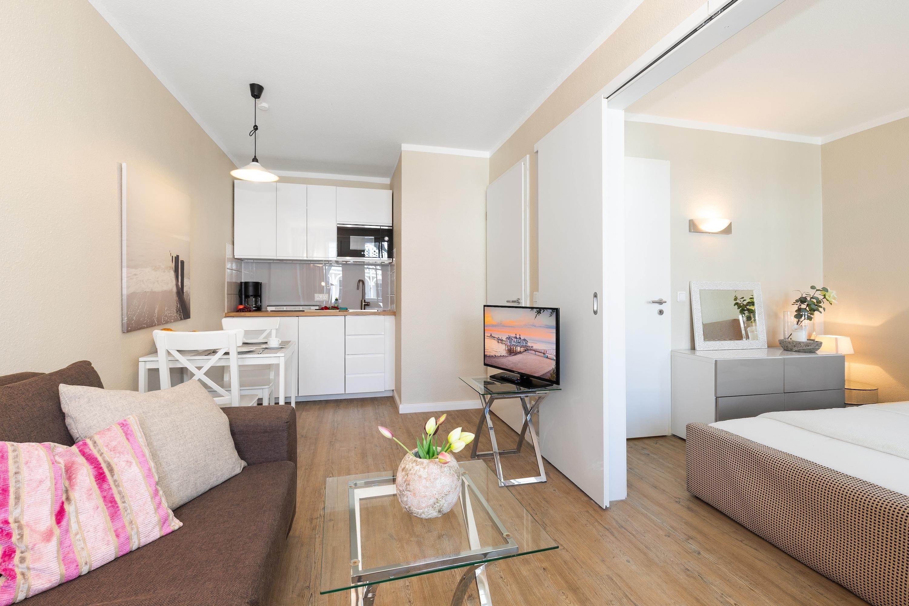 Die stilvoll eingerichtete Ferienwohnung „home sweet home“ (Nr. 668) bietet auf 32 m² alles, was Sie für eine entspannte Auszeit zu zweit brauchen. Sie befindet sich im zweiten Obergeschoss eines gepflegten Hauses und überzeugt mit ihrer wohnlichen Atmosphäre und liebevollen Details.