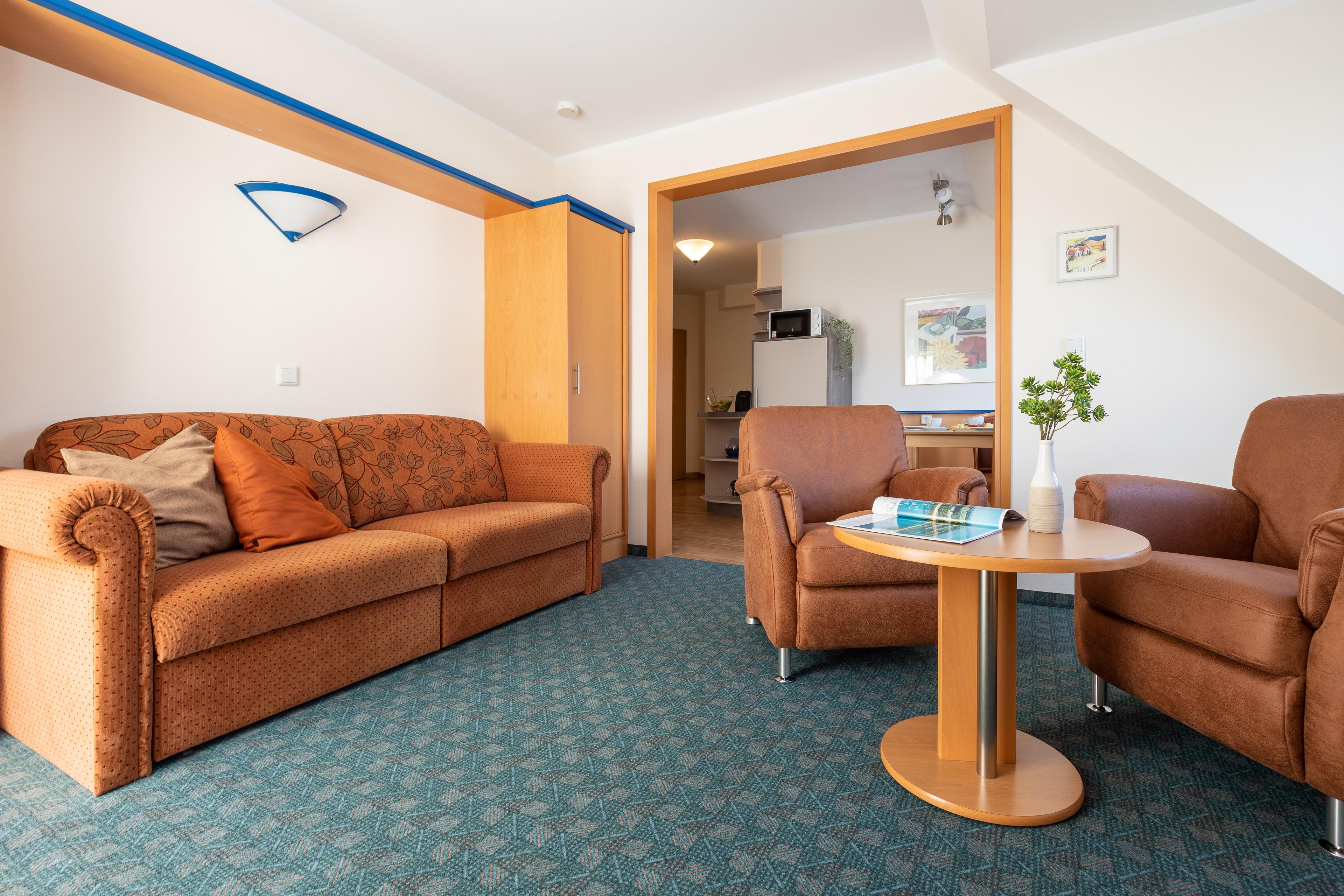 Das helle Wohnzimmer verfügt über eine Couchgarnitur, welche ebenso eine Aufbettung für 2 weitere Personen darstellt. Neben einem TV und einem kostenfreien WLAN-Zugang erreichen Sie von hier aus den sonnigen Balkon inkl. Balkonmöbel.