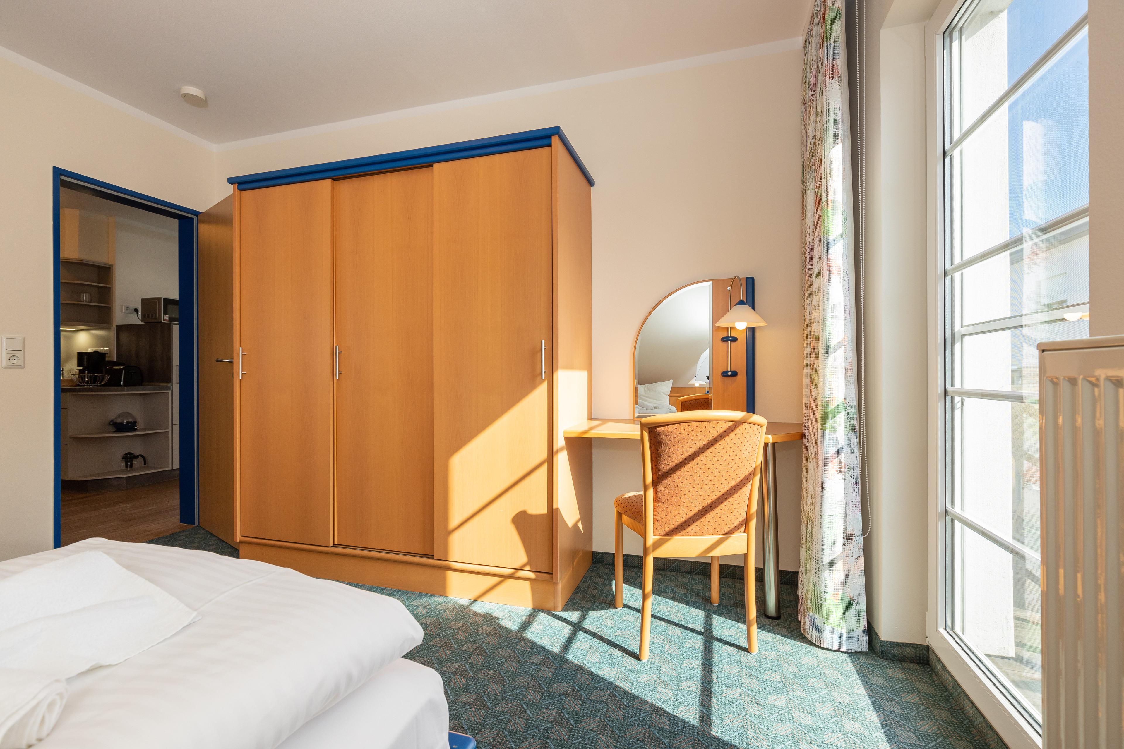 Im Schlafbereich steht ein komfortables Doppelbett, ein geräumiger Kleiderschrank und ein kleiner Schreibtisch bereit. Im Badezimmer mit Fenster befindet sich eine Dusche und ein WC.