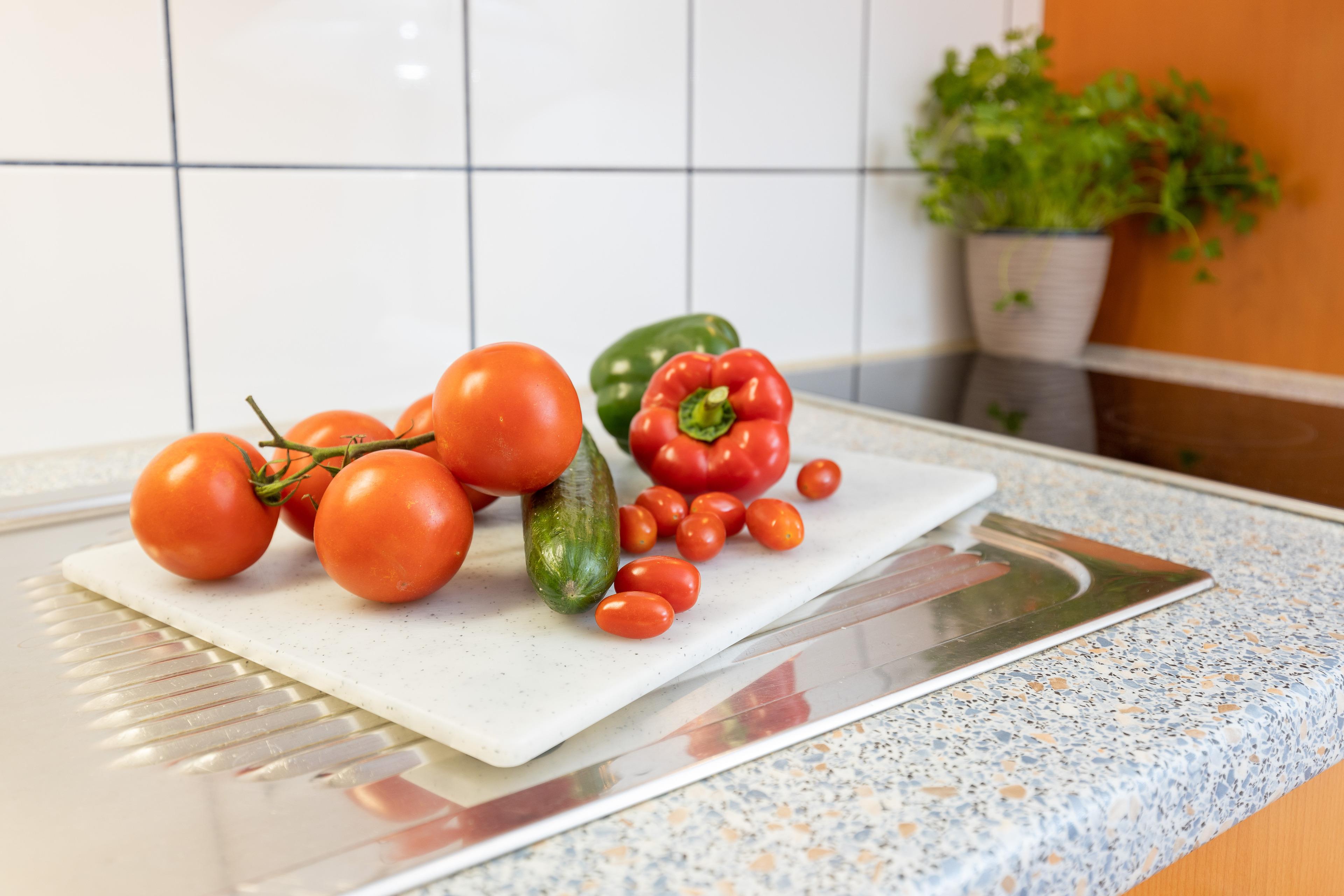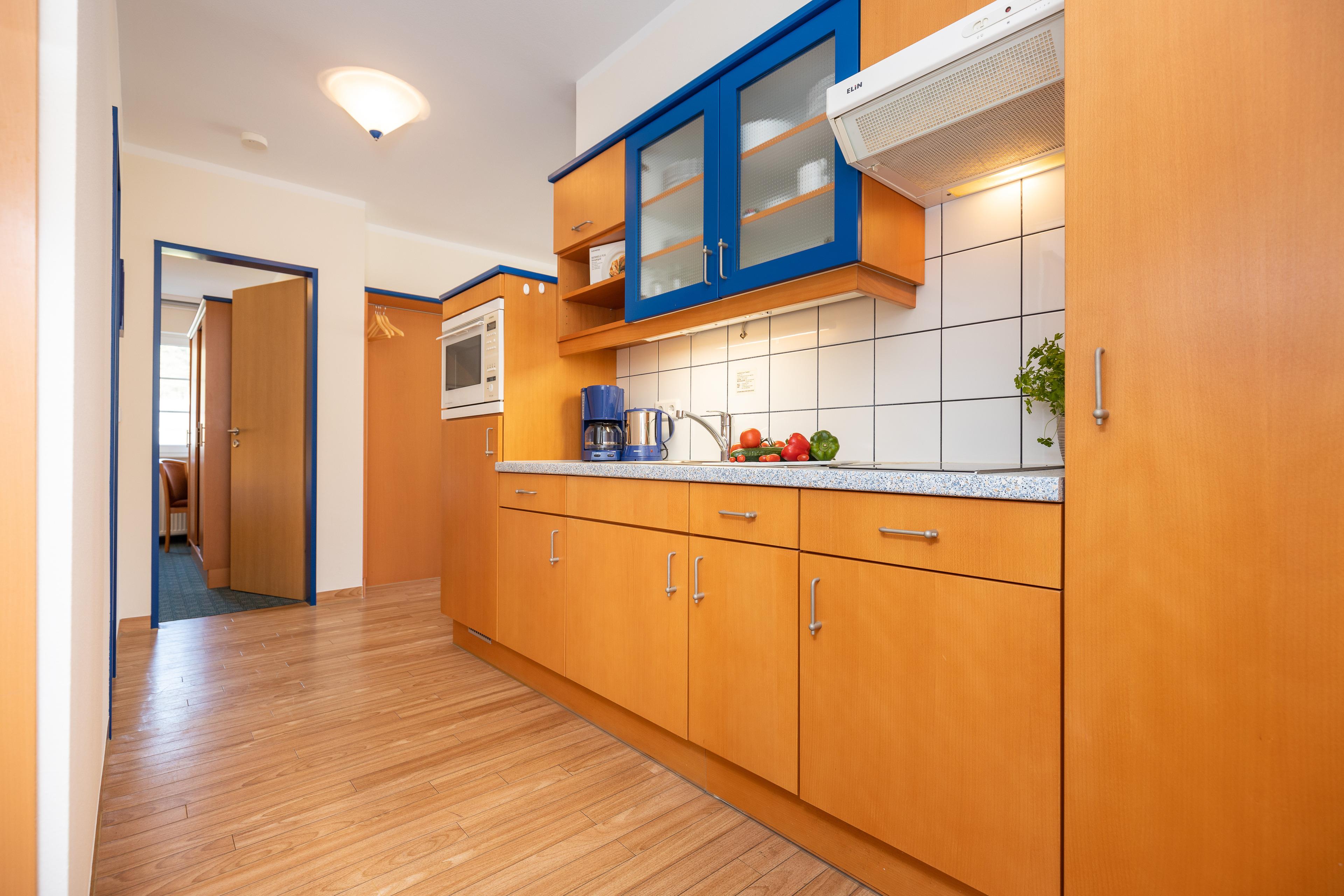 Die Küchenzeile ist mit einem Kühlschrank, einem Ceranfeld und einem Backofen/Mikrowelle ausgestattet. Ebenso finden sich hier alle nötigen Küchenkleingeräte (Wasserkocher, Kaffeemaschine, Toaster..).