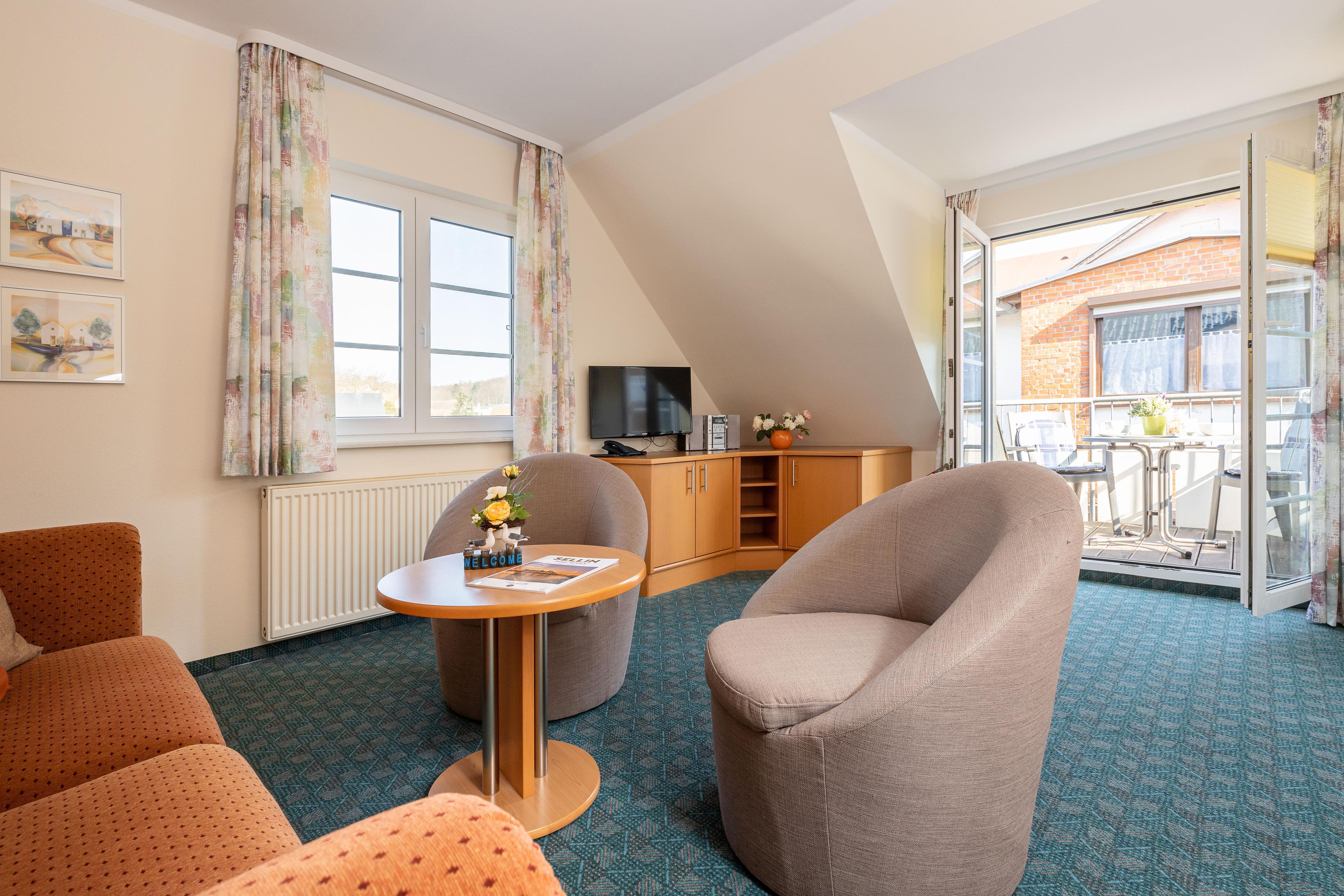 Das helle Wohnzimmer verfügt über eine Couchgarnitur, einen TV und einen kostenfreien WLAN-Zugang. Zudem erreicht man von hier aus den sonnigen Balkon inkl. Balkonmöbel.
