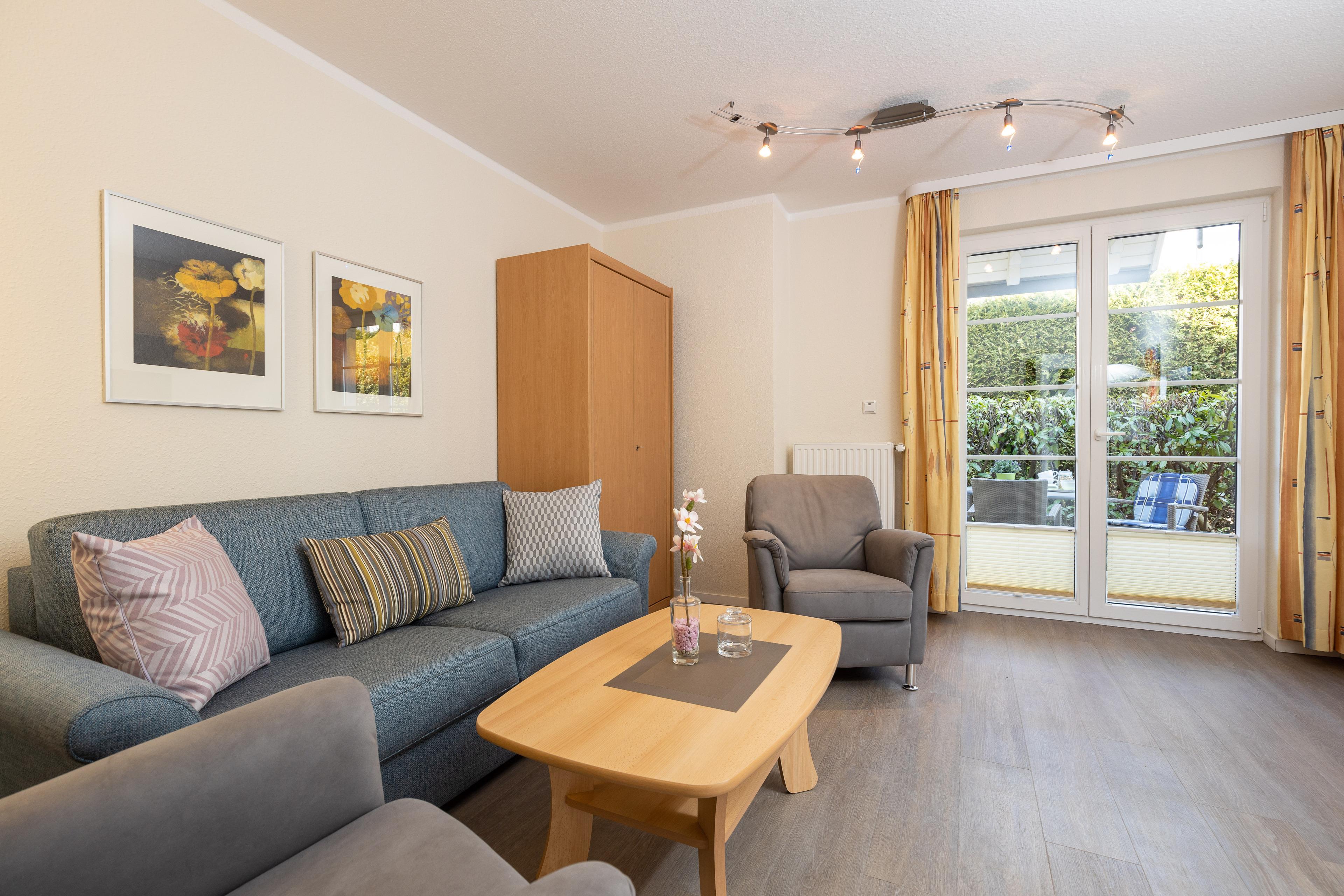 Das helle Wohnzimmer verfügt über eine Couchgarnitur, welche ebenso eine Aufbettung für 2 weitere Personen darstellt. Neben einem TV und einem kostenfreien WLAN-Zugang erreichen Sie von hier aus die sonnige Terrasse inkl. Terrassenmöbel.