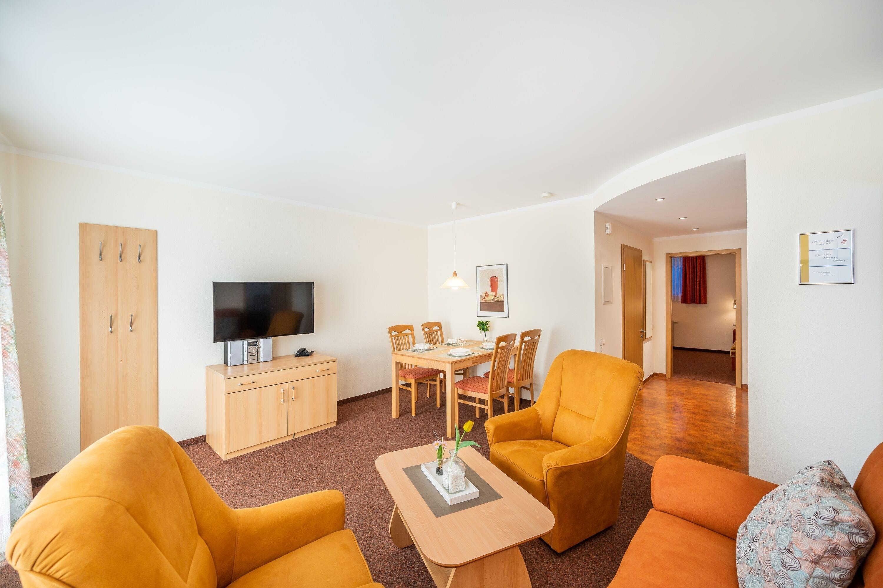 Das helle Wohnzimmer verfügt über eine Couchgarnitur, einen TV und einen kostenfreien WLAN-Zugang. Zudem erreichen Sie von hier aus die sonnige Terrasse inkl. Terrassenmöbel.
