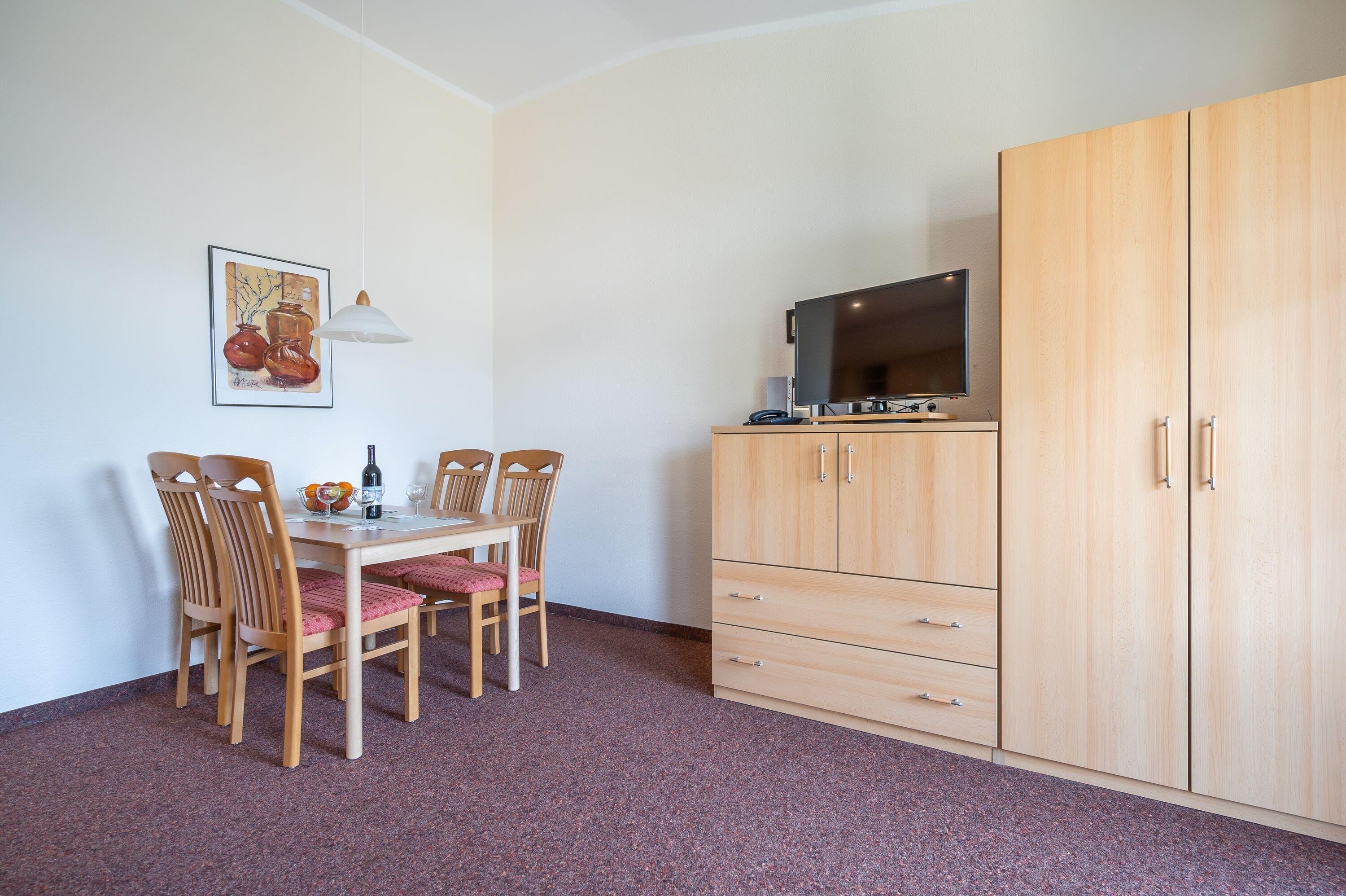 Das helle Wohnzimmer verfügt über eine Couchgarnitur, welche ebenso eine Aufbettung für 2 weitere Personen darstellt. Neben einem TV und einem kostenfreien WLAN-Zugang erreichen Sie von hier aus den sonnigen Balkon inkl. Balkonmöbel.